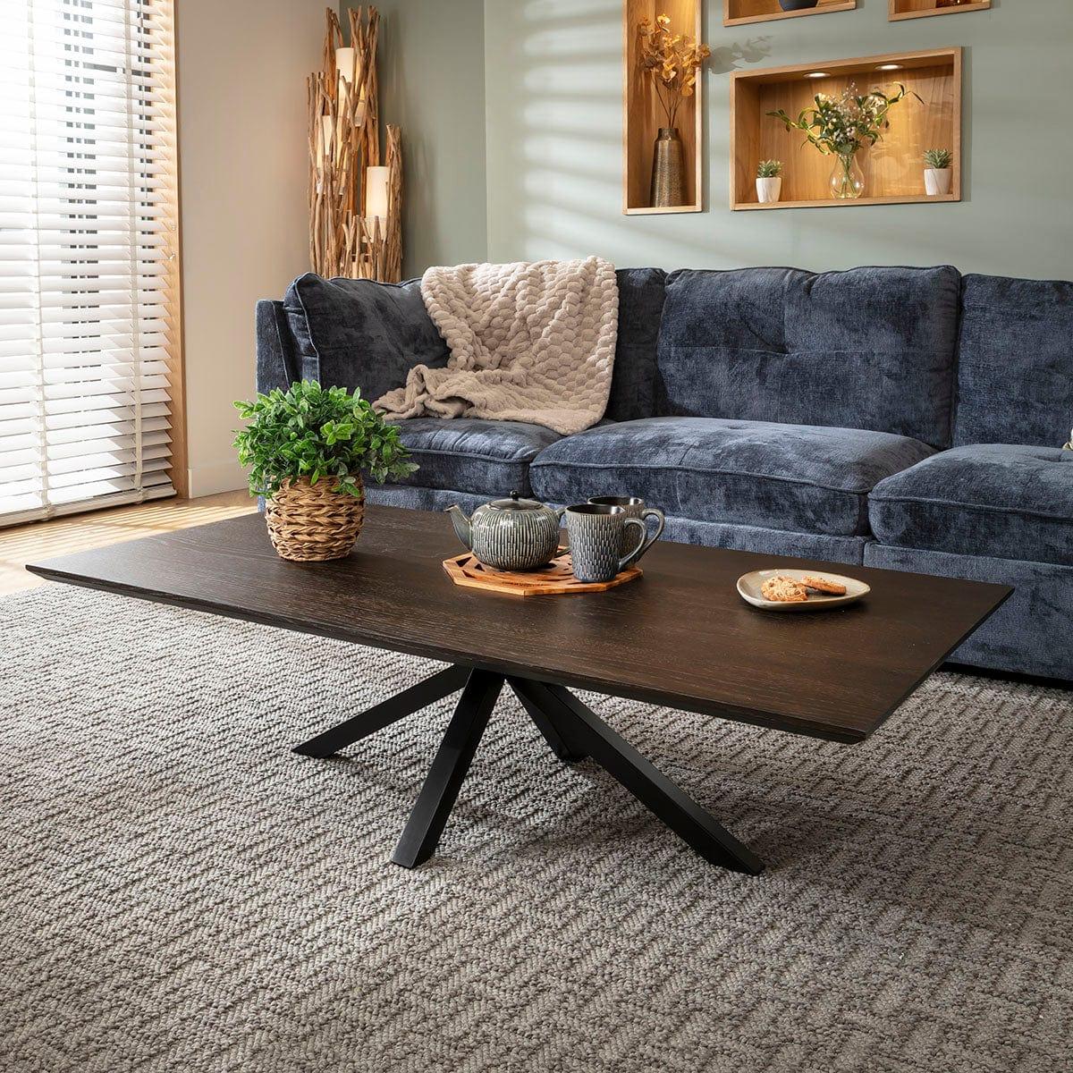 This modern wooden coffee table combines striking aesthetics with practicality, making it an ideal centrepiece for contemporary interiors. Crafted as a rectangular coffee table with premium materials, it balances bold design with everyday function. Featuring a dark wooden top, star-shaped legs, and generous dimensions, this wooden coffee table enhances any living space. Measuring 140cm x 75cm, this modern coffee table offers a super spacious surface for entertaining or relaxing. Its dark wooden top contrasts beautifully with the bold star-leg design, creating a clean, minimalist look. Strong lines and a modern aesthetic define its character, while the wider Grado collection offers matching furniture options. Constructed from quality materials, this rectangular coffee table blends durability with luxury. The dark wooden top features a premium oak veneer with a tactile grain for a sophisticated touch. Supporting this surface, sturdy metal legs with a black painted finish provide long-lasting stability while elevating the overall modern wooden coffee table style. W140cm D75cm H38cm Dark Oak Veneer Supplied preassembled, you’ll simply attach the legs