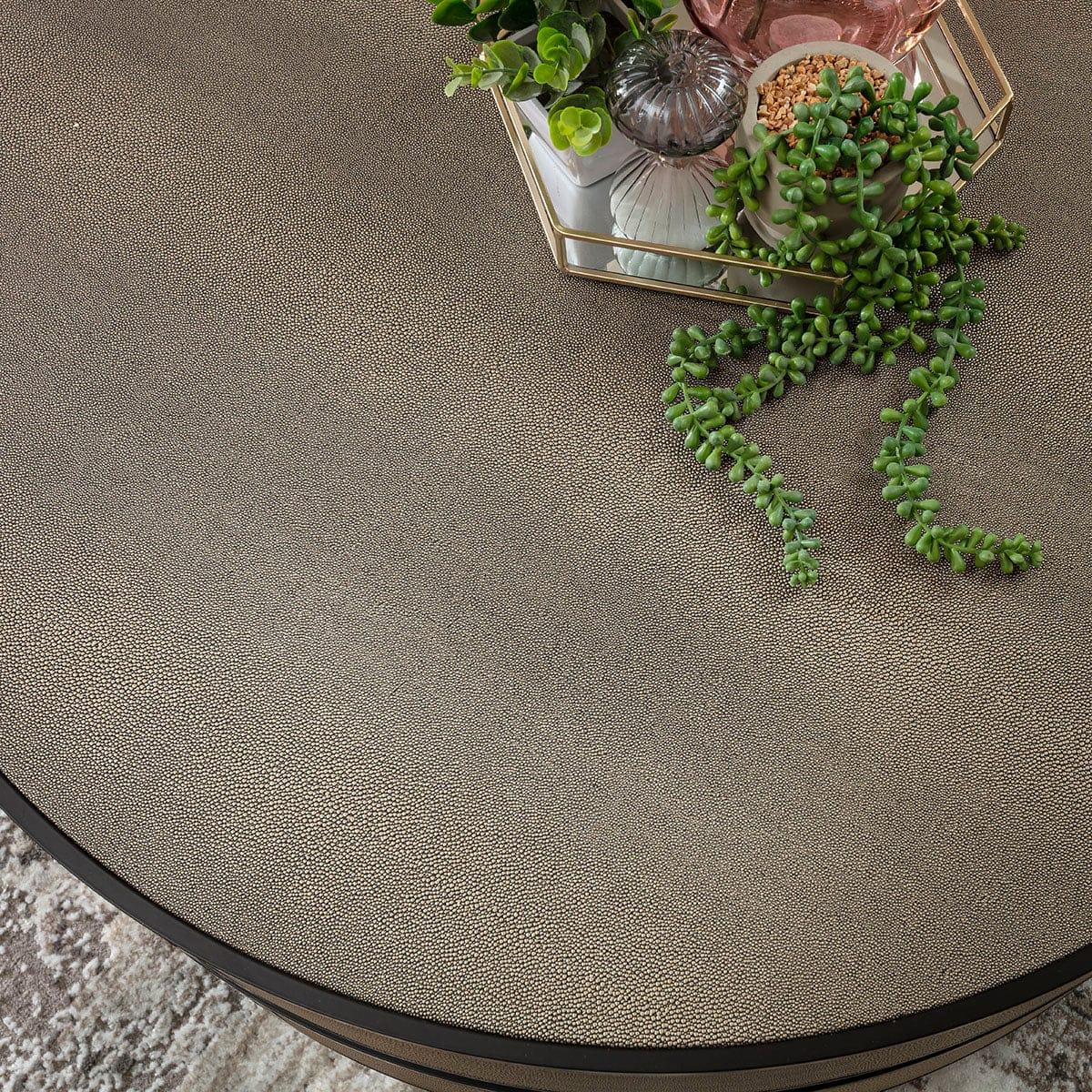 Elevate your living space with this modern round coffee table, a designer round coffee table featuring a luxurious black and gold colour palette. Its 92cm surface and 36cm height provide spacious, low-profile functionality. Crafted from premium shagreen faux leather, this gold coffee table combines tactile elegance with superior build quality. This round coffee table showcases a striking black frame with gold leather inlay, creating a sophisticated, contemporary statement. It offers ample surface space while maintaining a low-profile stance. The luxurious colour palette and tactile finish deliver both visual appeal and a refined touch. Constructed with premium shagreen faux leather, this shagreen coffee table exemplifies high-end craftsmanship. Sourced from a trusted designer furniture supplier, its build quality ensures durability and lasting style. Every detail is carefully finished, highlighting the gold accents and creating a polished, premium aesthetic that complements modern interiors. W92cm D92cm H36cm Shagreen PU Matching side table available