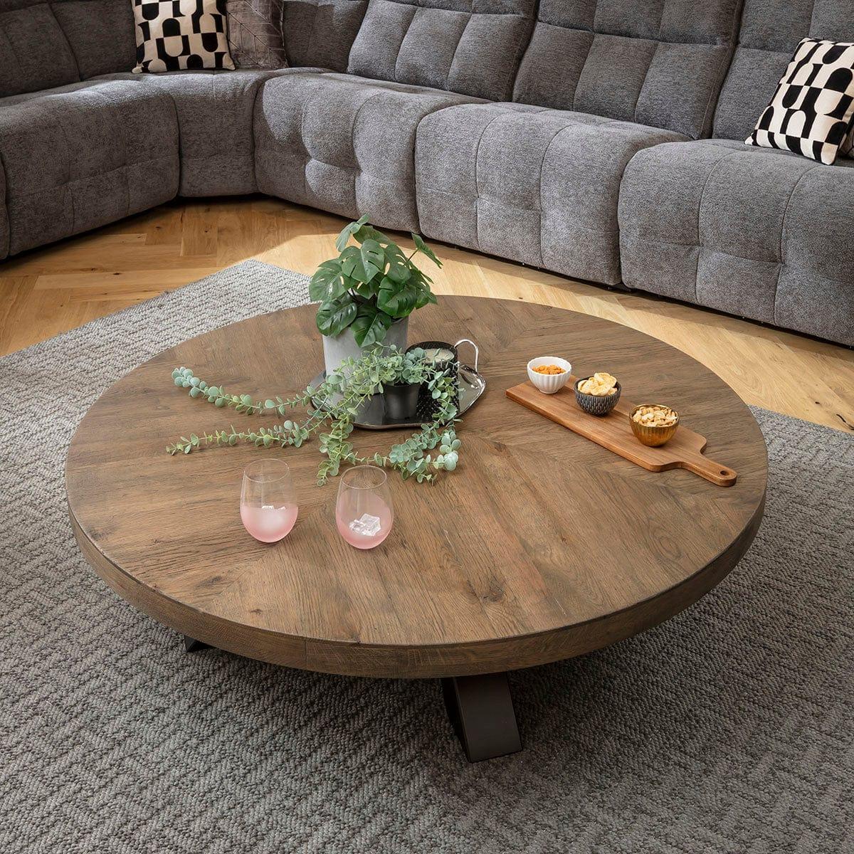 This industrial coffee table combines reclaimed oak craftsmanship with bold modern styling. Designed as a large round coffee table, it balances rustic warmth and industrial strength. The chunky oak coffee table top, deep tactile grain, and sturdy metal base create a dark wood coffee table that stands out among rustic coffee tables. A striking round wood coffee table with a robust, reclaimed oak surface, finished in a rich rustic brown tone. The wood is deeply grained for a tactile, natural feel, while the black painted metal legs emphasise its industrial design. Bold, modern, and substantial, this reclaimed wood coffee table is a true statement piece. At 130cm across, this wooden coffee table provides an impressively spacious surface for entertaining or display. Standing 40cm high, its proportions make it ideal as a central feature in an industrial living room. Substantial in weight and construction, this round coffee table offers both function and enduring strength in one exceptional design. W130cm D130cm H40cm Reclaimed oak tabletop Black metal legs