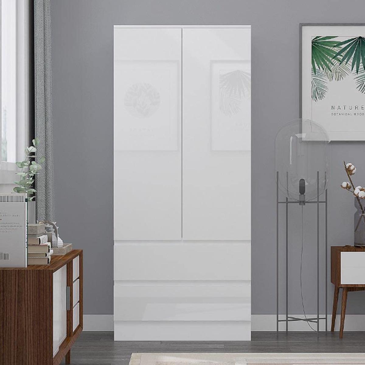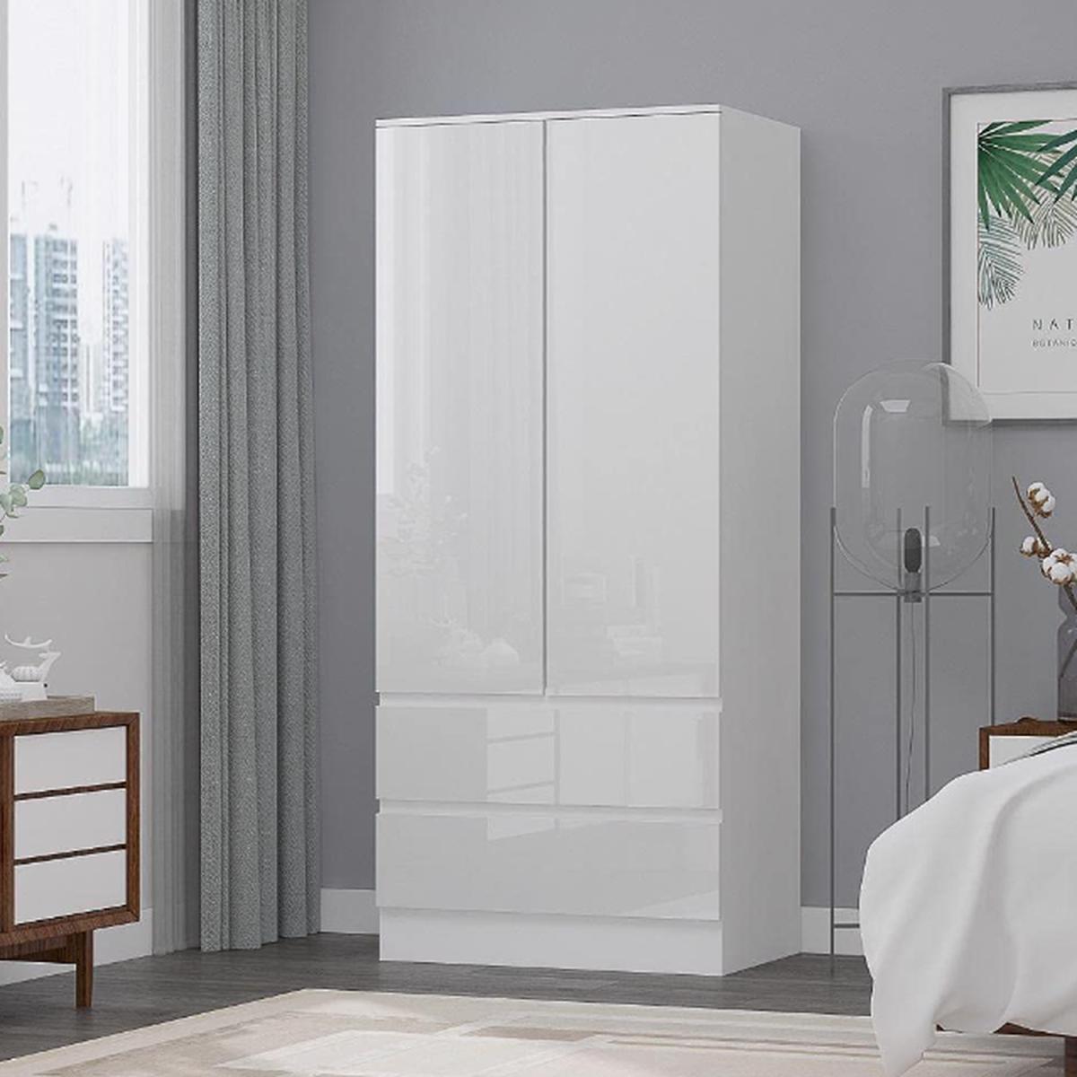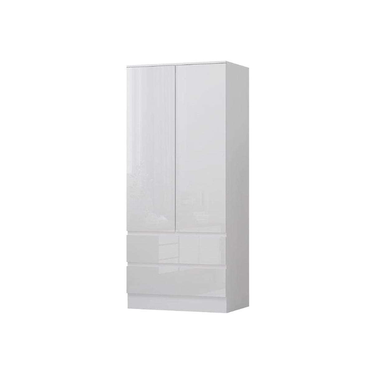 Modern Scandinavian Wardrobe 2 Door 2 Drawer White Gloss No Handles - White Gloss