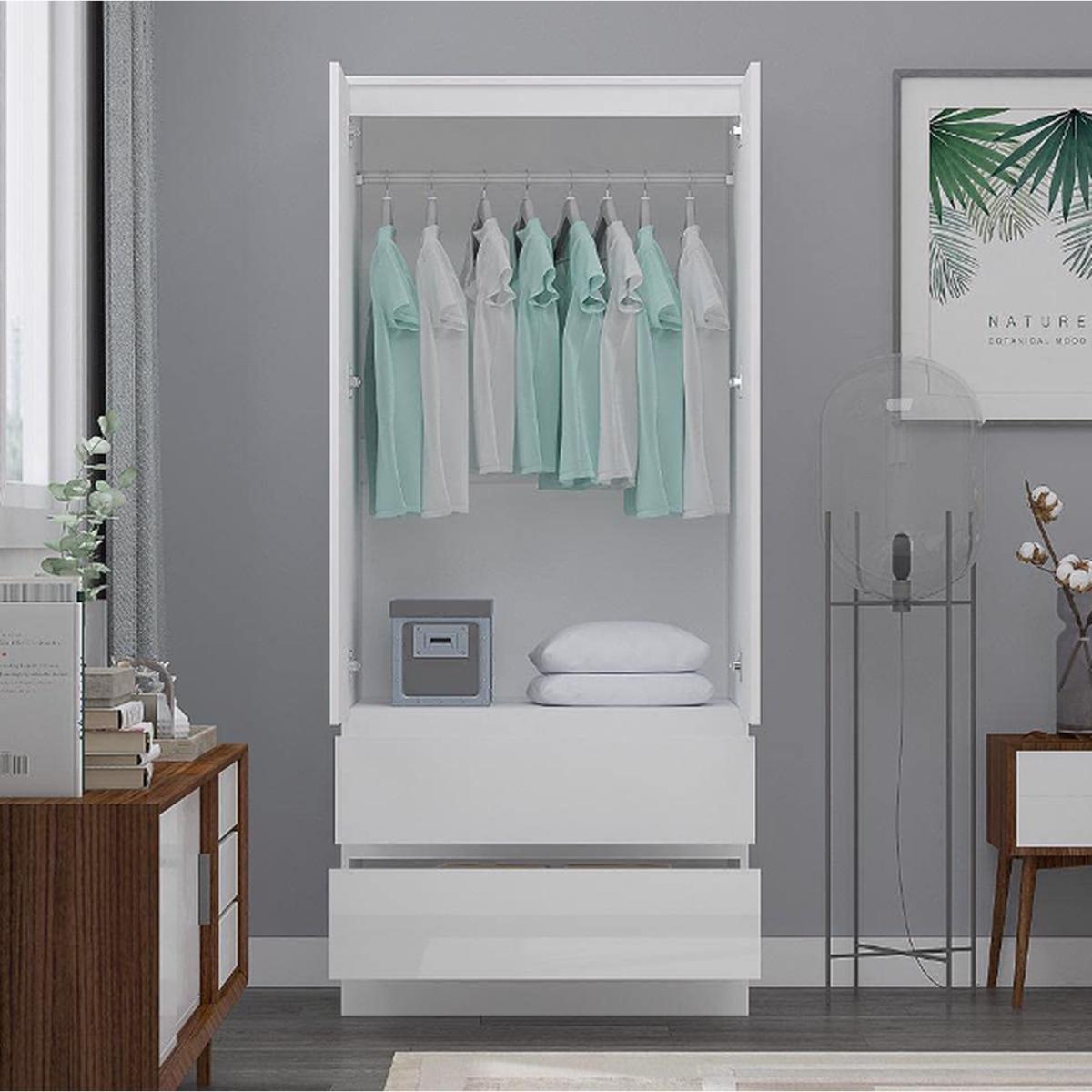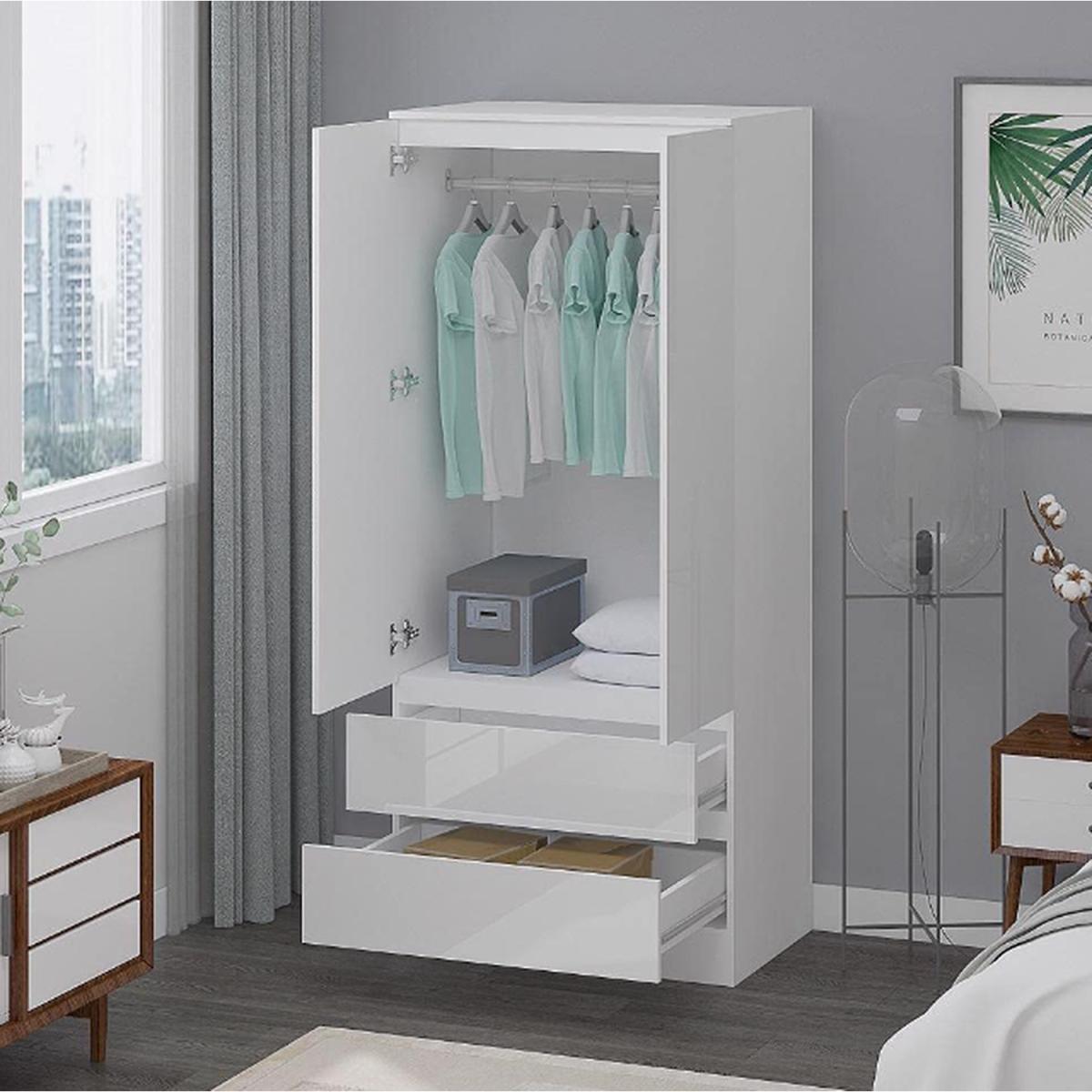 This crisp white wardrobe has 2 doors above 2 full width drawers. Behind the 2 Doors is a metal hanging rail. Delivered flat-packed for Home Assembly. Once assembled - this Combination Wardrobe measures : W 76 x D 50 x H 181cm.