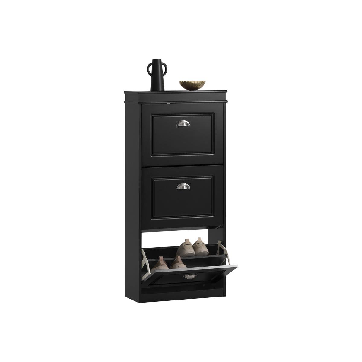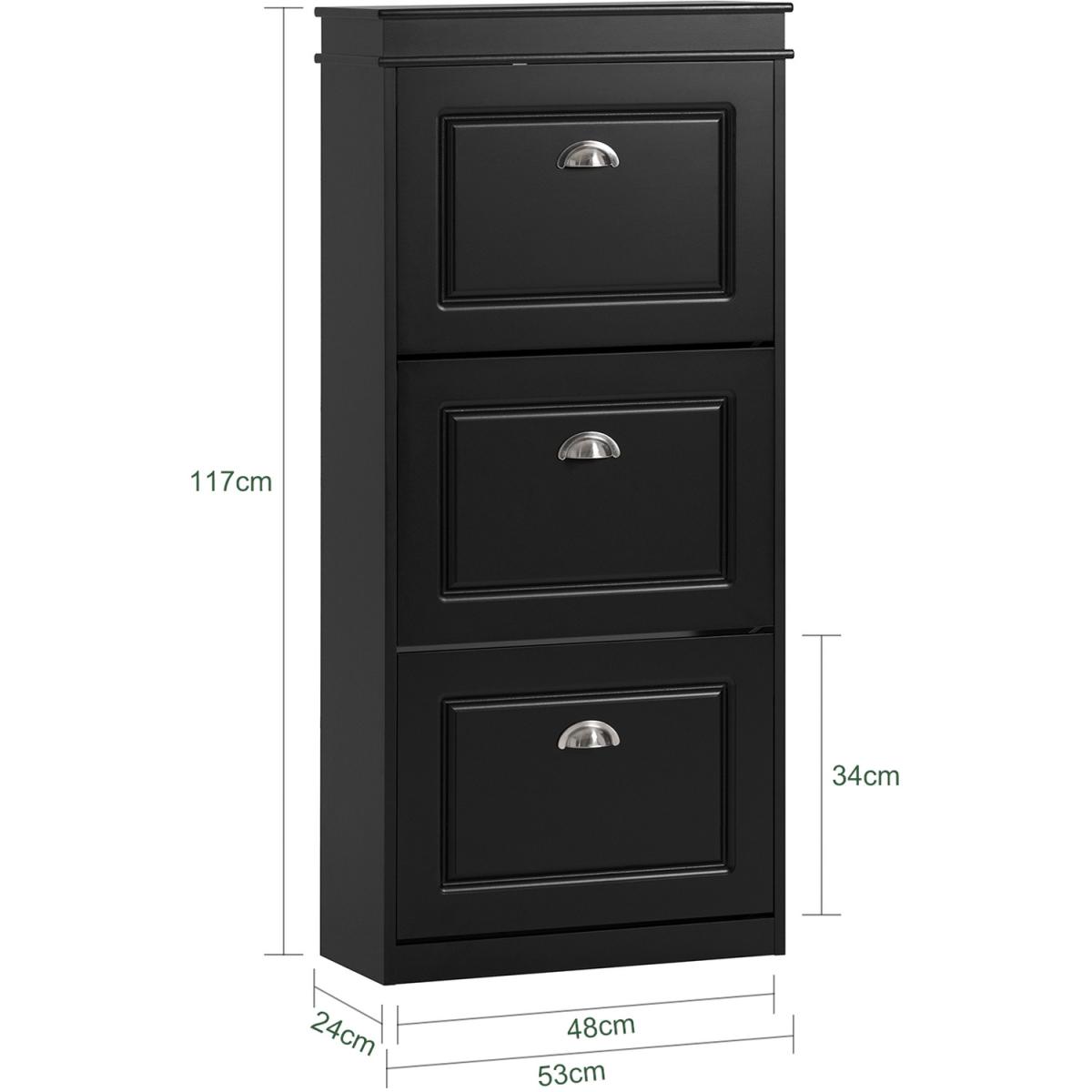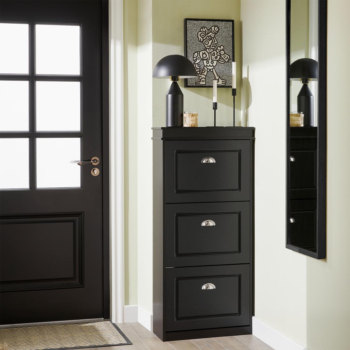 With the 3 flaps you can store a wide range of shoes in different sizes and designs.24cm in depth, the shoe cabinet is narrow enough to fit even in a small corridor. The sturdy construction gives the cabinet a secure stand, and you can attach it to the wall with a tilt protection, which increases stability. Item comes in a flat pack and requires self-assembly. Detailed instructions supplied.