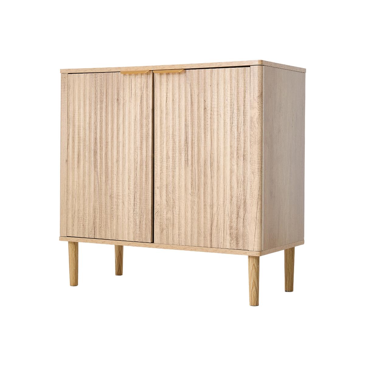 Designed with both elegance and purpose, this sideboard offers reliable everyday storage. Made from high-quality PB board with a moisture-resistant, scratch-proof melamine finish, it is built to last. The double doors open to reveal two generous shelves, giving you easy, spacious access for organised living. Solid wood legs provide secure support, while the raised base makes floor cleaning simple and helps shield the cabinet from dust and damp. An anti-tip device is also included for added peace of mind. Stylish yet functional, this piece brings smart, modern storage to any contemporary home