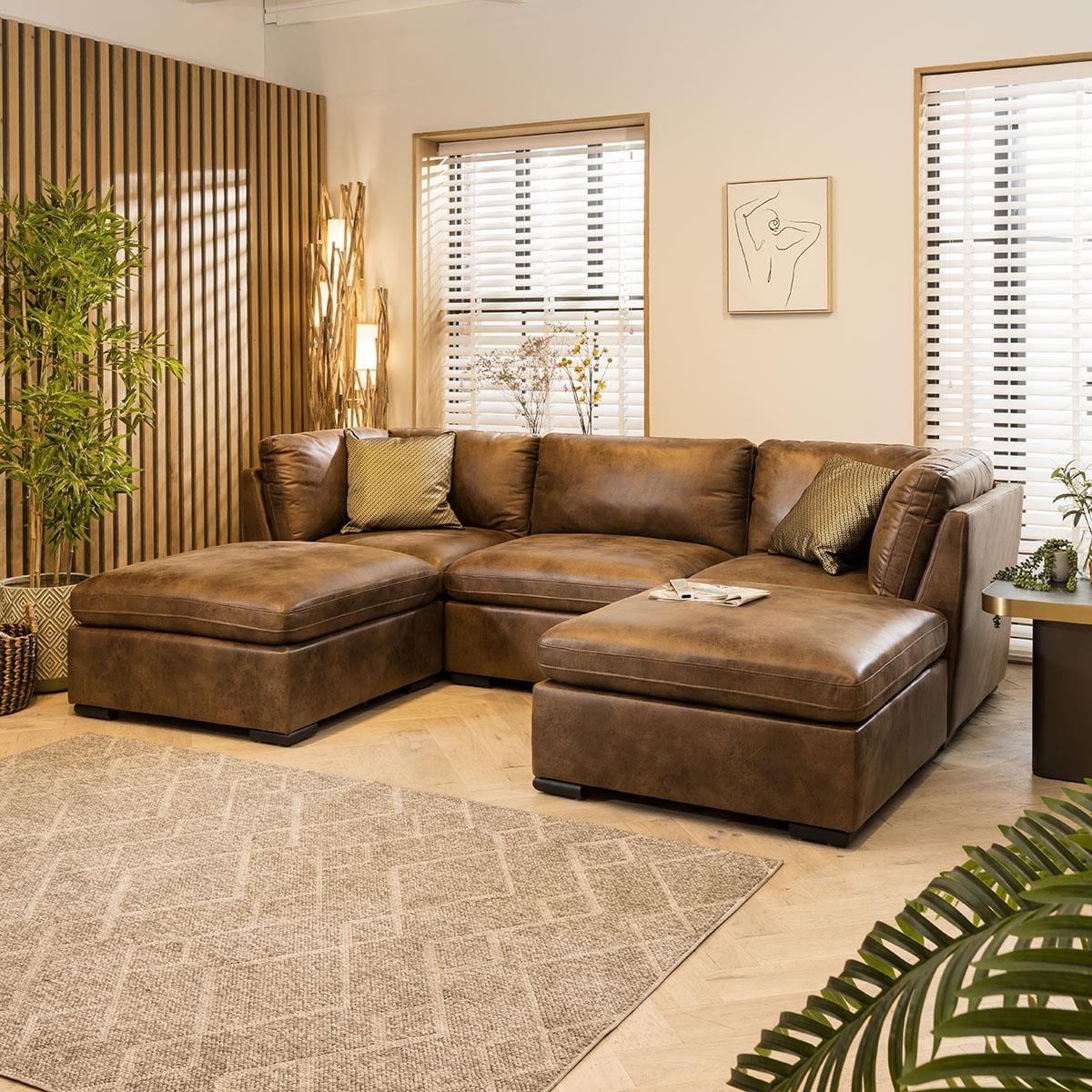 Versatile and stylish, this modular sofa set will transform your living room into a cosy haven. This is a 3 Seater U-Shape Corner Sofa Set in an elegant antique brown leather-look fabric offers comfort and flexibility. With a modular design and secure clips, you can rearrange the sofa modules to suit your room layout. Expandable and adaptable, this sofa set allows you to add additional modules for even more seating space. Each module measures 95cm, providing you with the freedom to customise the size and shape of your sofa according to your preferences. Whether you have a large living room or a compact space, this sofa is the perfect fit. Sink into luxury with our super soft premium cushions, offering unparalleled comfort and support. The cushions are fixed in place, ensuring a neat and tidy appearance while preventing any shifting or slipping. You can relax and unwind for hours on end, indulging in the plushness of our carefully designed cushions. Not only does this sofa provide supreme comfort, but it also exudes an air of sophistication with its sleek black metal feet. Whether you're hosting a movie night with friends or simply enjoying some quality time with your loved ones, this modular sofa with its timeless design and luxurious features is a must-have for any home. It effortlessly blends functionality, style, and comfort, making it the ideal choice for both large and small spaces. Upgrade your living room and elevate your lounging experience with our exceptional modular sofa set today. W285cm D190cm H87cm 3 Seater U-Shape Corner Sofa Set with Footstools Fully modular design: this set includes 2x corner sections, 1x middle section, 2x footstools