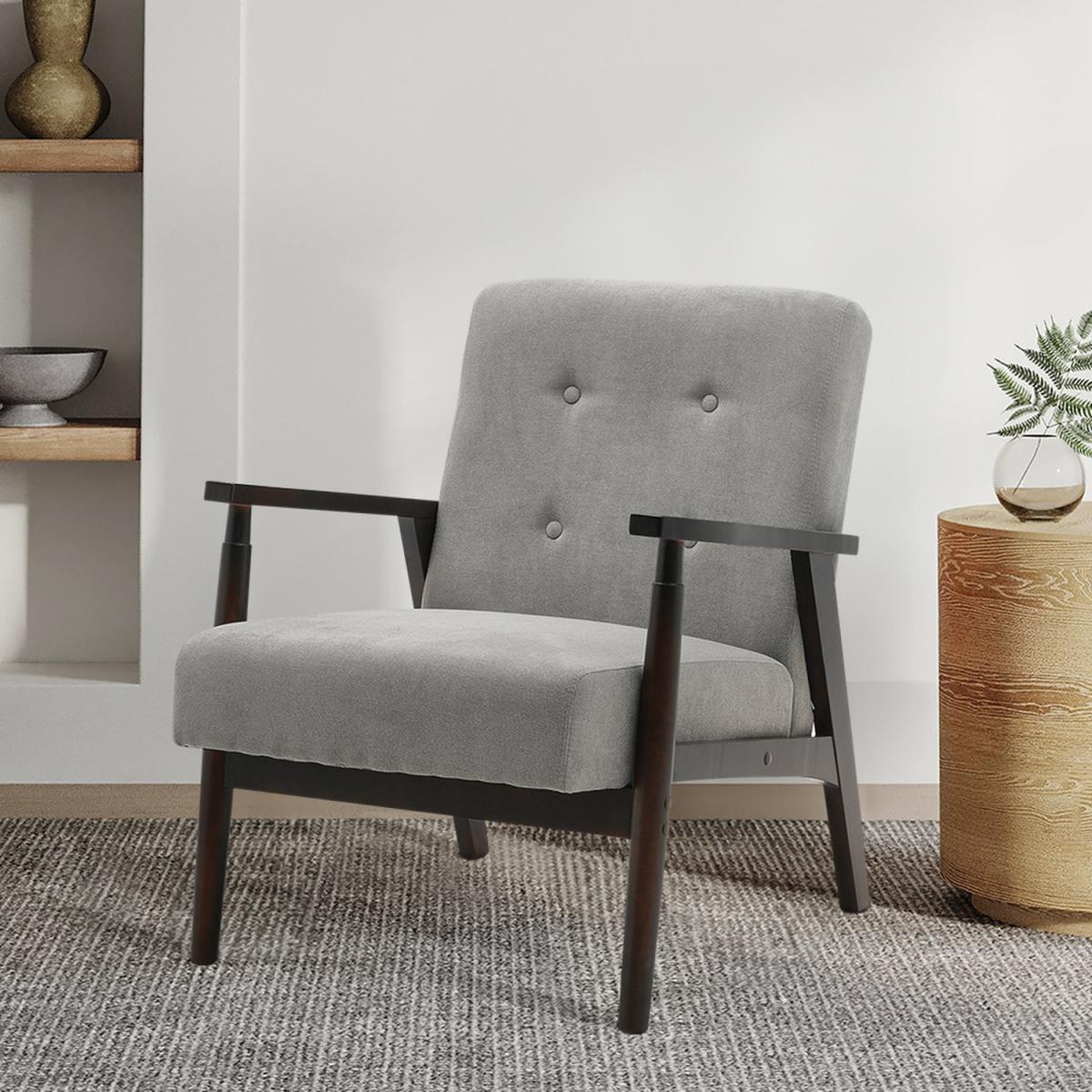 Discover the perfect blend of style, comfort, and functionality with the Livingandhome Modern Solid Wood Armchair. Dressed in a subtle grey velvet upholstery, this armchair seamlessly harmonizes with your existing furniture while fostering a chic home ambiance. The wooden frame, finished in a dark hue, not only showcases strength and durability but also preserves the innate charm of natural wood. It's a fusion of contemporary style and classic material, making it a timeless addition to your decor. The buttoned backrest is more than just a design feature, it adds an element of timeless elegance to the armchair. This piece isn't just for sitting, it's a conversation starter, a place to unwind, and an expression of your style. The grey velvet upholstery isn't just visually appealing,it's incredibly soft, offering a luxurious seating experience. With a texture akin to the softest cotton, this armchair cradles you in comfort, allowing you to relax and recharge with ease. The straightforward structure requires minimal upkeep and cleaning, ensuring you spend less time on chores and more time enjoying the comforts of your home.