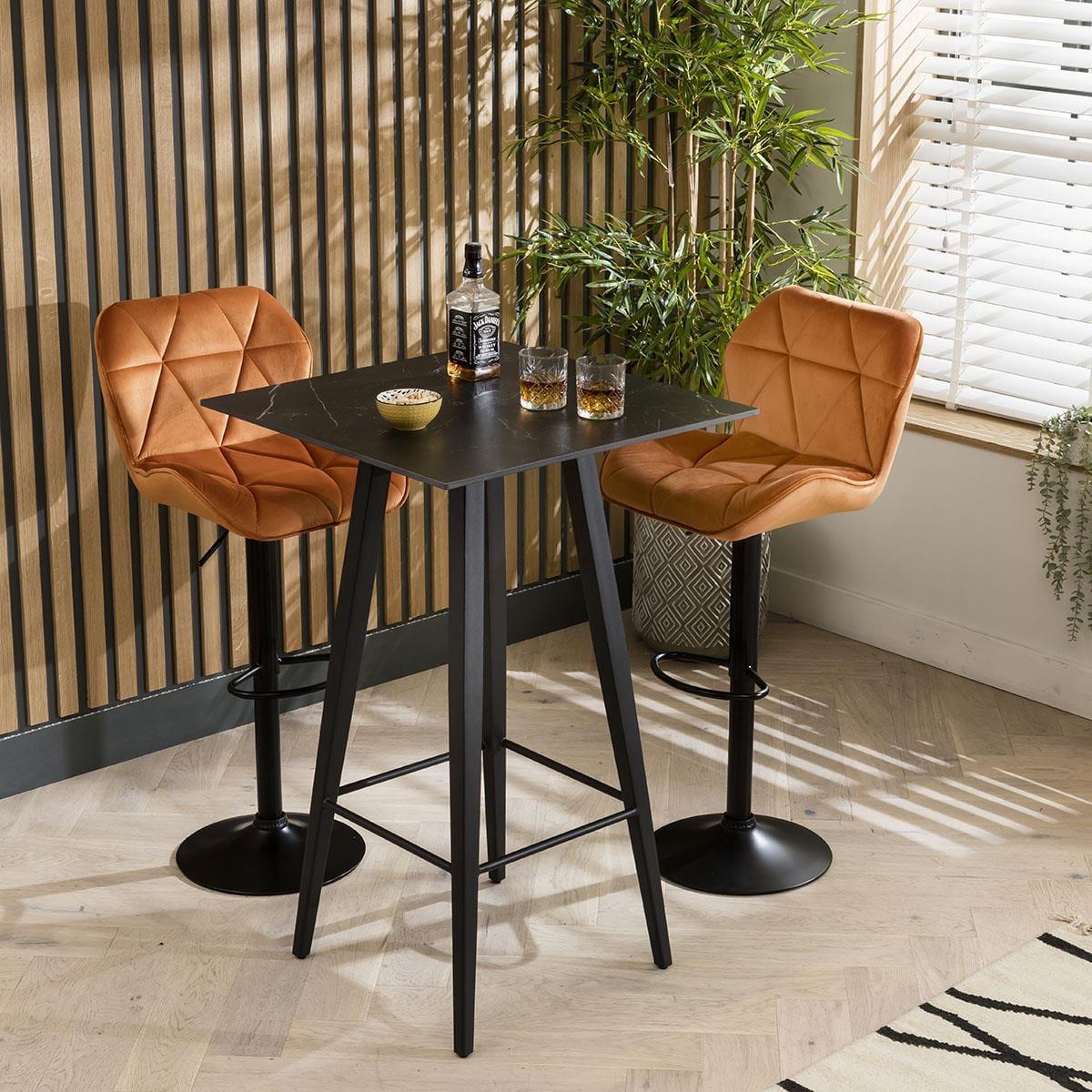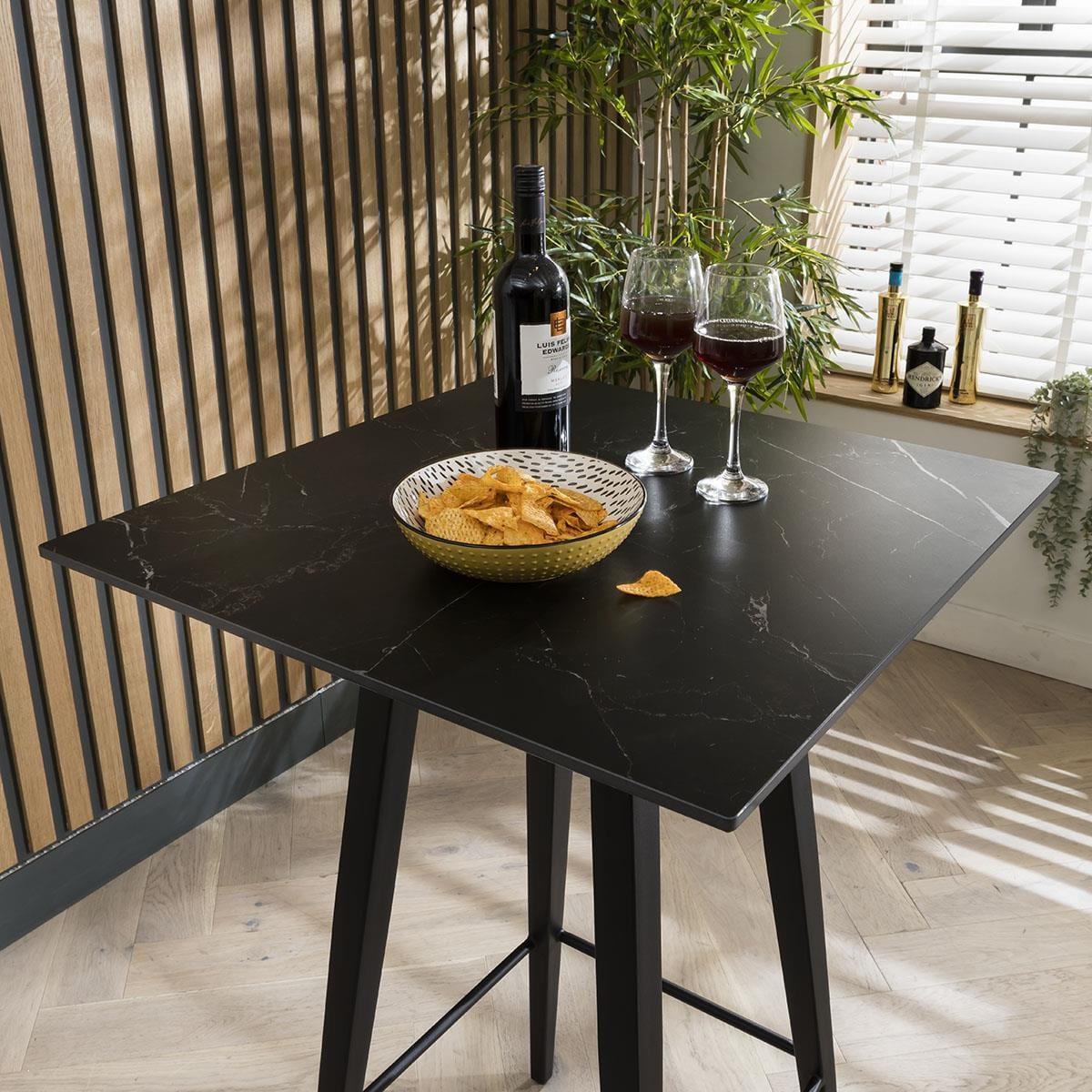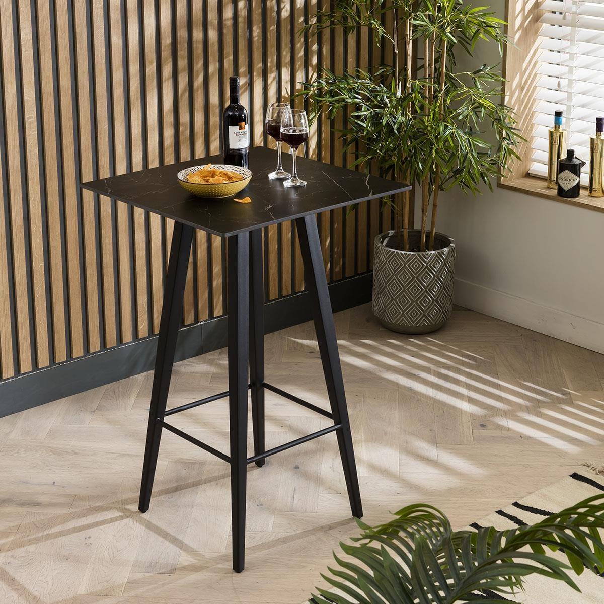 Designed for gathering and feasting with your nearest and dearest, the Lena 70cm square bar table, a seamless blend of modern aesthetics and functionality. At 107cm high, this modern bar table boasts a stunning black ceramic tabletop with a captivating marble effect that adds a touch of elegance to any environment. Unparalleled in durability, the scratch, stain, and heat-resistant ceramic surface ensures your table remains as pristine as the day it arrived, even after countless gatherings. Measuring at a height of 107cm, our bar table offers an ideal setting for up to 4 people, making it the perfect choice for intimate gatherings or casual hangouts. Designed with a discerning eye for minimalism, the black metal powder-coated base not only complements the sleek tabletop but also provides unparalleled stability. Crafted with the utmost precision and using high-quality materials, our bar table guarantees long-lasting performance that withstands the test of time. Whether you're seeking a centerpiece for your kitchen or a chic addition to your entertainment area, our modern bar table is the epitome of sophistication and functionality. Elevate your space with this exceptional piece that effortlessly combines contemporary design, durability, and comfort. Experience the epitome of style and quality with our stunning bar table - a true masterpiece for the modern connoisseur. W70cm D70cm H107cm Black marble effect ceramic with a textured matte finish Ceramic is scratch, stain and heat resistant