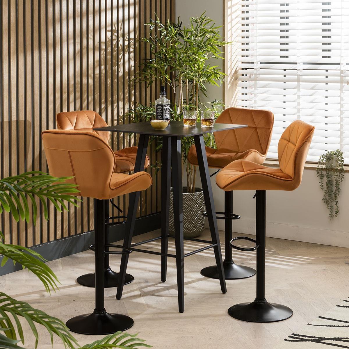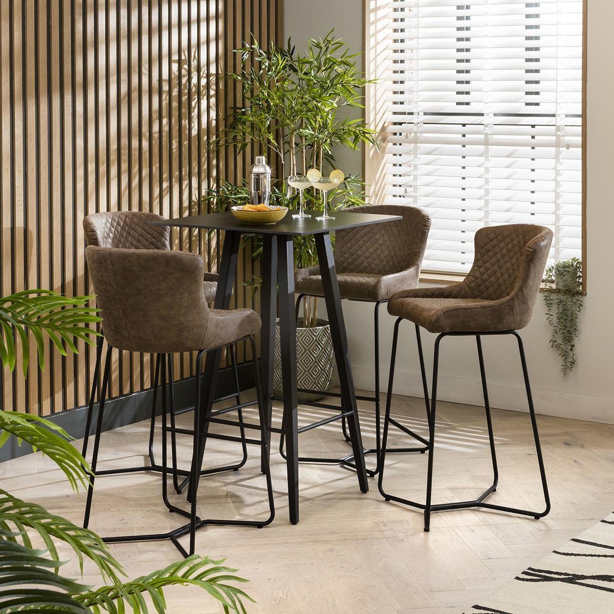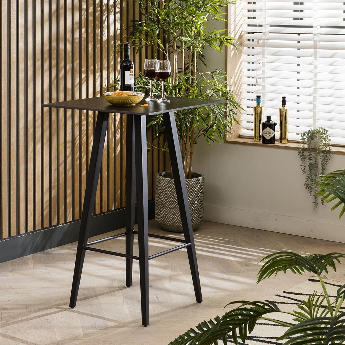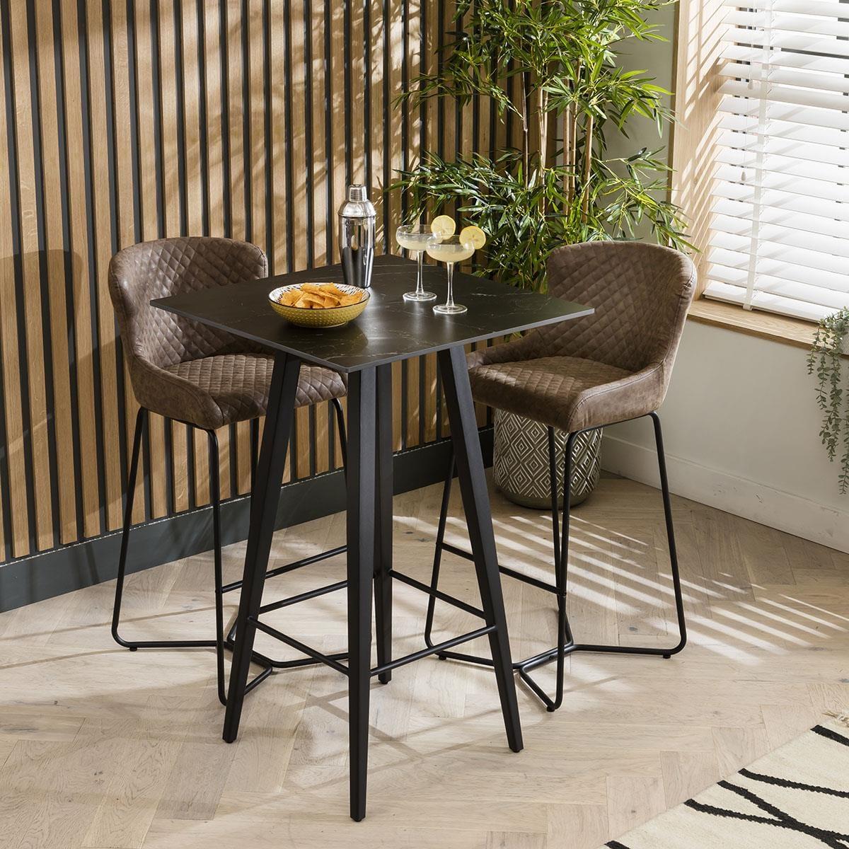 Designed for gathering and feasting with your nearest and dearest, the Lena 70cm square bar table, a seamless blend of modern aesthetics and functionality. At 107cm high, this modern bar table boasts a stunning black ceramic tabletop with a captivating marble effect that adds a touch of elegance to any environment. Unparalleled in durability, the scratch, stain, and heat-resistant ceramic surface ensures your table remains as pristine as the day it arrived, even after countless gatherings. Measuring at a height of 107cm, our bar table offers an ideal setting for up to 4 people, making it the perfect choice for intimate gatherings or casual hangouts. Designed with a discerning eye for minimalism, the black metal powder-coated base not only complements the sleek tabletop but also provides unparalleled stability. Crafted with the utmost precision and using high-quality materials, our bar table guarantees long-lasting performance that withstands the test of time. Whether you're seeking a centerpiece for your kitchen or a chic addition to your entertainment area, our modern bar table is the epitome of sophistication and functionality. Elevate your space with this exceptional piece that effortlessly combines contemporary design, durability, and comfort. Experience the epitome of style and quality with our stunning bar table - a true masterpiece for the modern connoisseur. W70cm D70cm H107cm Black marble effect ceramic with a textured matte finish Ceramic is scratch, stain and heat resistant