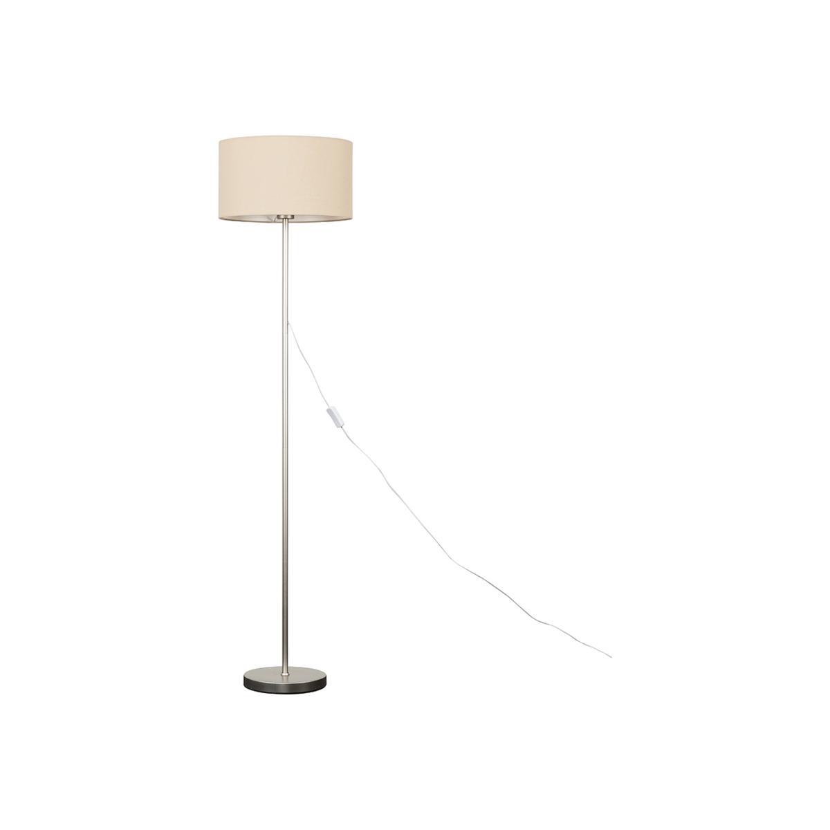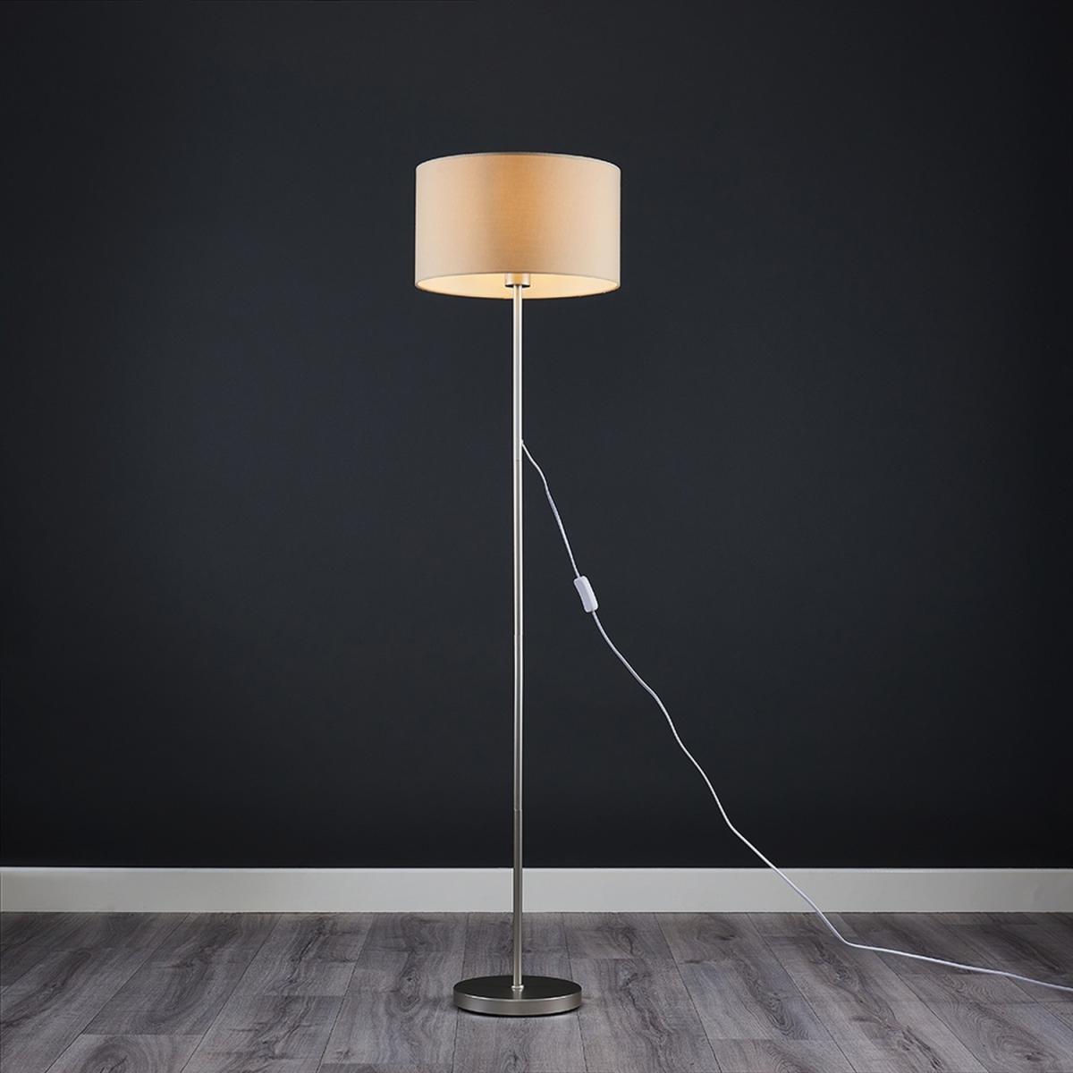 Modern standard tall stem floor lamp in a brushed chrome metal finish, complete with a large reni beige fabric cylinder lamp shade. This minimalistic floor lamp would suit every dcor, from classic to contemporary, modern, and more! Floor lamps are a great way to bring additional lighting to a room and help create a cosy ambience in any space Perfect for hallways, bedrooms, living rooms and offices!