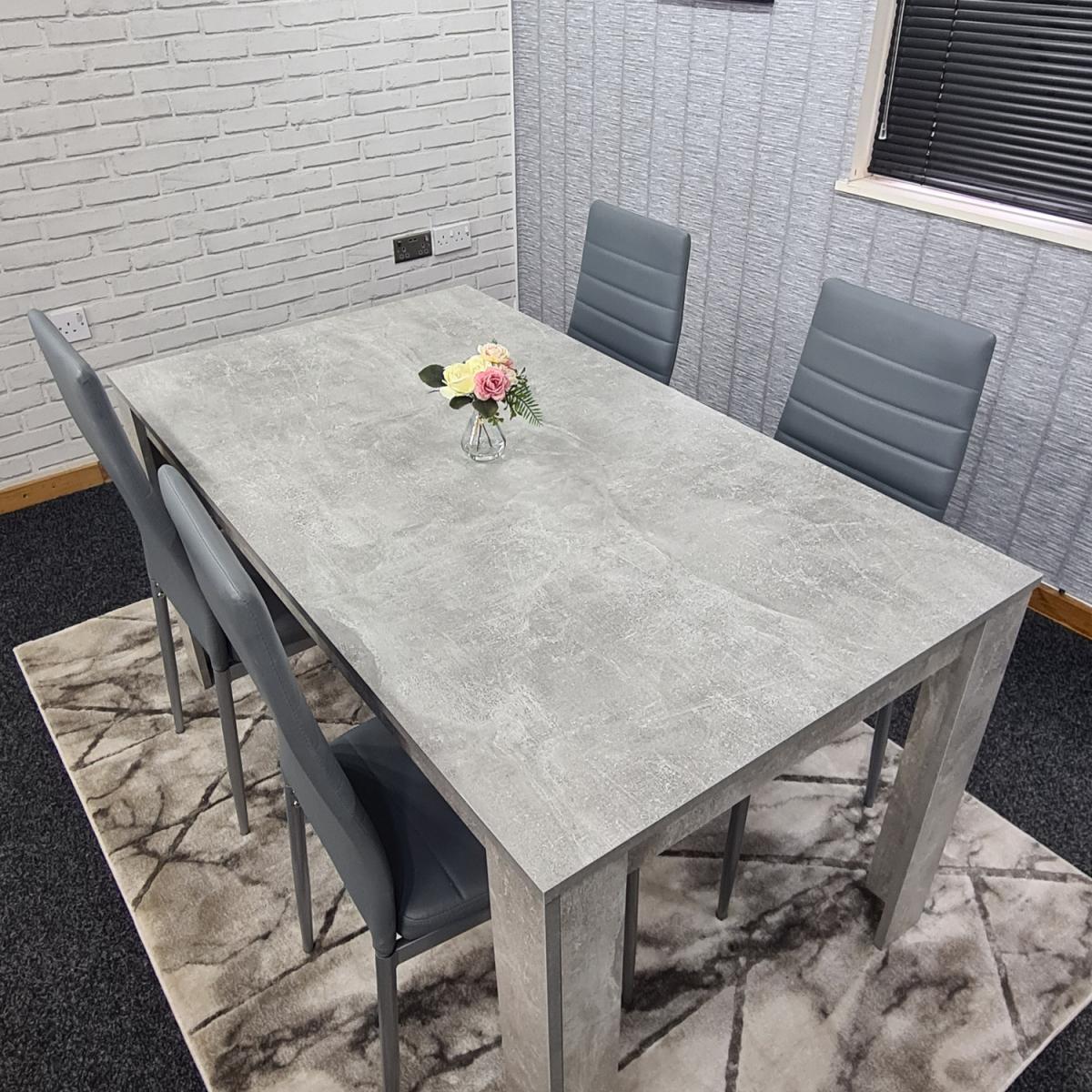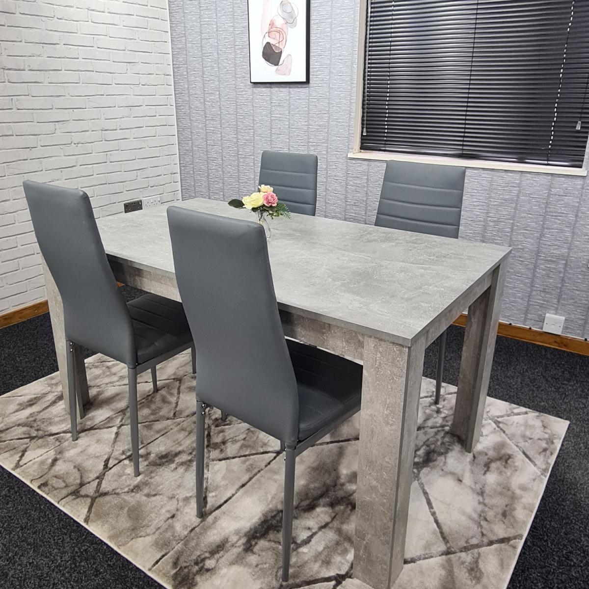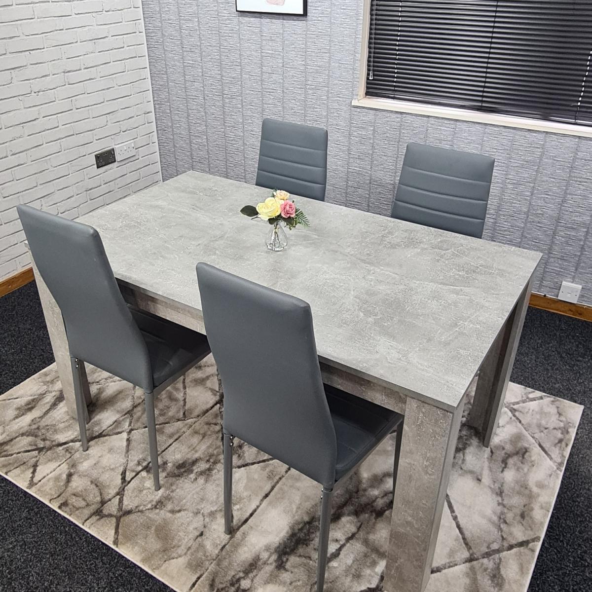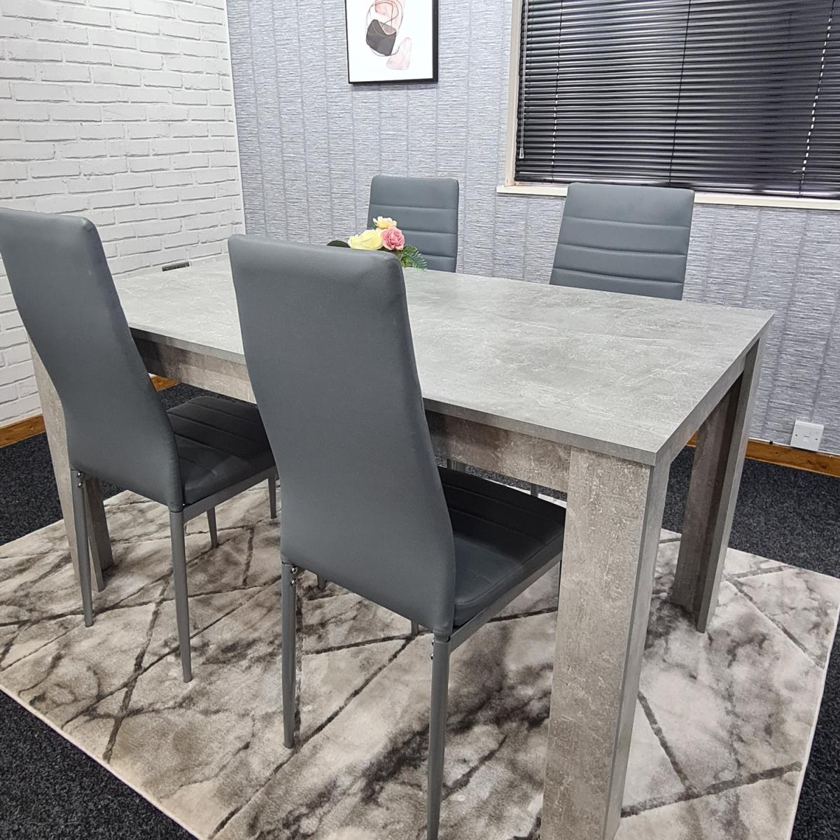 A Stunning wooden Dining Table set with 4 gorgeous metal chairs. Transform & brighten your dining area with this stunning, contemporary dining table with 4 stylish, grey comfy faux leather chairs. All our chairs meet fire resistance standards. Perfect centre for your modern kitchen or dining room.