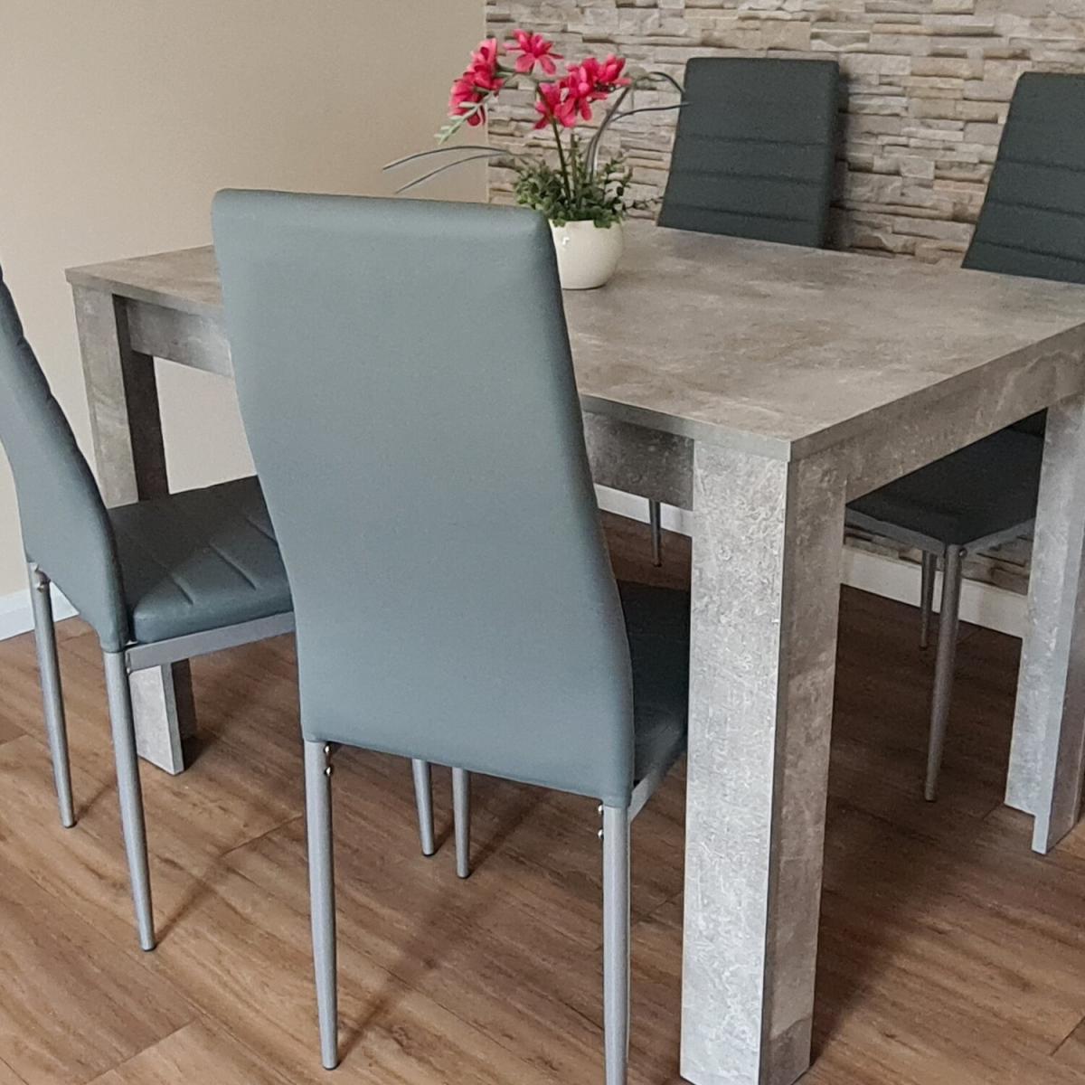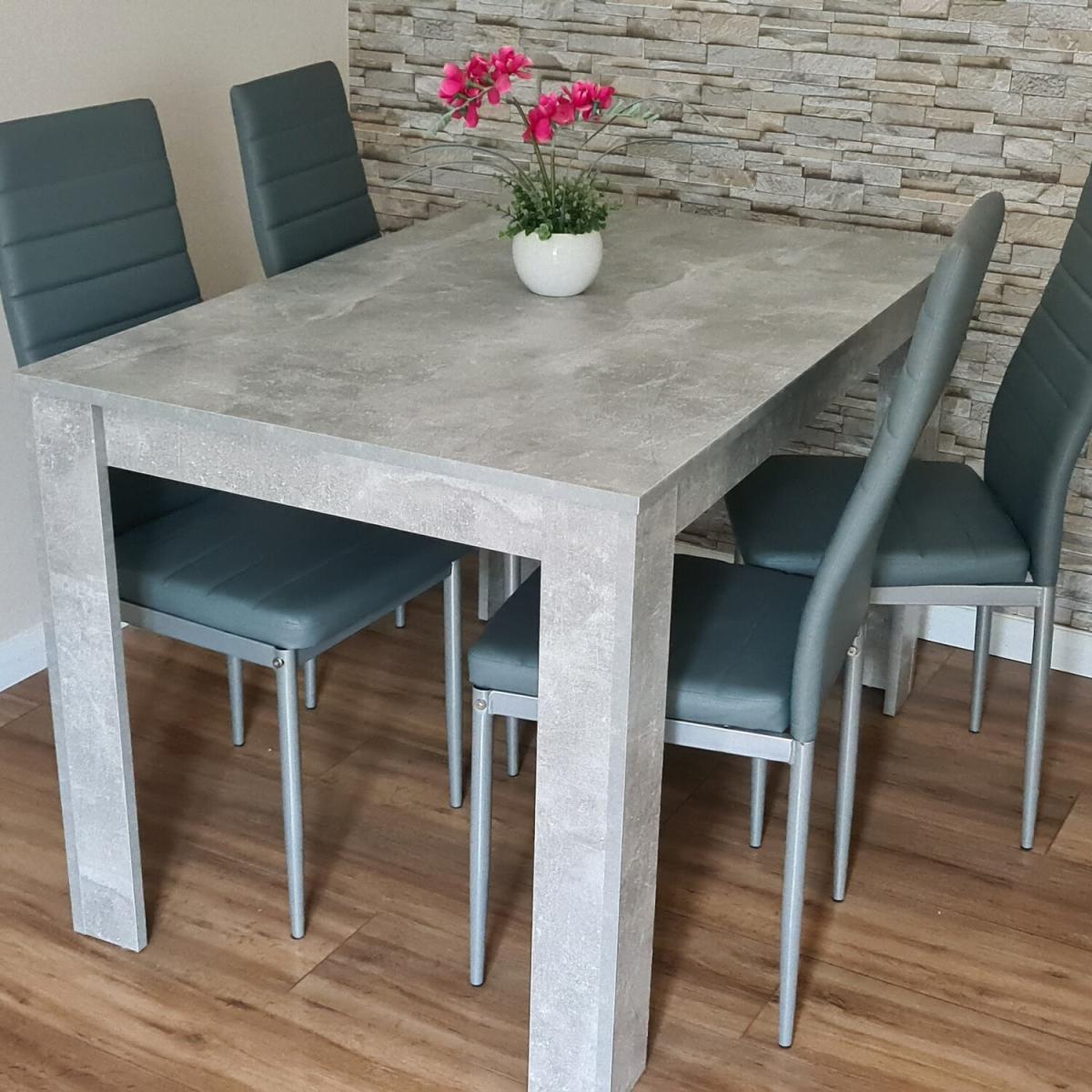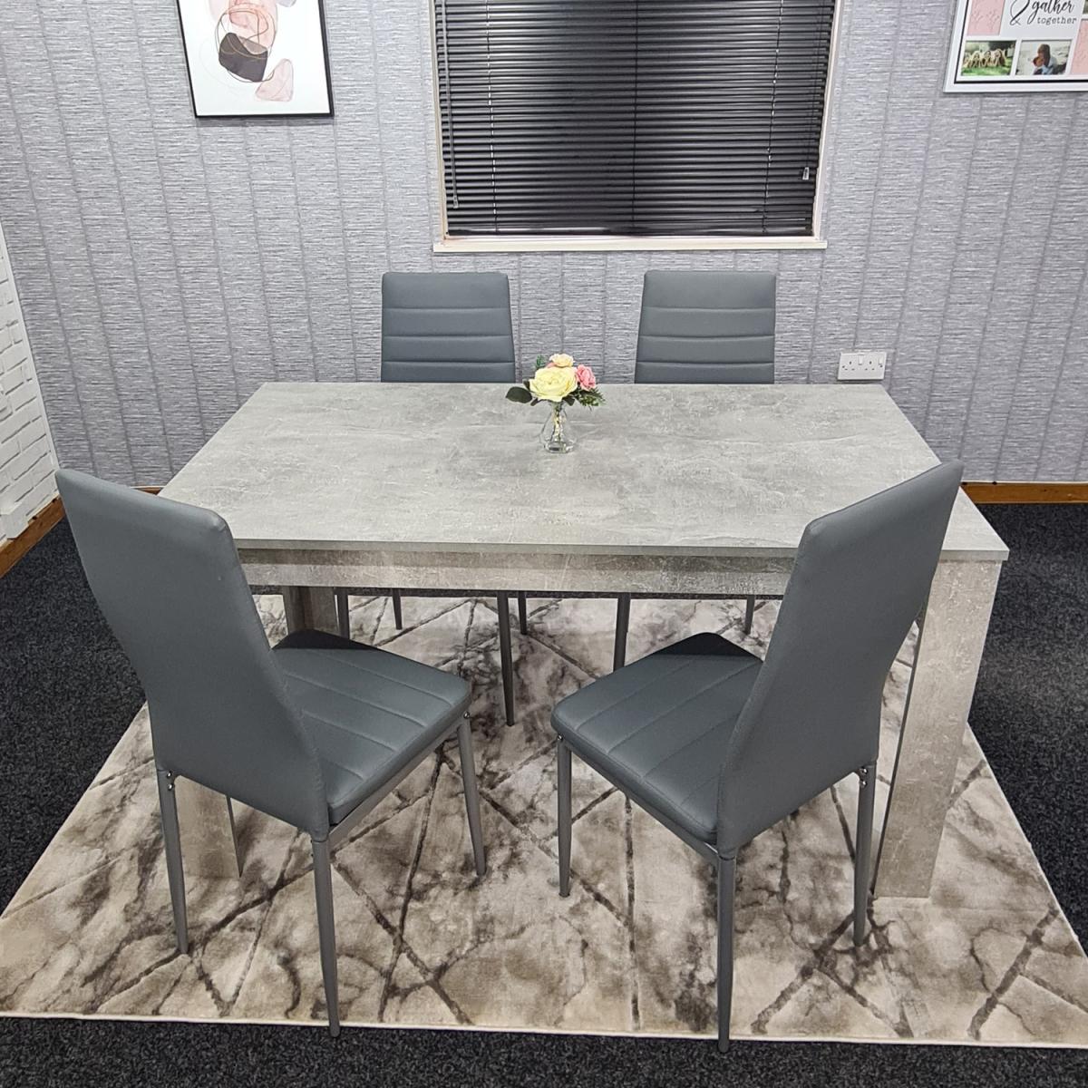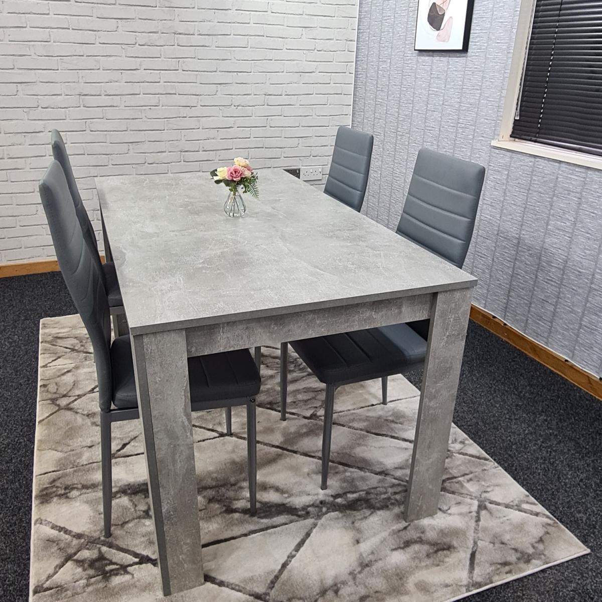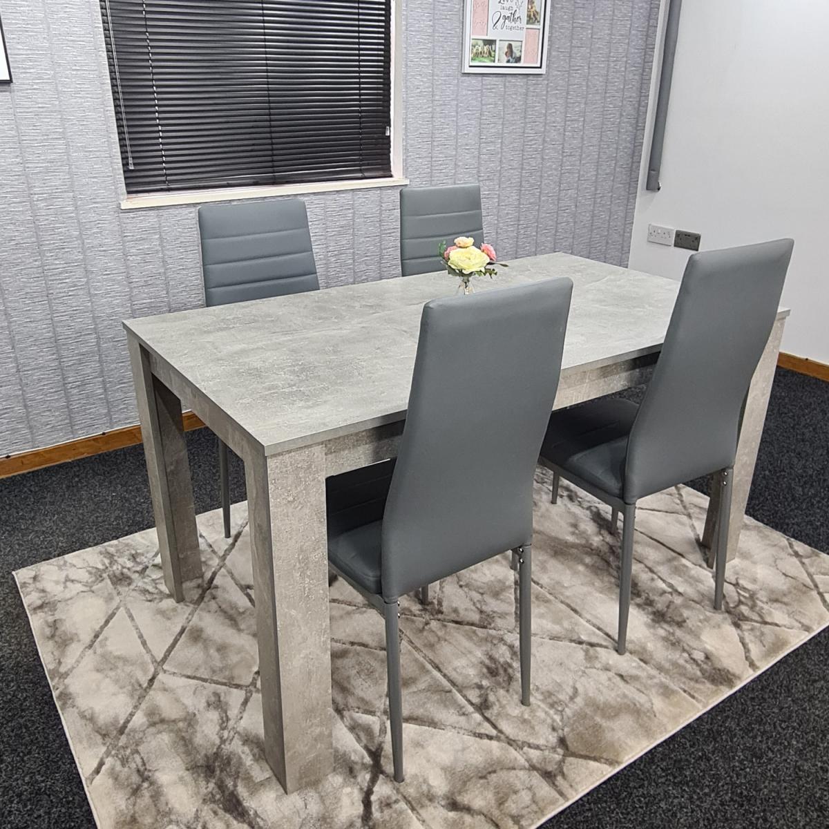 A Stunning wooden Dining Table set with 4 gorgeous metal chairs. Transform & brighten your dining area with this stunning, contemporary dining table with 4 stylish, grey comfy faux leather chairs. All our chairs meet fire resistance standards. Perfect centre for your modern kitchen or dining room.
