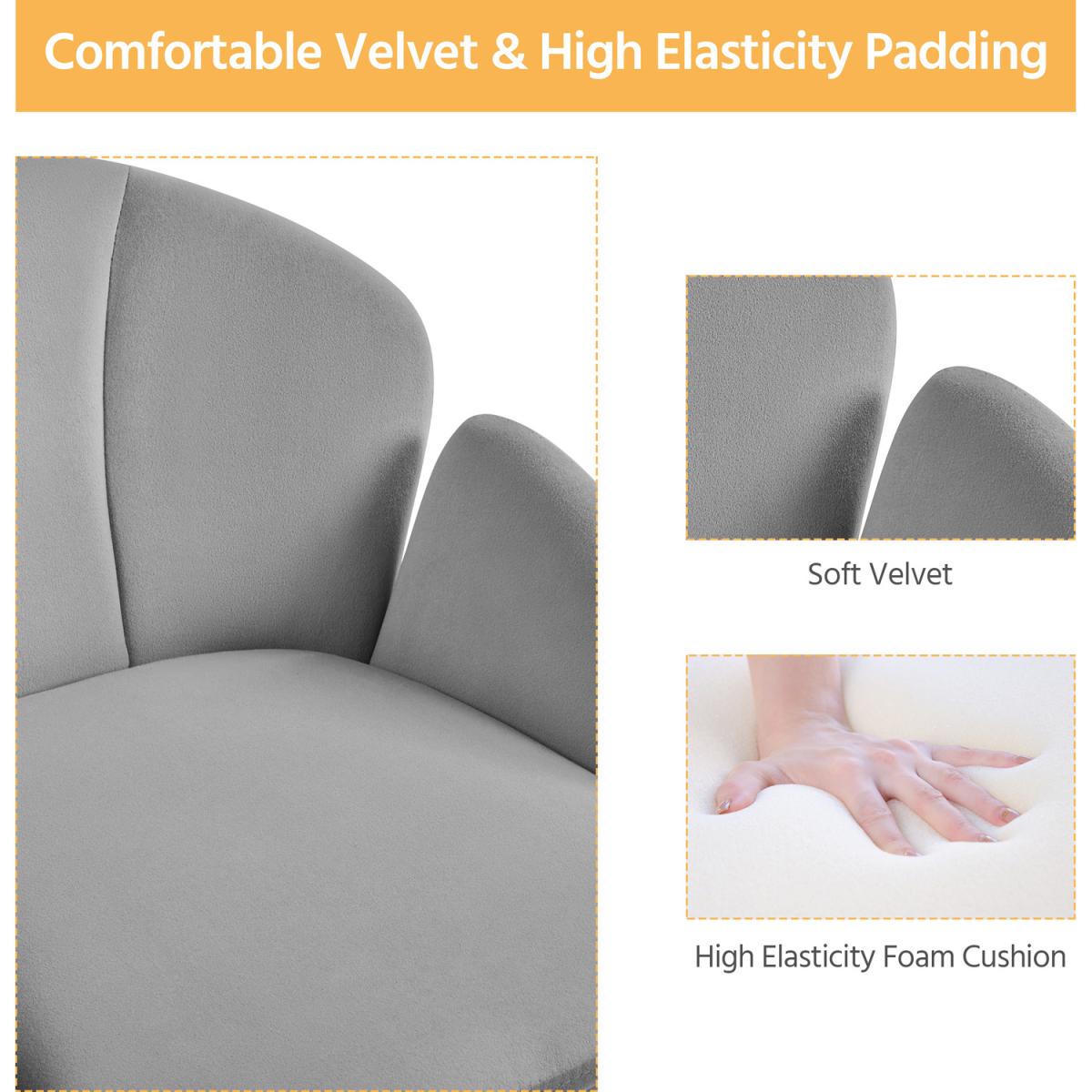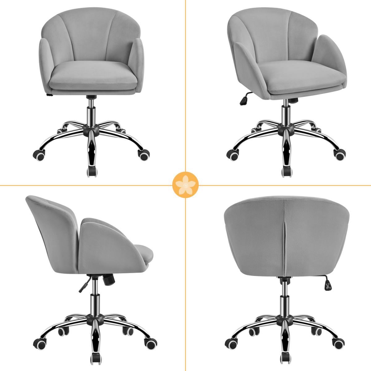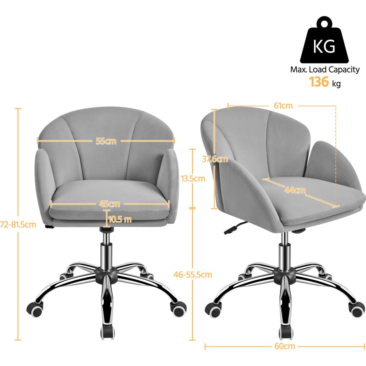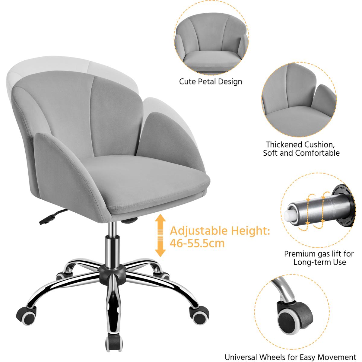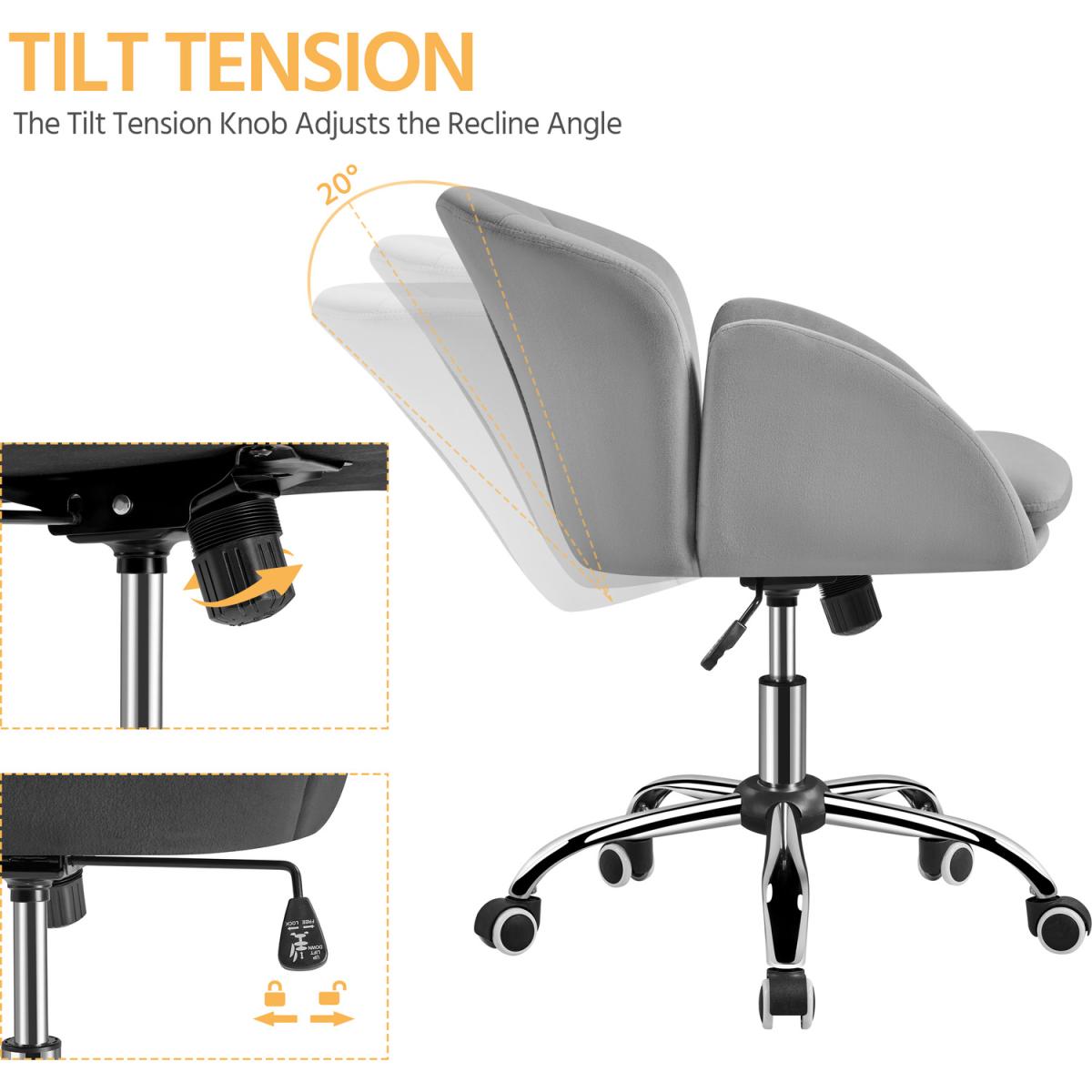 Silky velvet and soft foam make this task chair comfortable to sit a sturdy metal foot base and five multidirectional casters allow you freely move from one work task to another. With an SGS-Certified pneumatic cylinder (CLASS 2), you can use the adjustment lever to lift the chair to 81.5 cm or push it down to 72cm. The tilt tension knob can help you recline this chair within the angle range of 20 degrees. This mid-back armchair's flower petal design provides a comfortable sitting experience and decorates your home office flawlessly.