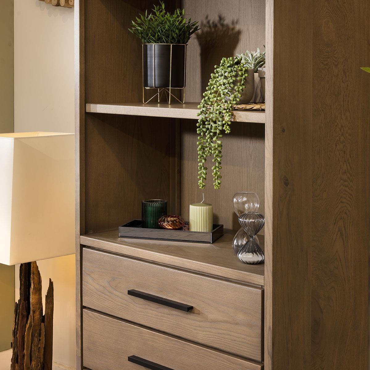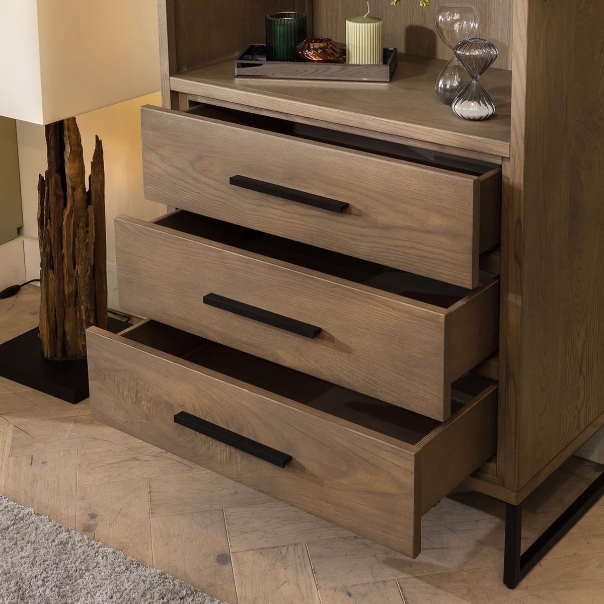 Boasting a premium stained finish, this freestanding wooden shelving unit stands tall at 190cm with a modern contemporary design. The unit features three spacious open bookshelves perfect for displaying your prized collection while offering functionality with three drawers below, each adorned with chic metal handles. Constructed with durability in mind, the body of this bookshelf is meticulously crafted from solid ash wood, ensuring both longevity and a timeless aesthetic. Its stained finish not only enhances the wood's elegant grain but also complements various interior styles, adding a touch of sophistication to any space. The combination of open shelves and drawers offers versatility, allowing you to organise and exhibit your items with ease. This shelving unit arrives preassembled, streamlining the setup process simply attach the black metal legs and place it in your preferred spot. The fusion of modern design elements with the warmth of solid ash wood makes this bookshelf a statement piece that effortlessly merges functionality and style. Elevate your home decor with this striking unit, striking the perfect balance between form and function. Curated to complement your contemporary lifestyle seamlessly, with plenty of storage - open shelf internal dimensions W70cm D37cm H35cm, drawer internal dimensions W60cm D33cm H10cm. W75cm D40cm H190cm Leg Height: 16cm Solid Wood Bookcase with Stained Finish