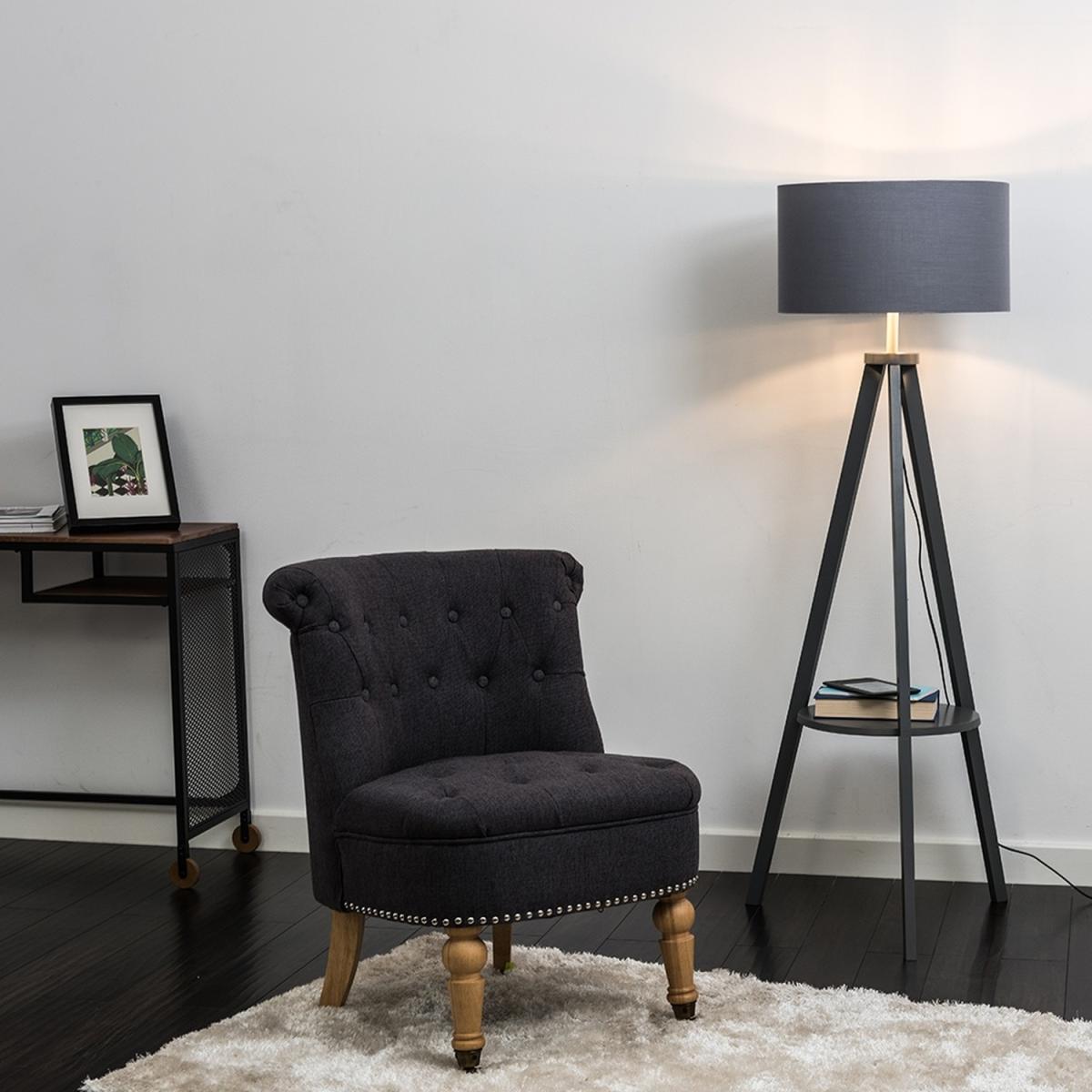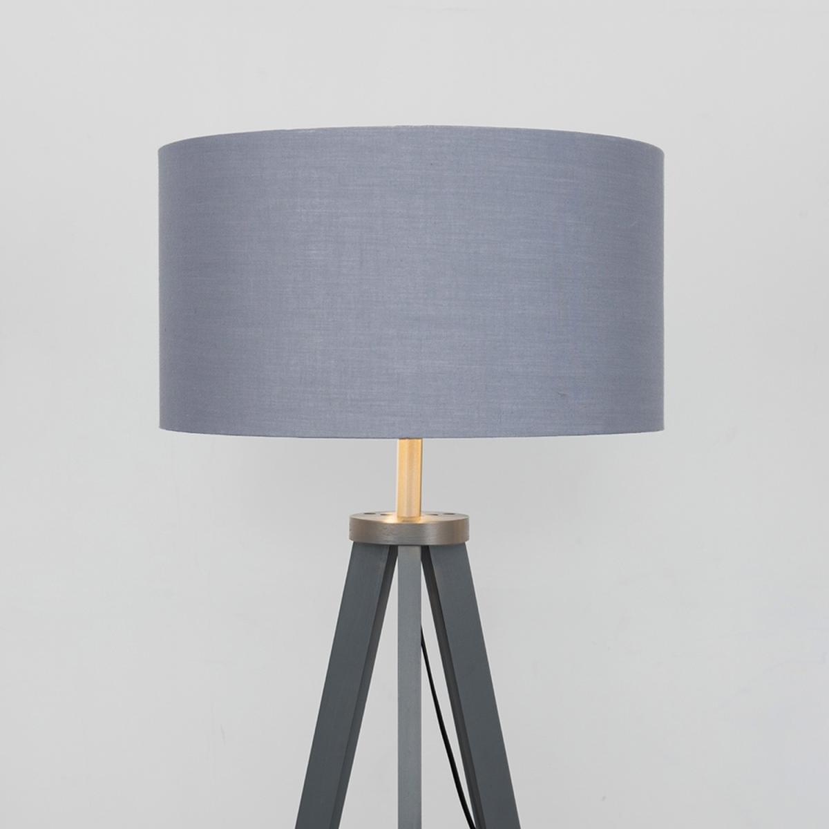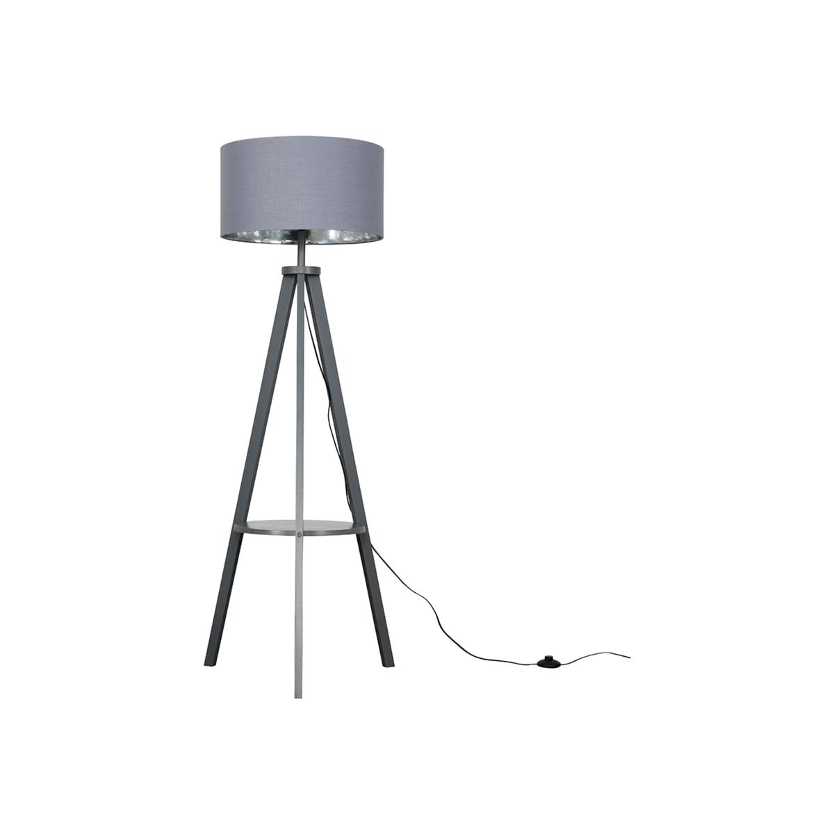 Modern tripod style floor lamp in a grey painted wood finish, complete with a grey fabric drum lamp shade with a silver chrome effect interior and a shelf for convenient storage or to use as a decoration place. Features an in-line onoff foot switch for easy use. Floor lamps are a great way to bring additional lighting to a room or you can use them reduce your main light output, and create a more relaxing moodatmosphere.