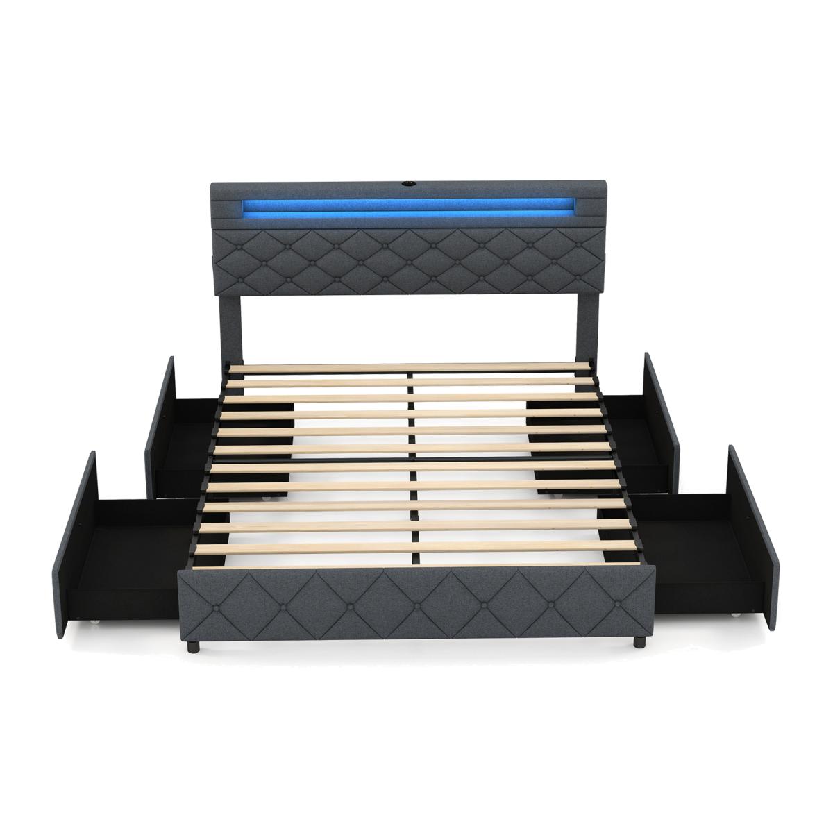 Step into the future with a bed that not only lights up your world but also syncs to your tunes! With 60,000 colours and adjustable brightness, every night feels like a premiere. Say goodbye to clutter with ingeniously storage headboard and slide-out drawers, designed for sleek yet functional living. Indulge in the plush comfort of an adjustable headboard while you charge up with handy USB ports right at your bedside. Featuring robust construction and a stylish button-tufted design, this bed offers durability with a dash of elegance.