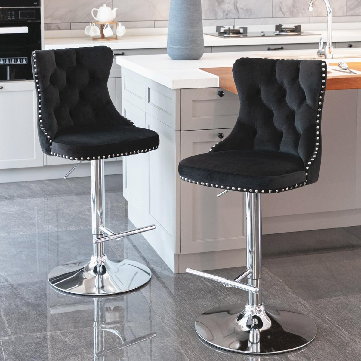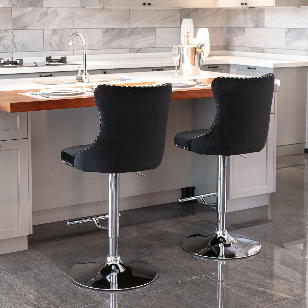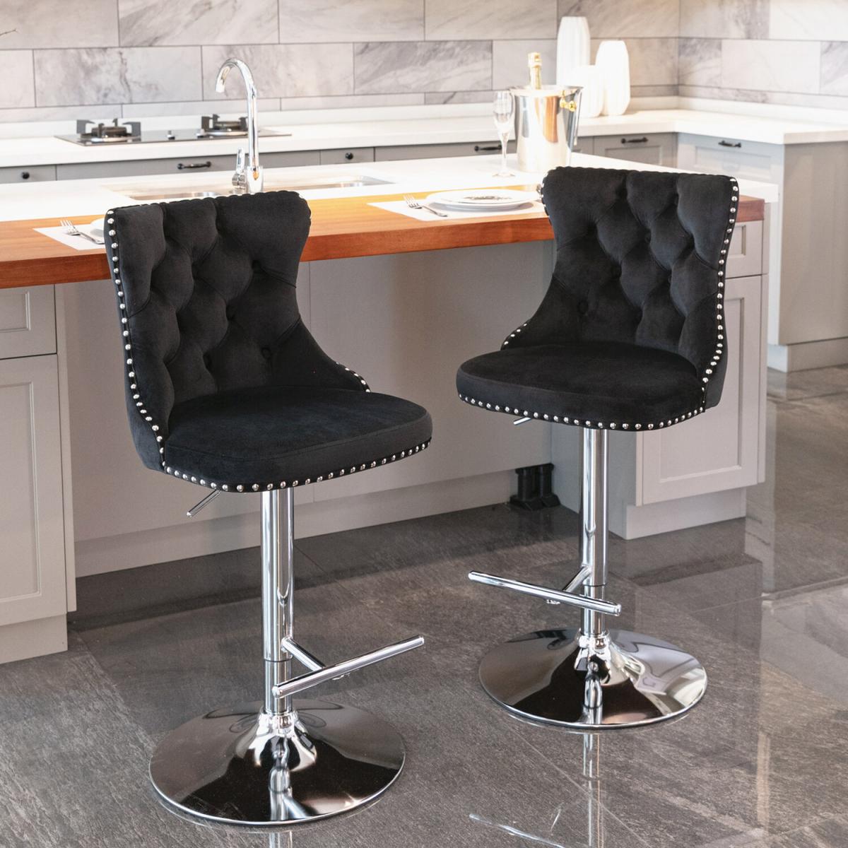 I’m a fan of these black velvet bar stools for their blend of comfort and sleek style - the plush, tufted upholstery feels inviting while the chrome swivel base keeps things modern and practical. They suit contemporary, minimalist or even industrial-edged kitchens and home bars, especially against light cabinetry or exposed brick. For a polished look, pair them with mixed-metal accessories (think brass pendant lights or a copper bar cart) and keep nearby surfaces simple to let the velvet pop. Adjust the height so stools tuck neatly under your counter when not in use, and add a slim cushion or patterned throw for a touch of warmth and extra back support.