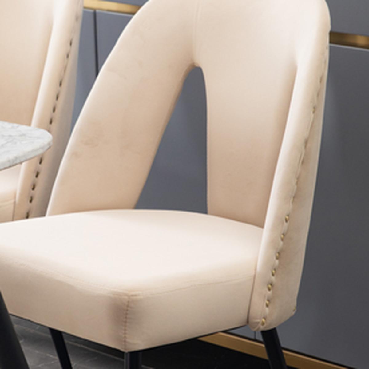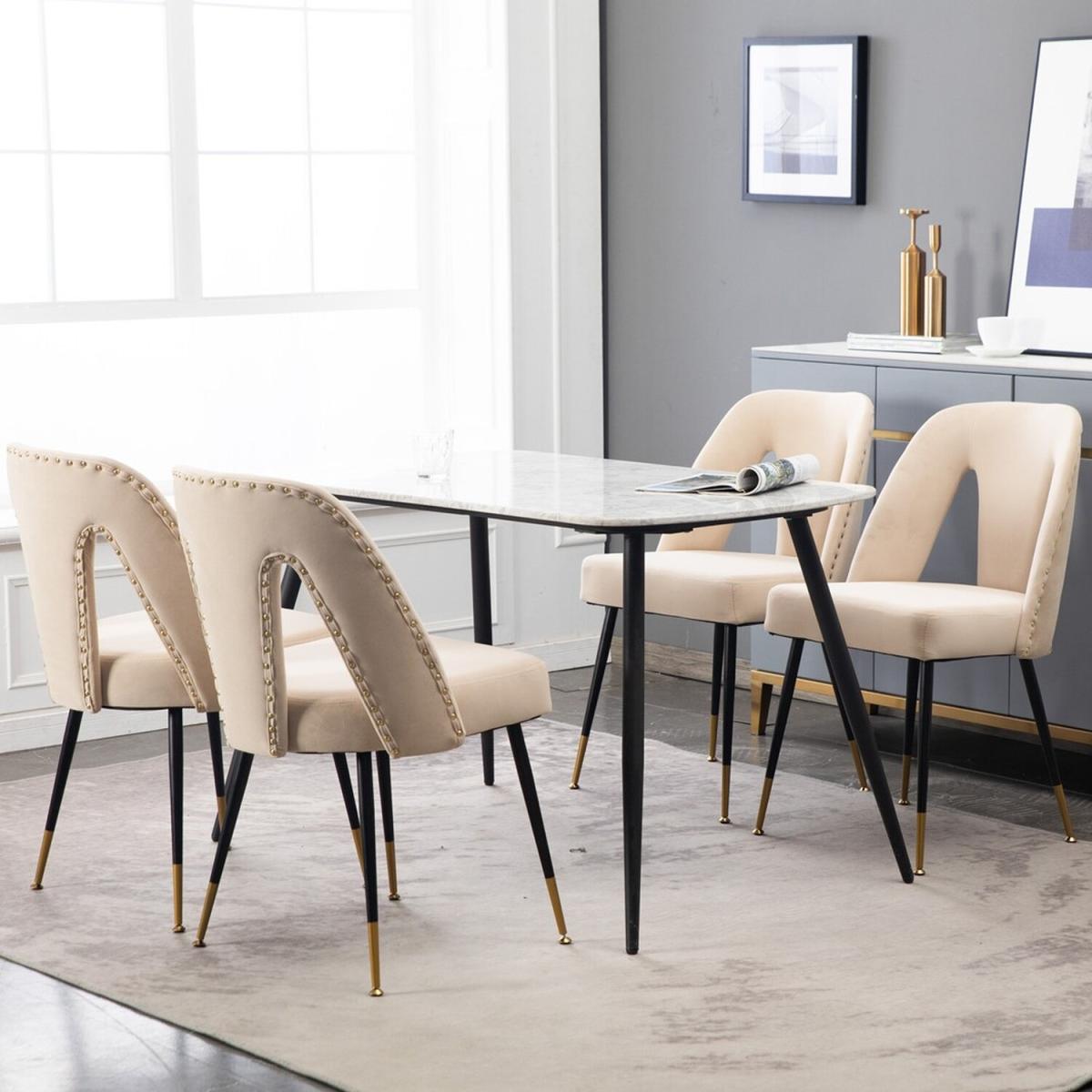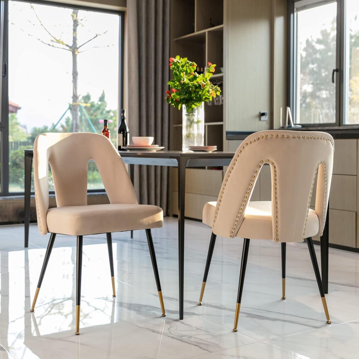 This modern dinning chair features with nail head trim and graceful simple lines on the chair's exterior, finishing in black and gold, this dining chair set will easily enhance your dining space with a classic feel. Upholstered Soft Velvet give luxury look and very delicate to touch. The whole kitchen chair is padded with high density sponge for extreme comfort seating experience. Unique design allows multi - purpose use of the chairs, can be used as dining chairs, living room chairs or even office chairs, restaurants and cafe. The upholstered dining chair is built to last, Extra Strong steel legs for extra stable and durable. Adjustable feet to protect your floors from scratches and scuffs.