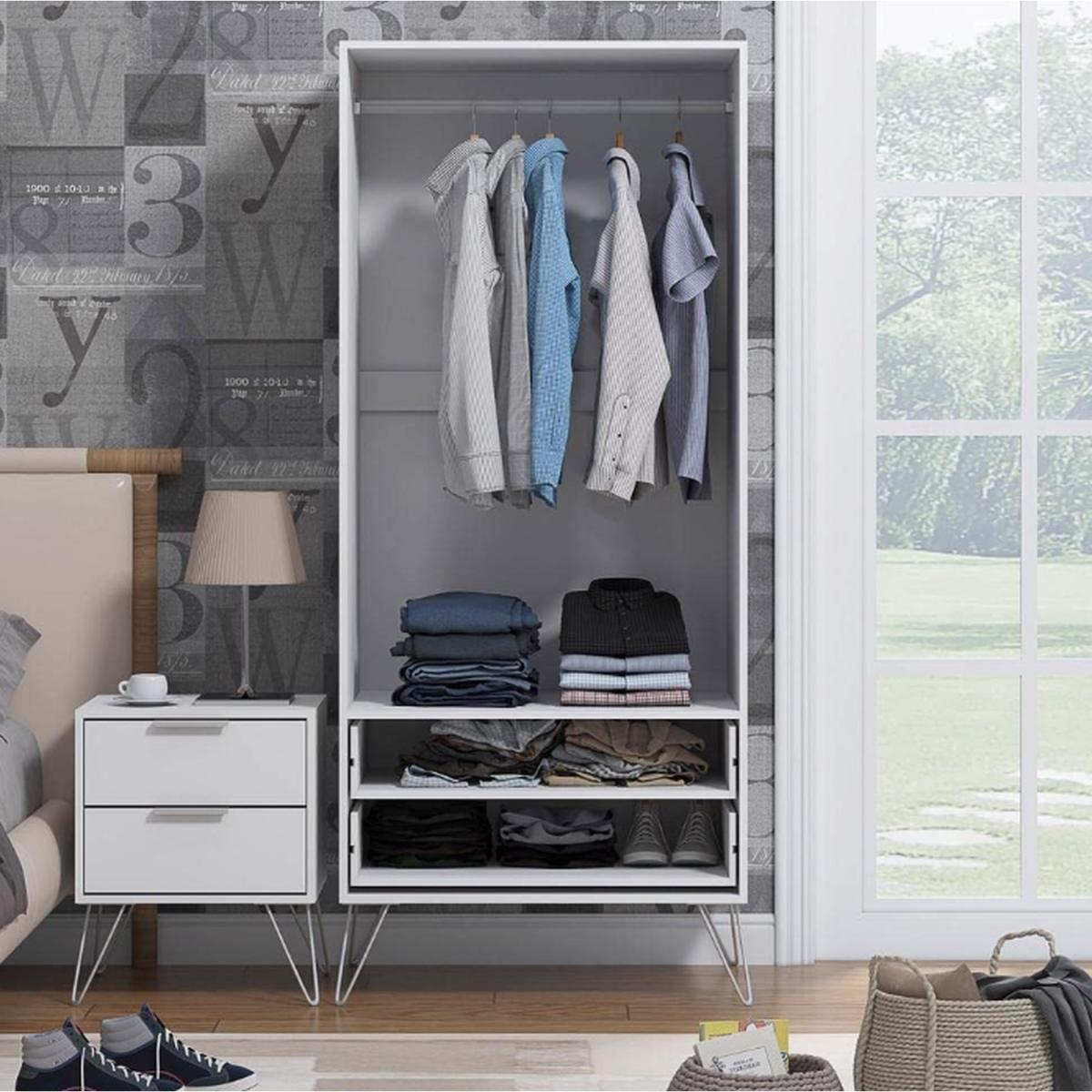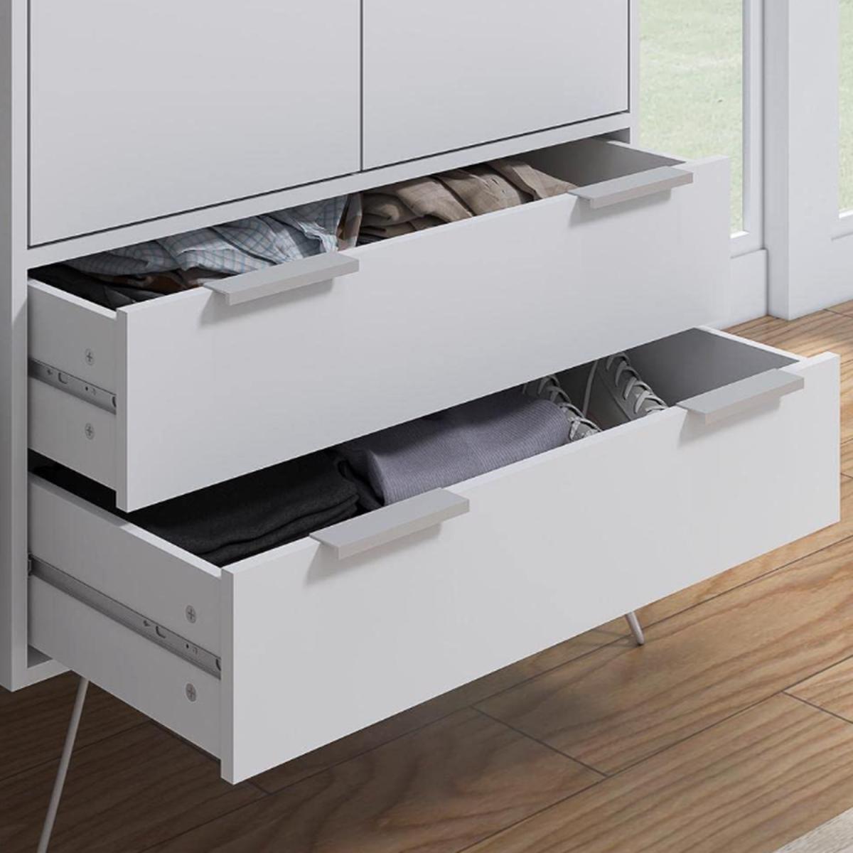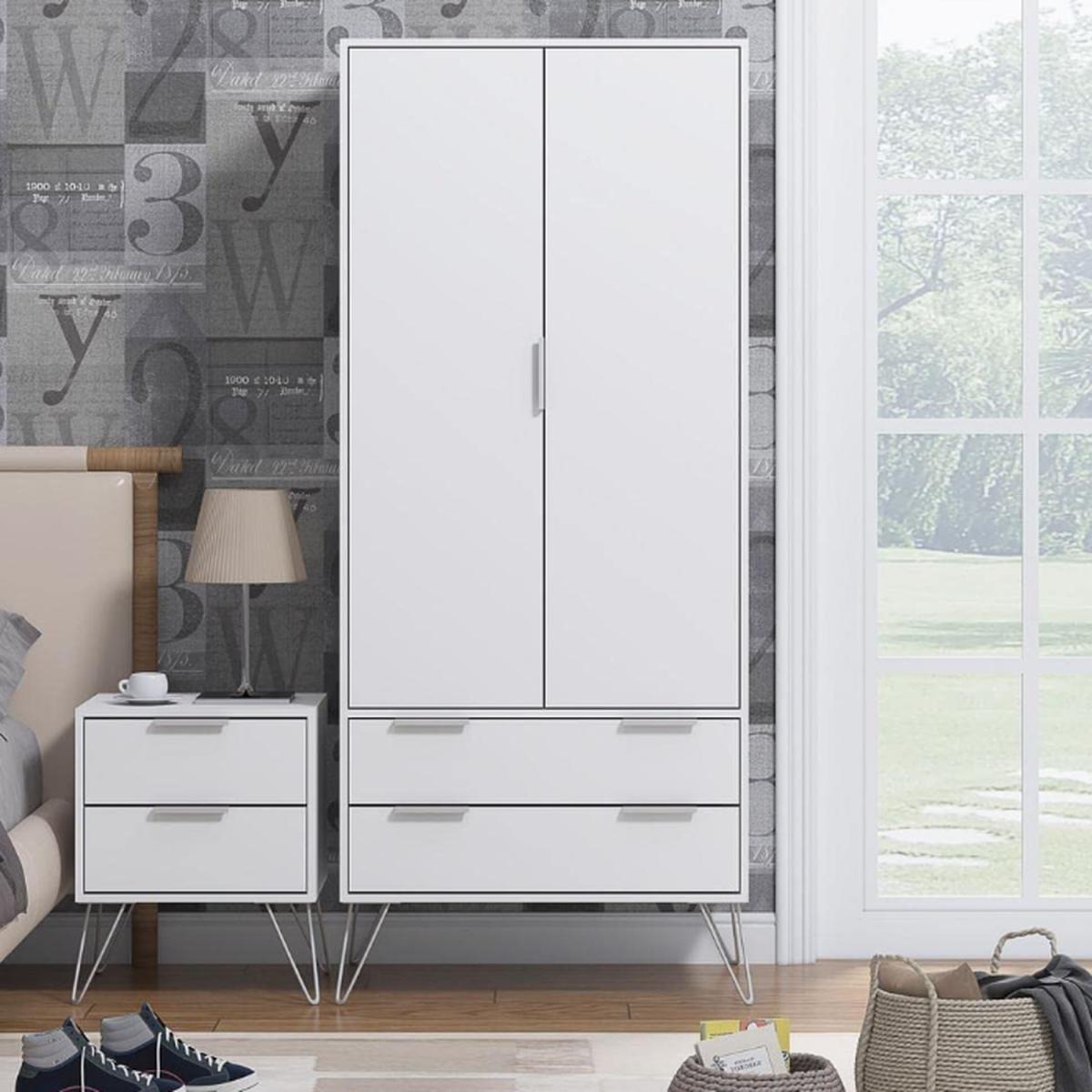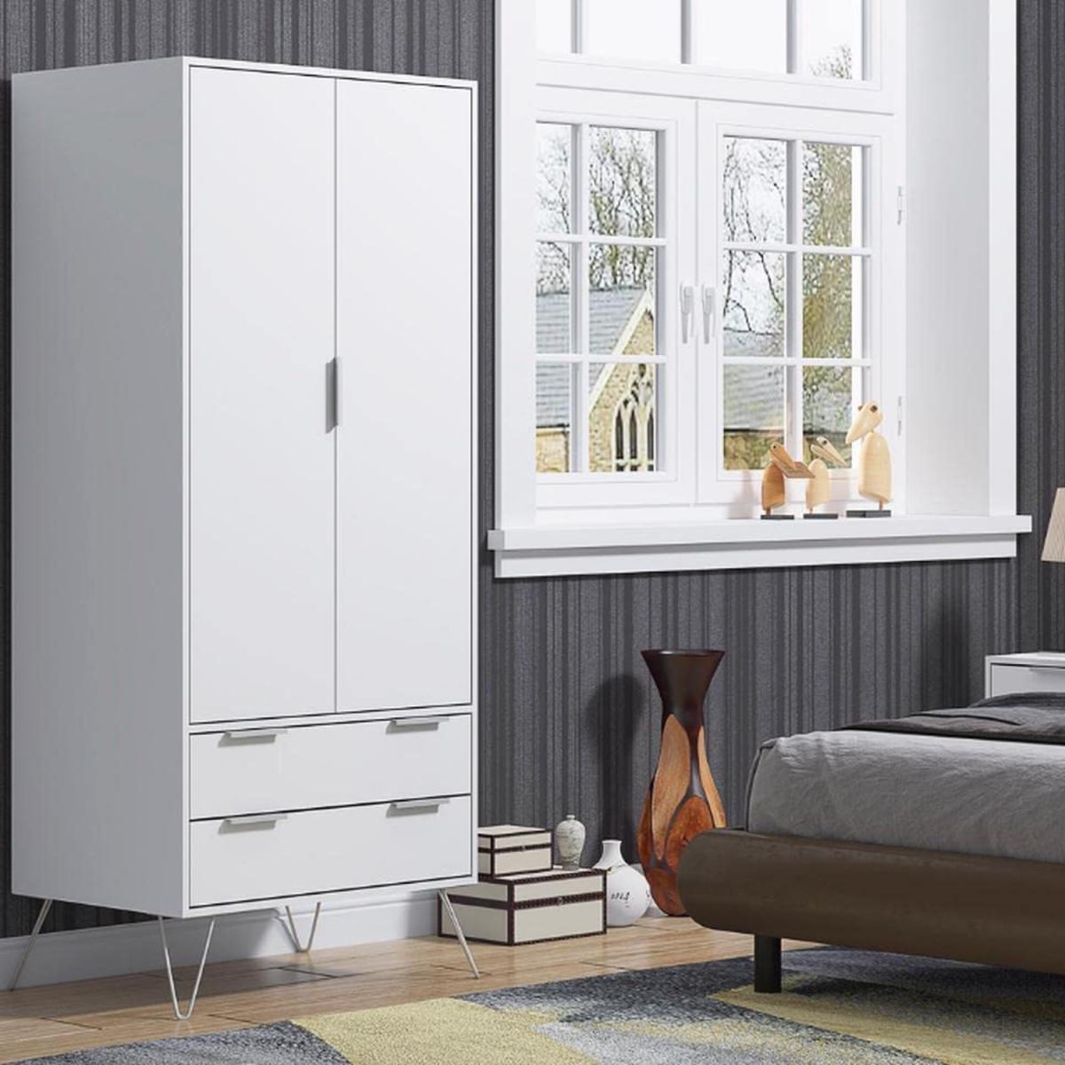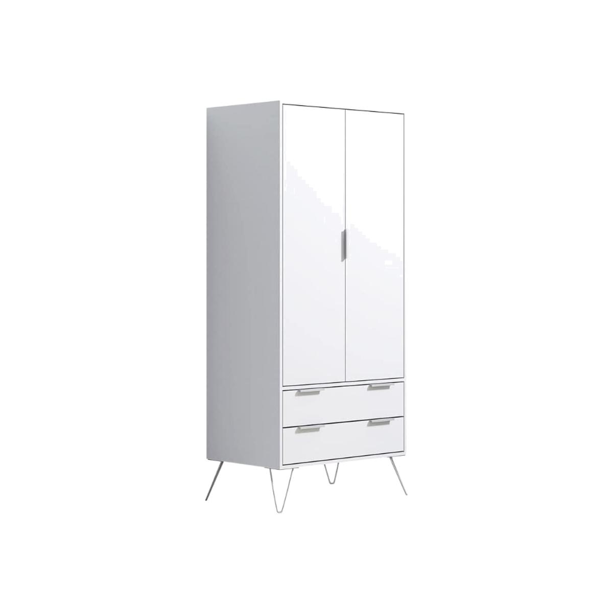 Modern Matt White 2 Door 2 Drawer Wardrobe on Hairpin Legs. Finished in a matt White scratch-resistant melamine coating- this modern 2 drawer 2 drawer combination wardrobe stands proudly on silver metal hairpin legs. Sleek aluminium handles allow you to easily open the two bottom drawers - each of which has an internal height of 14cm - deeper than similar wardrobe drawers in the market. A full width metal hanging rail is also included. Soft close hinges add to the quality feel of this versatile wardrobe. Delivered flat-pack for self assembly in 2 boxes.