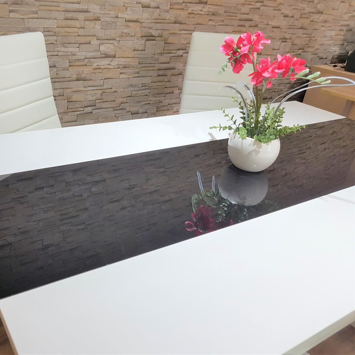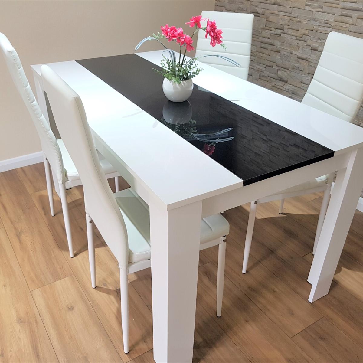Glossy white wood dining table with a black stripe in the middle painted in high UV painting. Stunning and classic white and black wood dining table with a glossy finish. Also creates a modern, homely feel. Best choice for kitchen or dining room. Hope you can enjoy the liveliest of family meals! This product has only one dining table and four black metal chairs. You can order the table with 4 or 6 stunning white chairs. Flat packed, some home assembly required, all tools are included. All chairs meet the fire resistance standards.