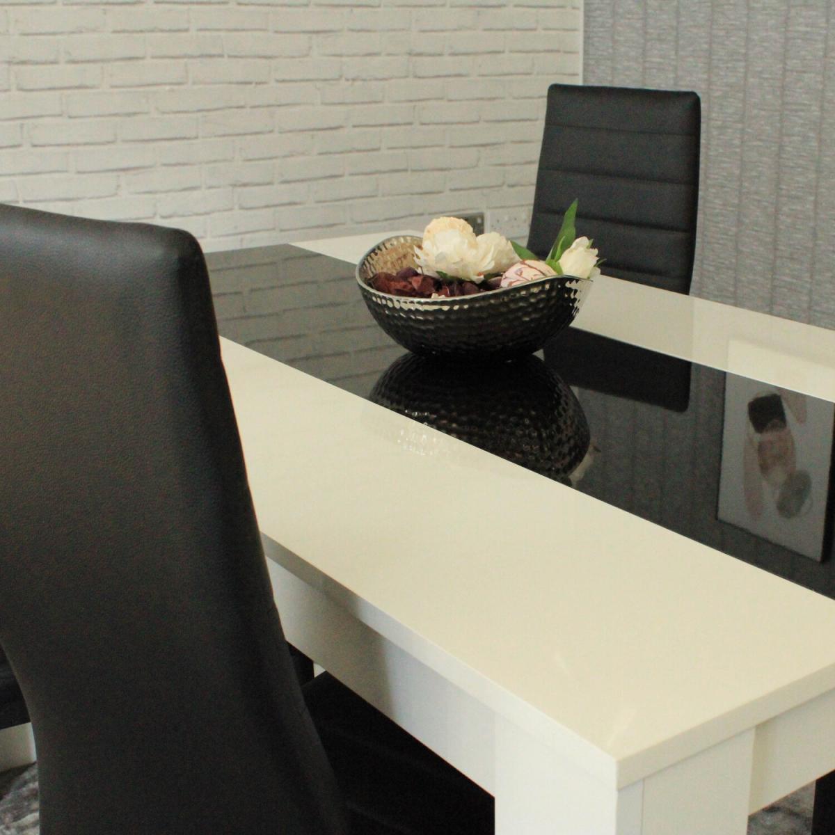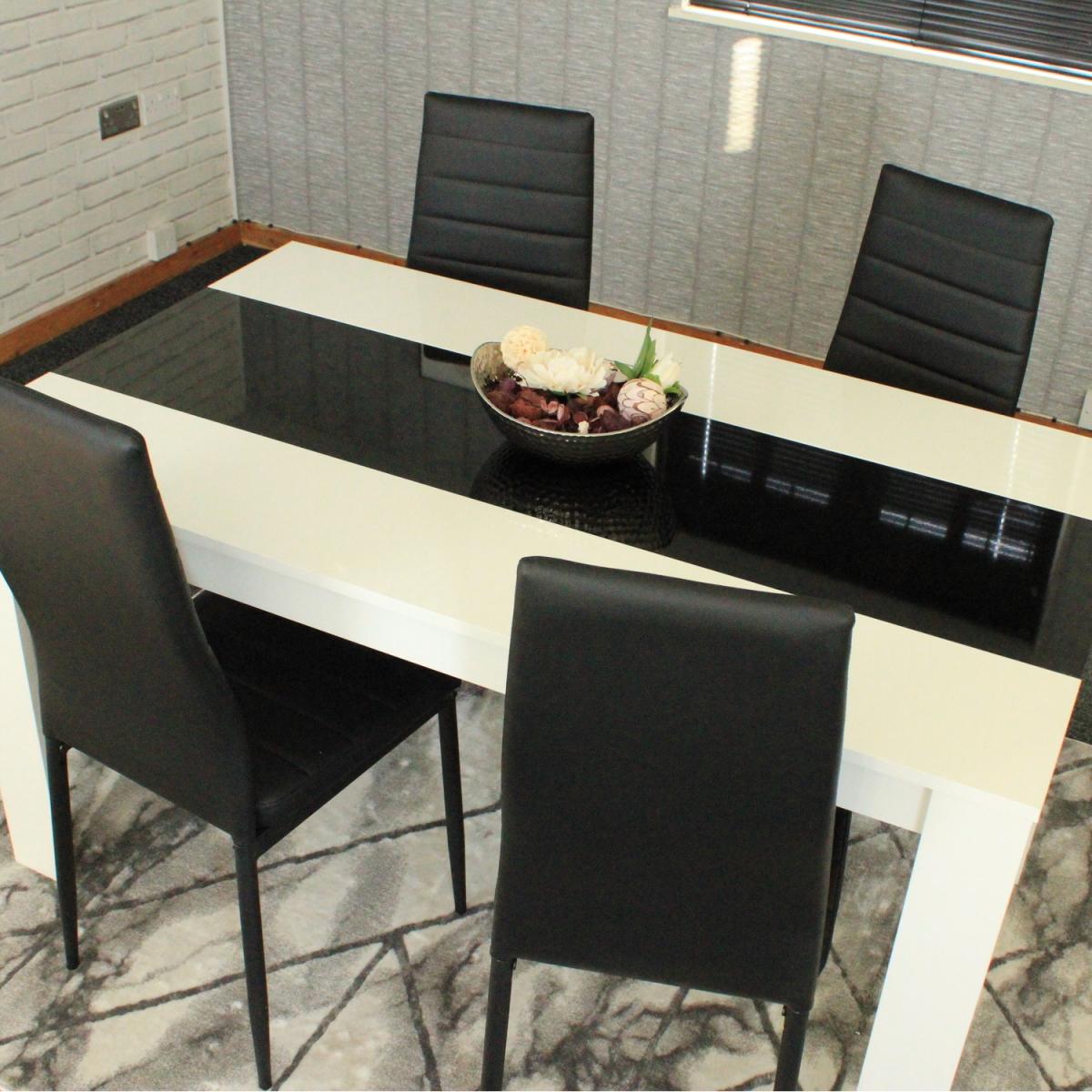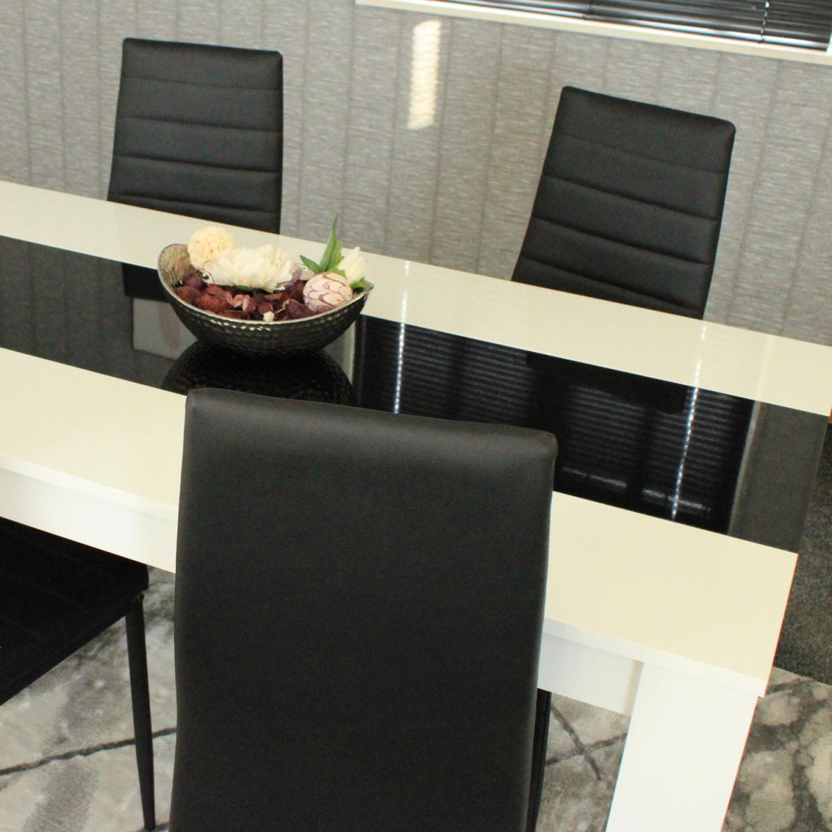 Glossy white wood dining table with a black stripe in the middle painted in high UV painting. Stunning and classic white and black wood dining table with a glossy finish. Also creates a modern, homely feel. Best choice for kitchen or dining room. Flat packed, some home assembly required, all tools are included. All chairs meet the fire resistance standards.