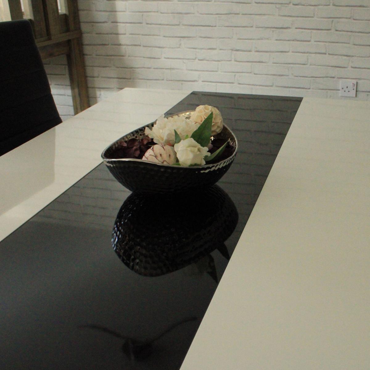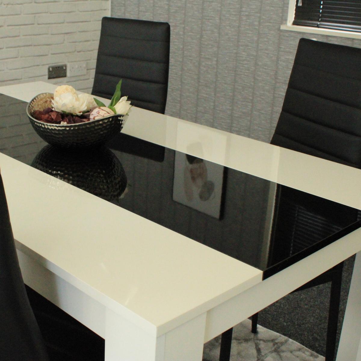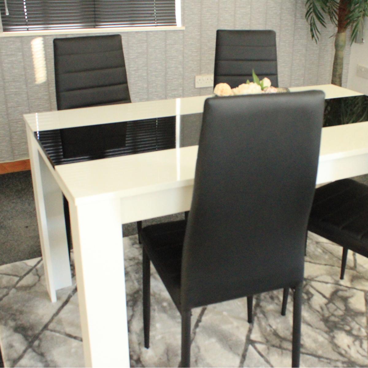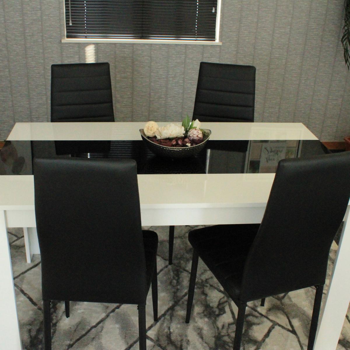 Glossy white wood dining table with a black stripe in the middle painted in high UV painting. Stunning and classic white and black wood dining table with a glossy finish. Also creates a modern, homely feel. Best choice for kitchen or dining room. Flat packed, some home assembly required, all tools are included. All chairs meet the fire resistance standards.