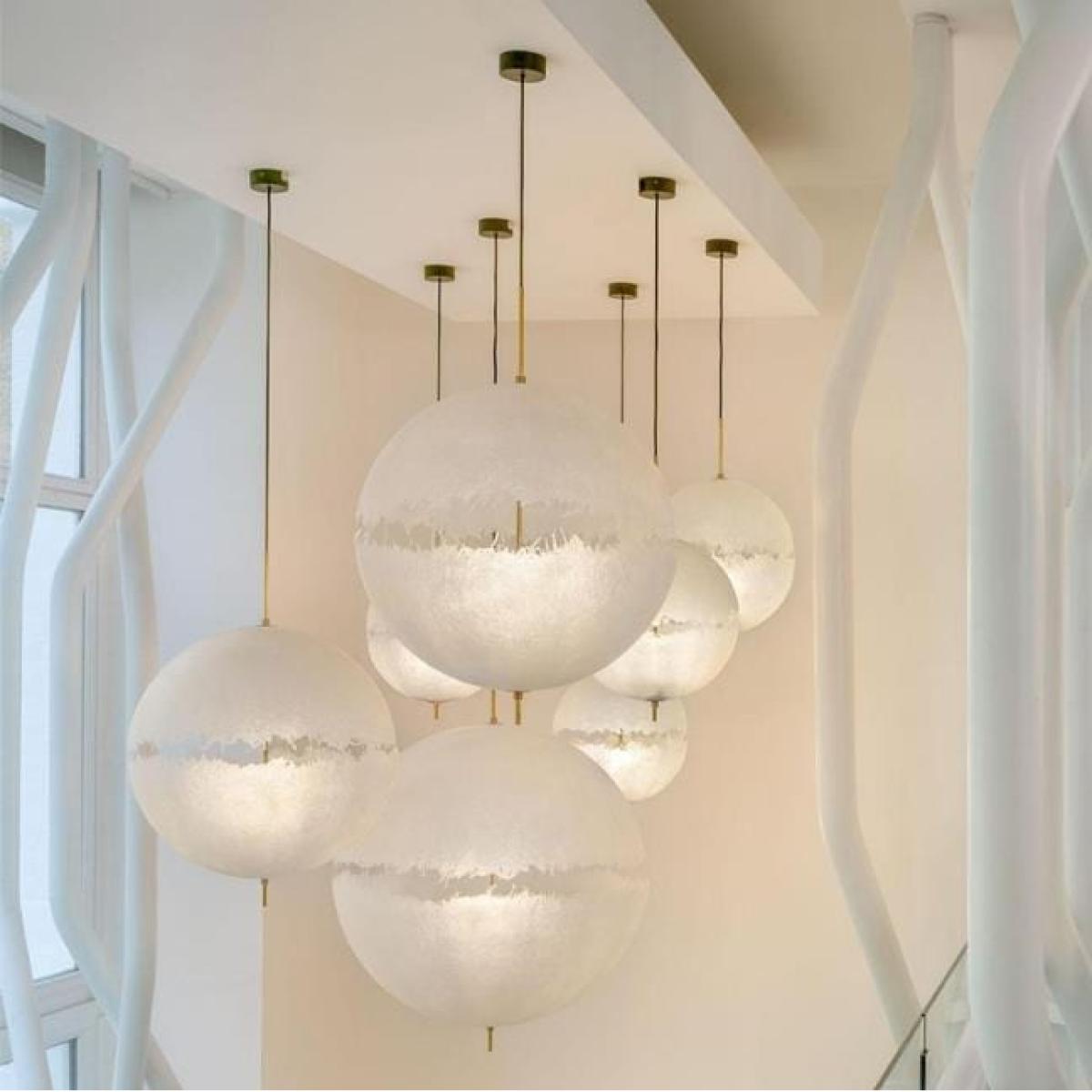 Our Moon Ceiling Light is a large pendant light that transmits a feeling of simplicity, lightness and a touch of magic in a contemporary style. Its round ball shape and furry-look material make it look like a real miniature little moon. Delicate and elegant, this ball pendant light will light up your living room, dining room or even a bedroom. Self-assembly required. This fitting has an intricate design and should be assembled by someone that is very famililar with lighting components and self-assembly furniture. This oversized pendant is sure to be a standout feature. W70cm D70cm H70cm 3 Colour White Ball Ceiling Light Tough Fibreglass & Resin Body & Gold Hardware