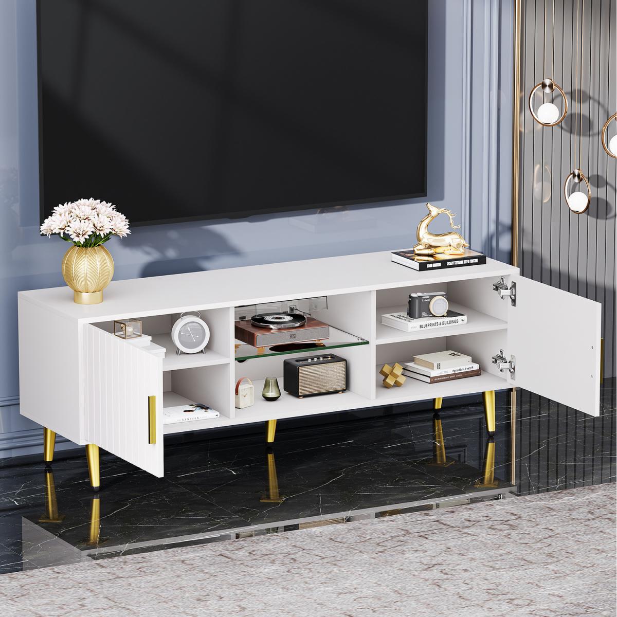 Elevate your living room decor with this modern white TV stand featuring elegant gold accents. Designed with both style and functionality in mind,this media console offers ample storage space and a sleek, contemporary look that complements any home interior. The open shelves and cabinet doors provide versatile options for organizing your media devices, books, and decorative items. Constructed from high-quality materials, this TV stand is durable and easy to assemble. Its low-profile design ensures it fits seamlessly into various room settings, making it an ideal choice for those who value both aesthetics and practicality.
