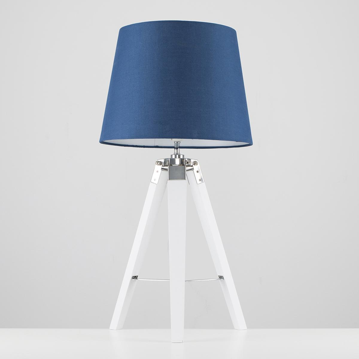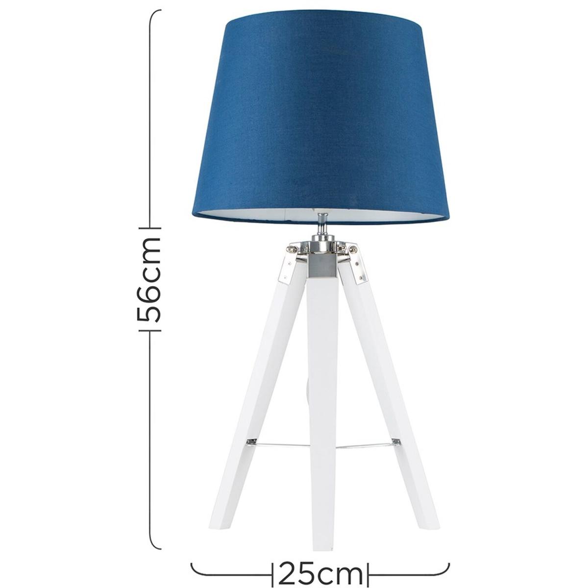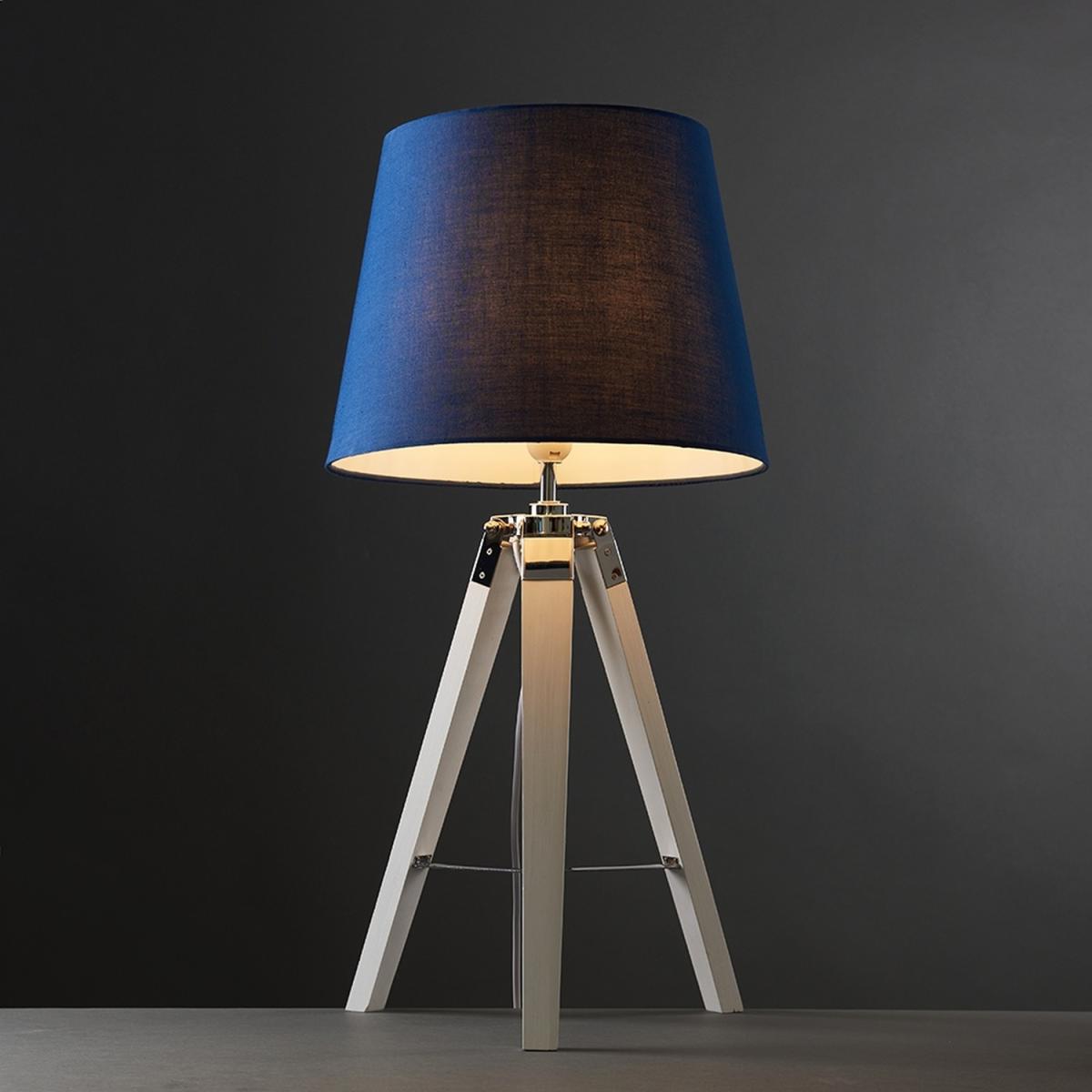 Modern tripod style table lamp in a white wood effect and silver chrome finish, which features an in-line onoff switch for easy use. complete with a navy blue tapered shade light shade. Table lamps are a great way to bring additional lighting to a room or you can use them reduce your main light output, and create a more relaxing moodatmosphere. An instant update, you can change your room style in seconds.