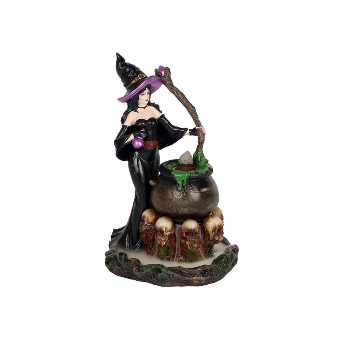 Captivate your customers with this modern witch backflow burner. Place a backflow incense cone in the cauldron and watch the wisps of smoke gently cascade over the sides. A circle of skulls and pearlescent purple accents finish off this fun style.