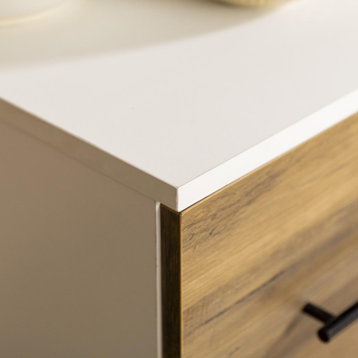 I love this piece for its versatile mix of modern white with rustic oak drawers, making it a great addition to both contemporary and farmhouse-inspired interiors. Its clean lines and practical six drawers offer ample storage, perfect for bedrooms, living rooms, or dining areas. Styling tips include pairing it with minimalist brass or black hardware, or adding textured accessories like woven baskets and ceramic vases on top to soften its look. It works particularly well when surrounded by neutral tones or faded pastel shades, giving a relaxed yet polished vibe. Keep decor simple on top to highlight its understated style, or add a statement lamp or artwork for a more curated look.