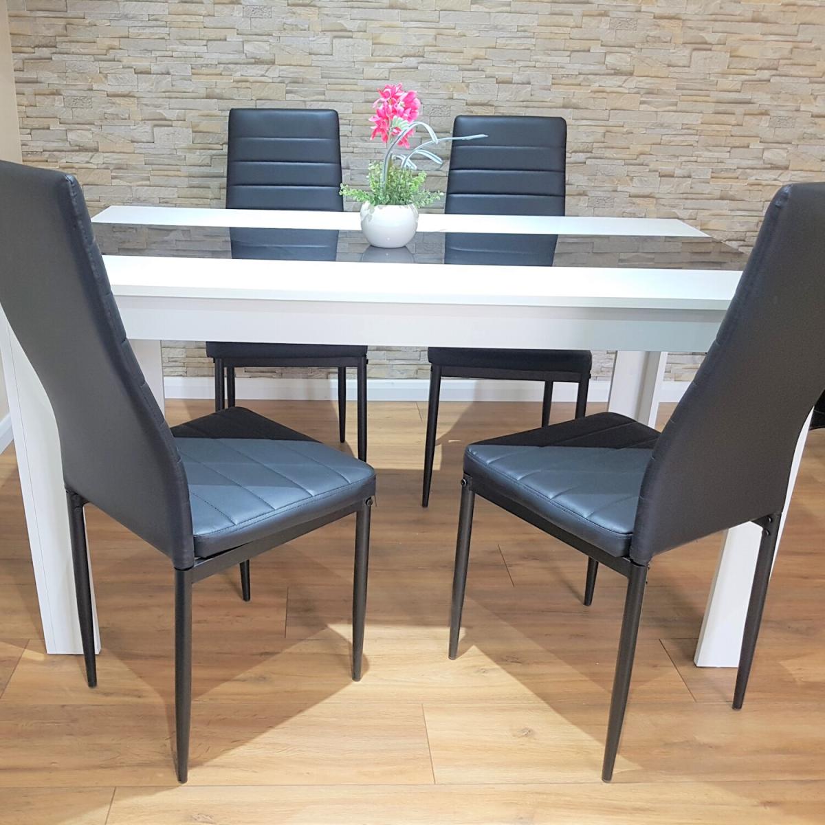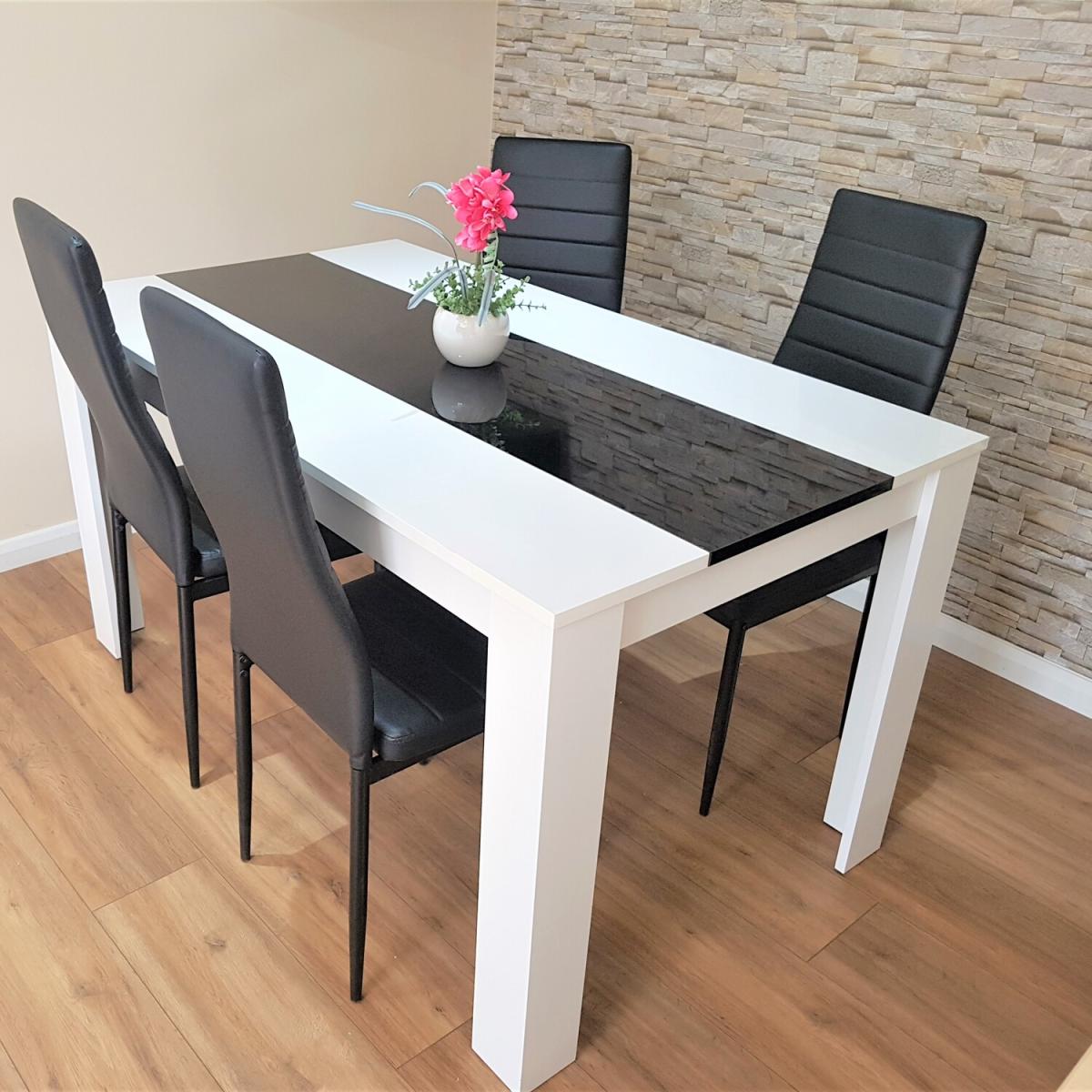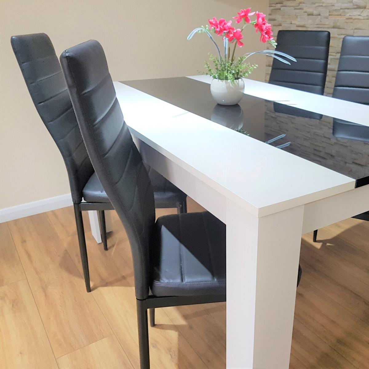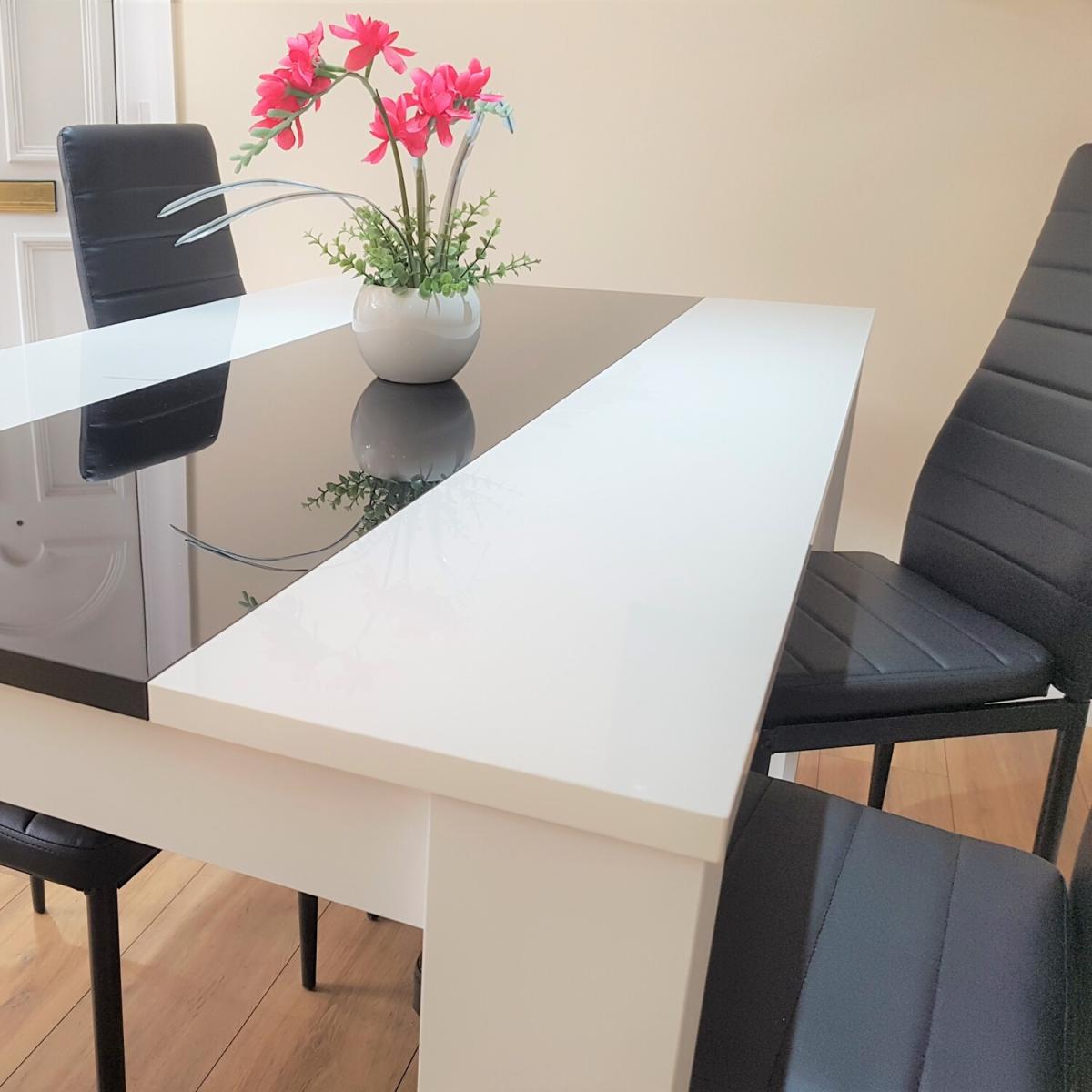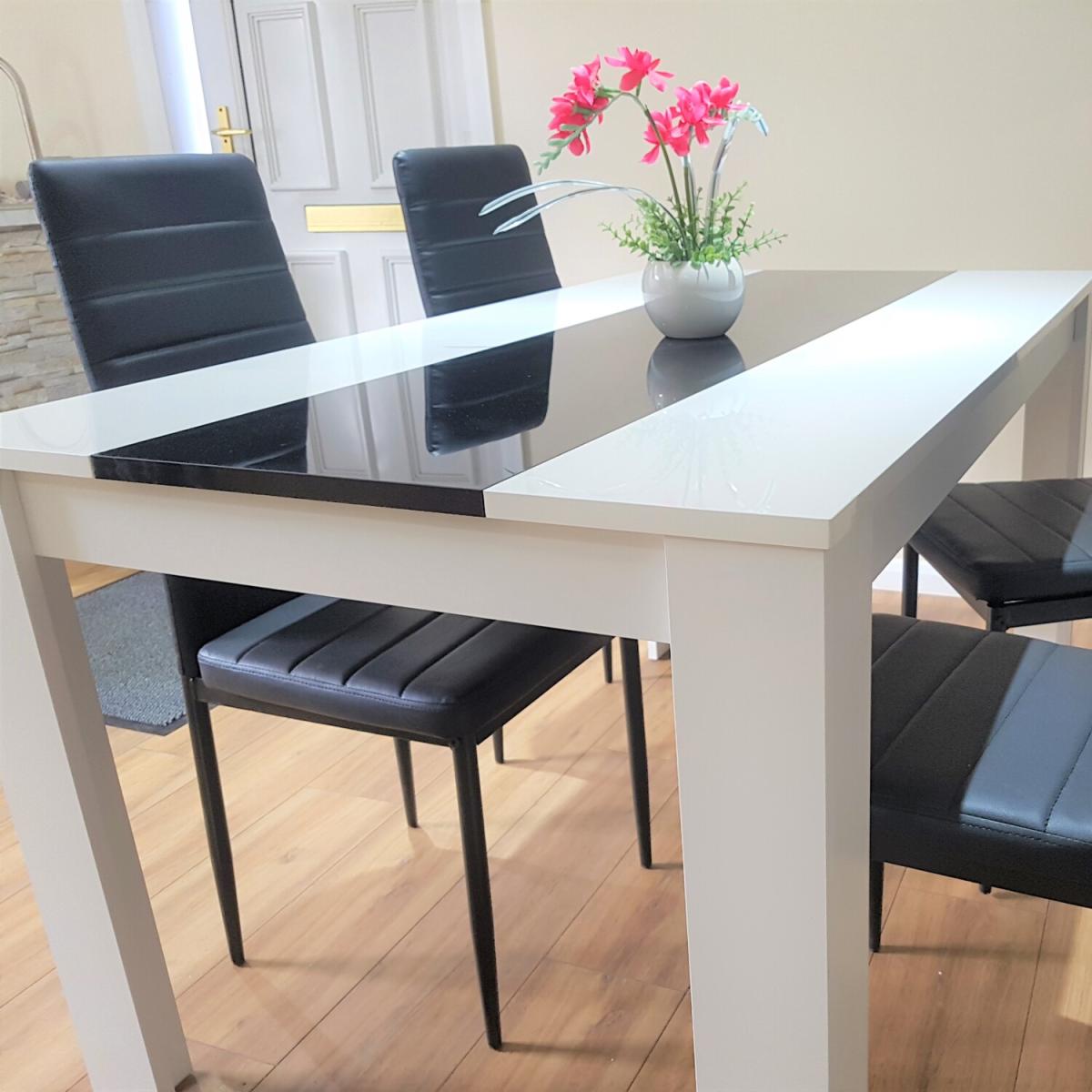 Glossy white wood dining table with a black stripe in the middle painted in high UV painting. Stunning and classic white and black wood dining table with a glossy finish. Also creates a modern, homely feel. Best choice for kitchen or dining room. Hope you can enjoy the liveliest of family meals! This product has only one dining table and four black metal chairs. You can order the table with 4 or 6 stunning black chairs. Flat packed, some home assembly required, all tools are included. All chairs meet the fire resistance standards.
