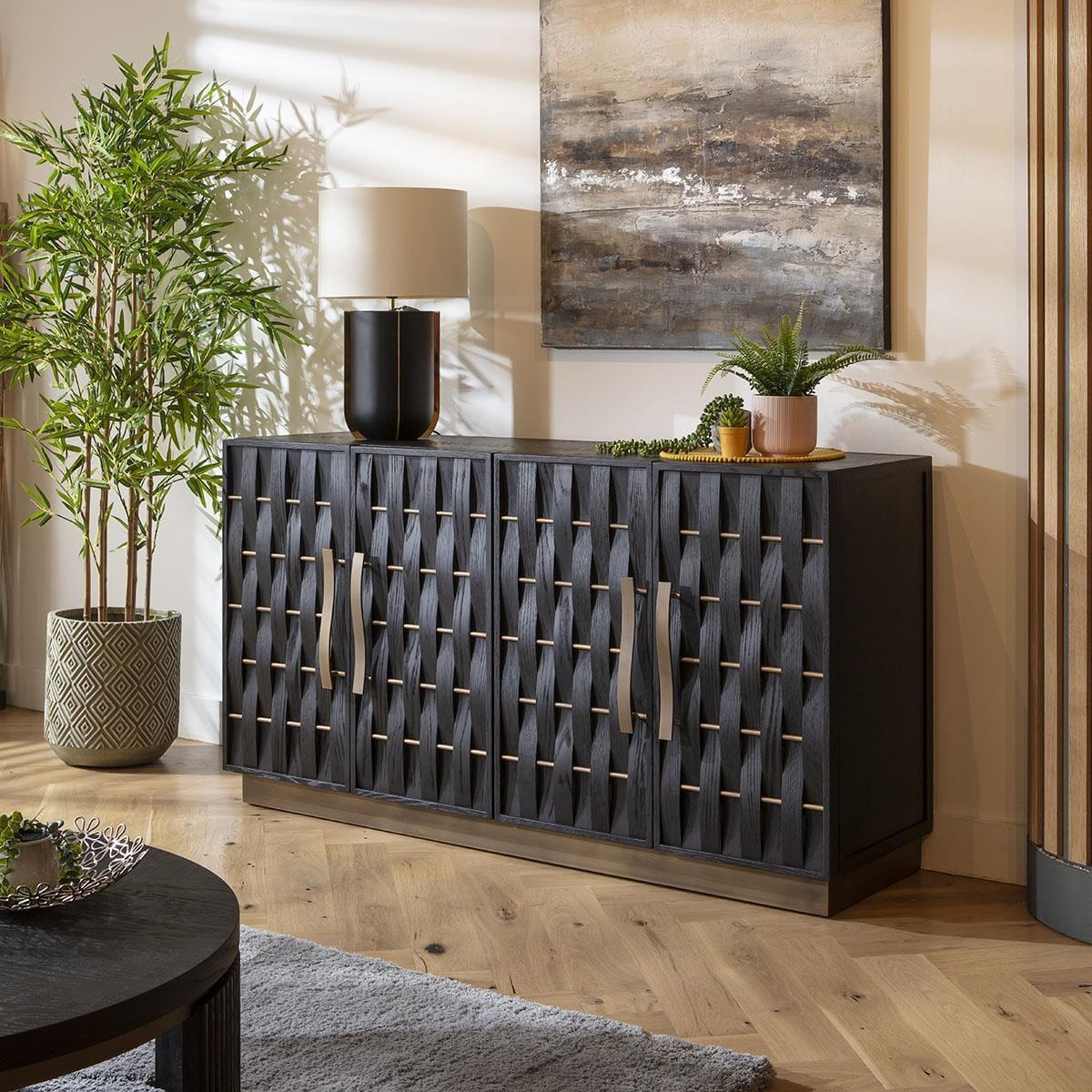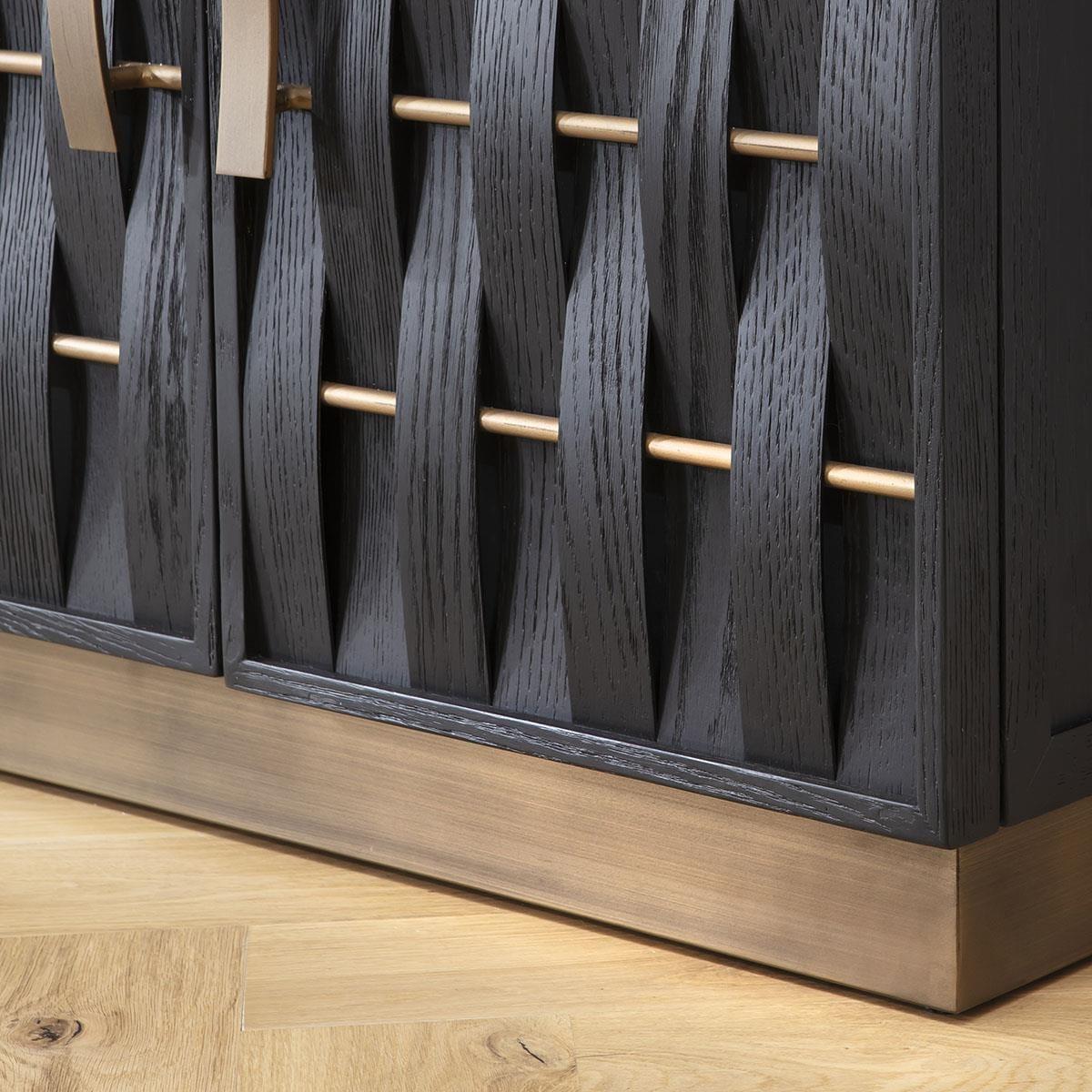The Izzy modern sideboard, a striking 160cm black sideboard cabinet that combines functionality and style. Crafted with a solid oak frame, this fully assembled mid-century modern sideboard features eye-catching woven oak veneer doors. This unique black oak sideboard is fully assembled and ready to use. This black and brass sideboard is designed to impress with its sleek lines and luxurious materials. The unit sits elegantly on a sturdy brass metal base, providing a chic contrast to the rich oak finish. brass metal accent handles with a unique wave design add a touch of sophistication, making this modern buffet a centerpiece in any room. The standout feature of this oak sideboard is its unique woven oak veneer doors, meticulously crafted with oak veneer strips interlaced between brass metal rods. The woven texture not only enhances its aesthetic appeal but also plays with light, creating a mesmerising tactile feel that invites touch. Ready to use straight out of the box, this black buffet cabinet boasts four doors with a shelf inside, making it both practical and stylish. The magnetic catch ensures secure closure, while the extra sturdy design of the welded handles guarantees durability. Enjoy effortless organisation with this elegant black wood sideboard. W160cm D45cm H86cm Shelf Sizes W68cm D41cm H32cm Preassembled