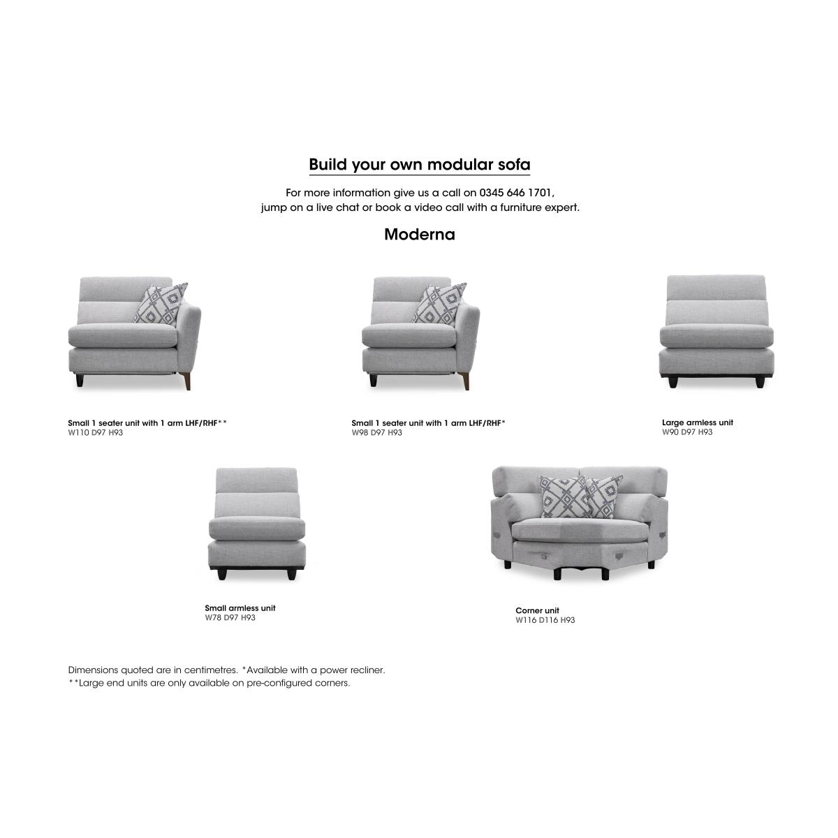 It’ll come as no surprise that a range named Moderna celebrates everything we love about modern sofas. With chic lines, elegant proportions and a touch of on-trend retro style, this range looks the part. And with sprung seats and backs for all-over support, fabulously comfy cushioning and feather scatters, your comfort is covered. The range also offers optional power elevating footrests and power telescopic headrests. And we think you’ll find Moderna’s extra touches very welcome, too. For longer-lasting comfort and style, all seat cushions are reversible – even on the power reclining sofas – and a wide choice of modular pieces makes it easy to design and redesign your perfect sofa. Handcrafted in the UK for Furniture Village. Chic, elegant and wonderfully comfortable with made-to-last reversible seat cushions, our Moderna large corner sofa is everything you want in a well-crafted modern sofa. It’s also available with power elevating footrests. Why you'll love it Elegant modern style with a touch of retro chic. Sprung seats and back for all-over support plus super-comfy cushioning. Want more? This large corner sofa is available with power elevating footrests. Built for long-lasting comfort with reversible seat cushions – even on the power recliner model. Power sofa has USB and USB-C device charging. In a fantastic selection of fashionable upholstery fabrics. Includes 4 feather accent cushions in a contrasting patterned fabric. Tapered legs in a choice of finishes. Designed to last. This corner sofa comes with a 25-year frame guarantee. Moderna is modular. Handmade in the UK for Furniture Village. This large corner sofa is part of our Moderna range. What you need to know Medium comfort level. Seat suspension: 9-gauge serpentine springs. Seat cushioning: foam core with carded fibre wrap. Cushioning is reversible. Back support: elastic webbing. Back cushioning: fibre. Cushioning is not reversible. Feet are removable. The non-power version of this sofa does not have USB and USB-C device charging. Please allow time for new recliners to ease. Minor gaps are necessary to ensure ease of recliner motion and may be exaggerated depending on floor type. To maintain cushion shape and fullness, be sure to plump daily. Rotate seat cushions for more even wear. Some fabrics can show wear on areas of more use or in direct sunlight. Clean regularly using a soft brush or vacuum with the curtain attachment. Deal with any spills promptly. Professional cleaning advised for oil- and grease-based stains. Please read our upholstery care guide for more advice. Item code: MODACL--FAB-029