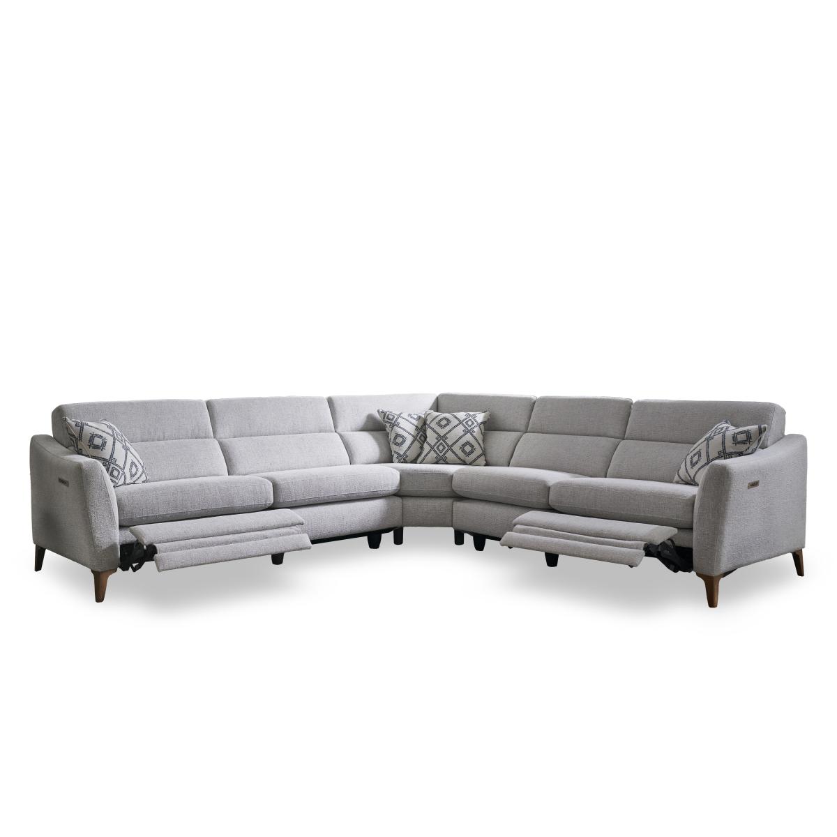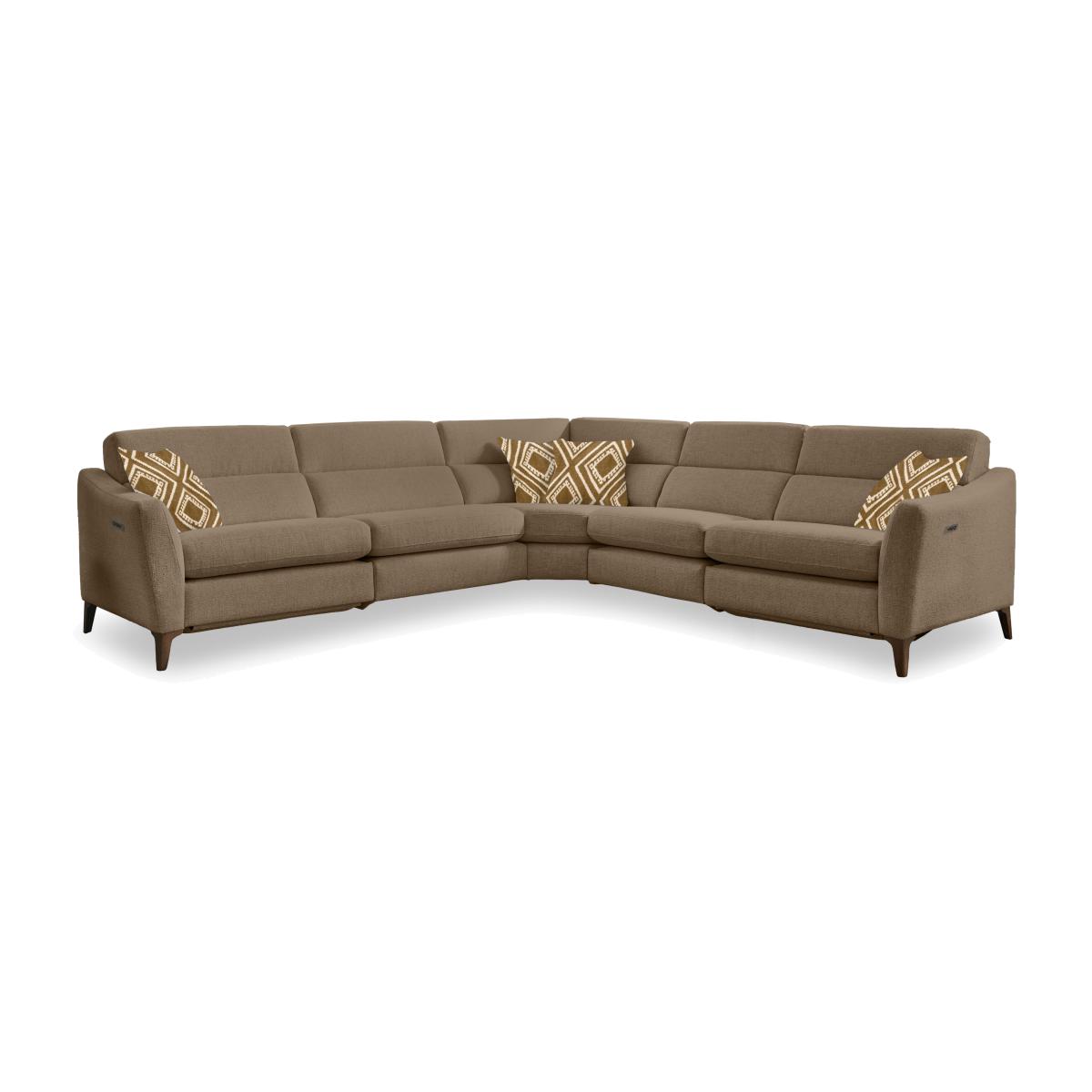 It’ll come as no surprise that a range named Moderna celebrates everything we love about modern sofas. With chic lines, elegant proportions and a touch of on-trend retro style, this range looks the part. And with sprung seats and backs for all-over support, fabulously comfy cushioning and feather scatters, your comfort is covered. The range also offers optional power elevating footrests and power telescopic headrests. And we think you’ll find Moderna’s extra touches very welcome, too. For longer-lasting comfort and style, all seat cushions are reversible – even on the power reclining sofas – and a wide choice of modular pieces makes it easy to design and redesign your perfect sofa. Handcrafted in the UK for Furniture Village. Chic, elegant and wonderfully comfortable with made-to-last reversible seat cushions, our Moderna large recliner corner sofa comes with power elevating footrests and power telescopic headrests. Why you'll love it Elegant modern style with a touch of retro chic – and plenty of power relaxation. Comes with power elevating footrests and power telescopic headrests. Sprung seats and back for all-over support plus super-comfy cushioning. Handy USB and USB-C device charging ports. Built for long-lasting comfort with reversible seat cushions. In a fantastic selection of fashionable upholstery fabrics. Includes 4 feather accent cushions in a contrasting patterned fabric. Tapered legs in a choice of finishes. Designed to last. This corner sofa comes with a 25-year frame guarantee. Moderna is modular. Handmade in the UK for Furniture Village. This large power recliner corner sofa is part of our Moderna range. What you need to know Medium comfort level. Seat suspension: 9-gauge serpentine springs. Seat cushioning: foam core with carded fibre wrap. Cushioning is reversible. Back support: elastic webbing. Back cushioning: fibre. Cushioning is not reversible. Feet are removable. Please allow time for new recliners to ease. Minor gaps are necessary to ensure ease of recliner motion and may be exaggerated depending on floor type. To maintain cushion shape and fullness, be sure to plump daily. Rotate seat cushions for more even wear. Some fabrics can show wear on areas of more use or in direct sunlight. Clean regularly using a soft brush or vacuum with the curtain attachment. Deal with any spills promptly. Professional cleaning advised for oil- and grease-based stains. Please read our upholstery care guide for more advice. Item code: MODACLPHFAB-029