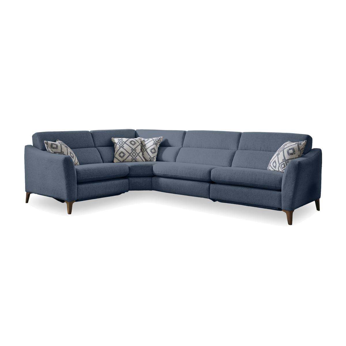 It’ll come as no surprise that a range named Moderna celebrates everything we love about modern sofas. With chic lines, elegant proportions and a touch of on-trend retro style, this range looks the part. And with sprung seats and backs for all-over support, fabulously comfy cushioning and feather scatters, your comfort is covered. The range also offers optional power elevating footrests and power telescopic headrests. And we think you’ll find Moderna’s extra touches very welcome, too. For longer-lasting comfort and style, all seat cushions are reversible – even on the power reclining sofas – and a wide choice of modular pieces makes it easy to design and redesign your perfect sofa. Handcrafted in the UK for Furniture Village. Chic, elegant and wonderfully comfortable with made-to-last reversible seat cushions, our Moderna corner sofa is everything you want in a well-crafted modern sofa. It’s also available with power elevating footrests. Why you'll love it Elegant modern style with a touch of retro chic. Sprung seats and back for all-over support plus super-comfy cushioning. Want more? This corner sofa is available with power elevating footrests. Built for long-lasting comfort with reversible seat cushions – even on the power recliner model. Power sofa has USB and USB-C device charging. In a fantastic selection of fashionable upholstery fabrics. Includes 4 feather accent cushions in a contrasting patterned fabric. Tapered legs in a choice of finishes. Designed to last. This sofa comes with a 25-year frame guarantee. Moderna is modular. Handmade in the UK for Furniture Village. This corner sofa is part of our Moderna range. What you need to know Medium comfort level. Seat suspension: 9-gauge serpentine springs. Seat cushioning: foam core with carded fibre wrap. Cushioning is reversible. Back support: elastic webbing. Back cushioning: fibre. Cushioning is not reversible. Feet are removable. The non-power version of this sofa does not have USB and USB-C device charging. Please allow time for new recliners to ease. Minor gaps are necessary to ensure ease of recliner motion and may be exaggerated depending on floor type. To maintain cushion shape and fullness, be sure to plump daily. Rotate seat cushions for more even wear. Some fabrics can show wear on areas of more use or in direct sunlight. Clean regularly using a soft brush or vacuum with the curtain attachment. Deal with any spills promptly. Professional cleaning advised for oil- and grease-based stains. Please read our upholstery care guide for more advice. Item code: MODALC--FAB-001