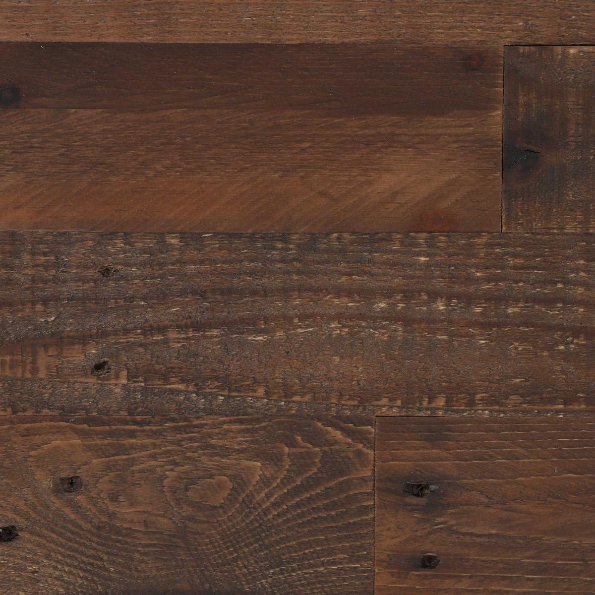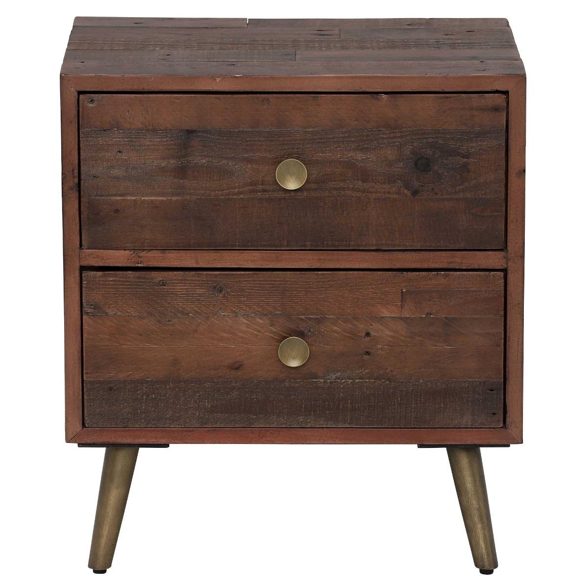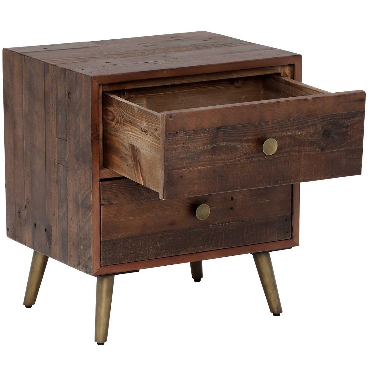 Design. Rustic reclaimed wood gives rugged charm to this modern design. Full of personality, the timber showcases natural markings and colourings that make each Modi bedside table one of a kind. The multi-tonal finish complements almost any colour scheme, from warm neutrals to dark industrial hues. Brass accents to the handles and legs provide a polished finish, reminiscent of mid-century style. Perfect for housing your essential electronics, beauty products and current read, this bedside chest offers a spacious surface up top, as well as two drawers to keep things tidy. Pair with the coordinating bed frame, wardrobe and more for effortless cohesion.