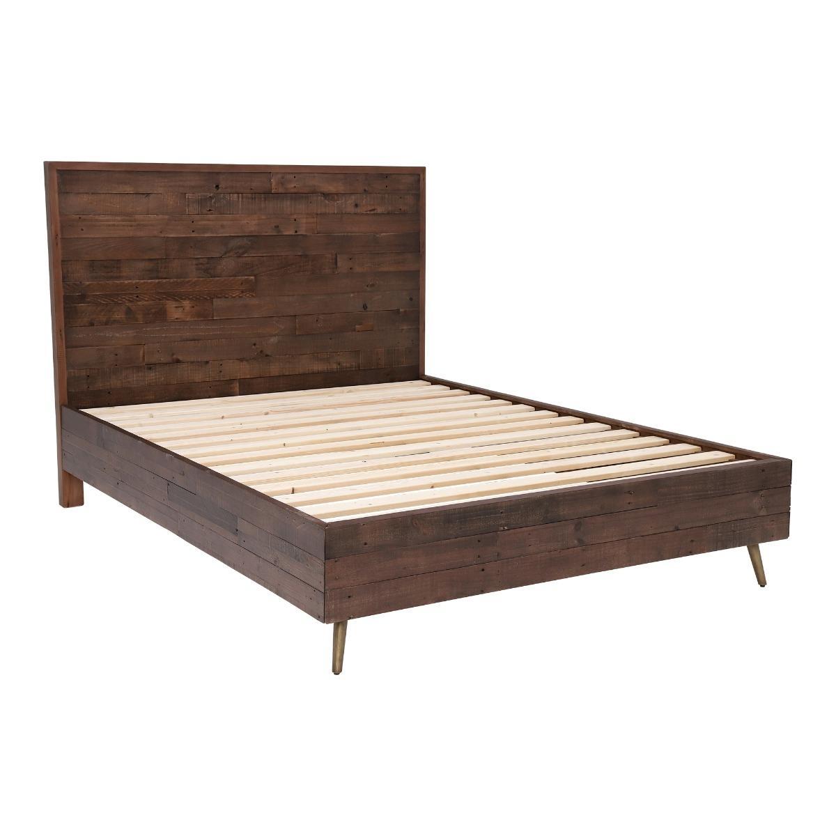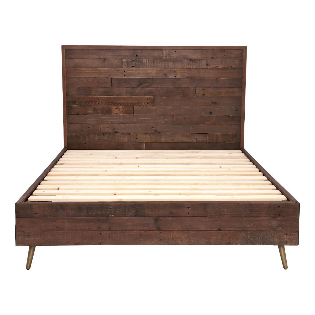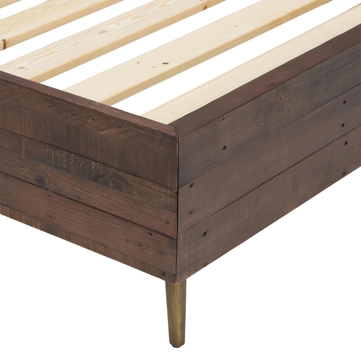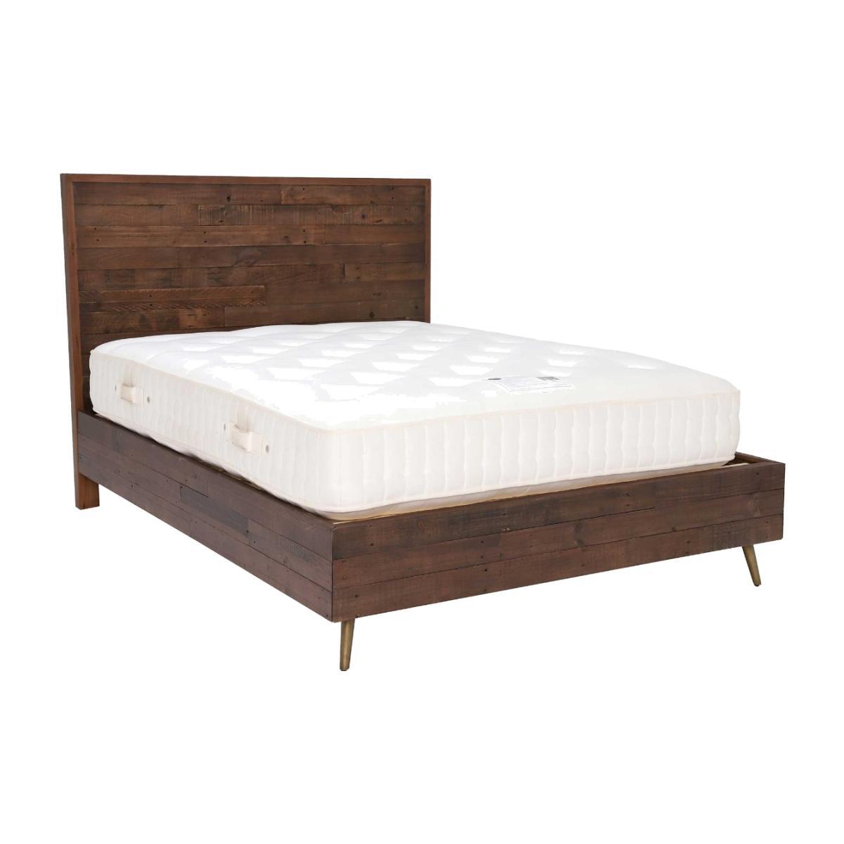 Design. With its streamlined silhouette and sharp splayed legs, the Modi bed frame brings mid-century style straight into the modern day. A generously sized headboard ensures maximum impact, showcasing the gorgeous natural colourings of the reclaimed timber. Thanks to individual wood markings and signs of previous use, no two beds are exactly alike – so you can rest easy in the knowledge that your piece is entirely unique. Brass metal feet give Modi a final touch of beauty, raising the frame off the ground to offer a sense of space. The Modi bedroom furniture range also includes chests of drawers, a bedside table, a wardrobe and a blanket box.