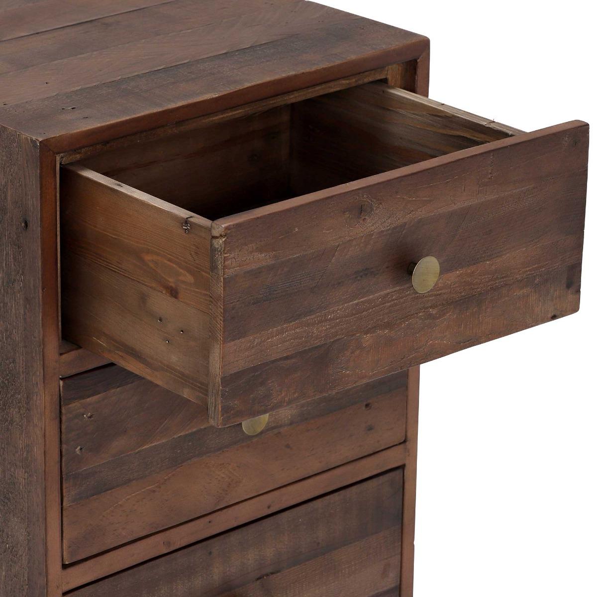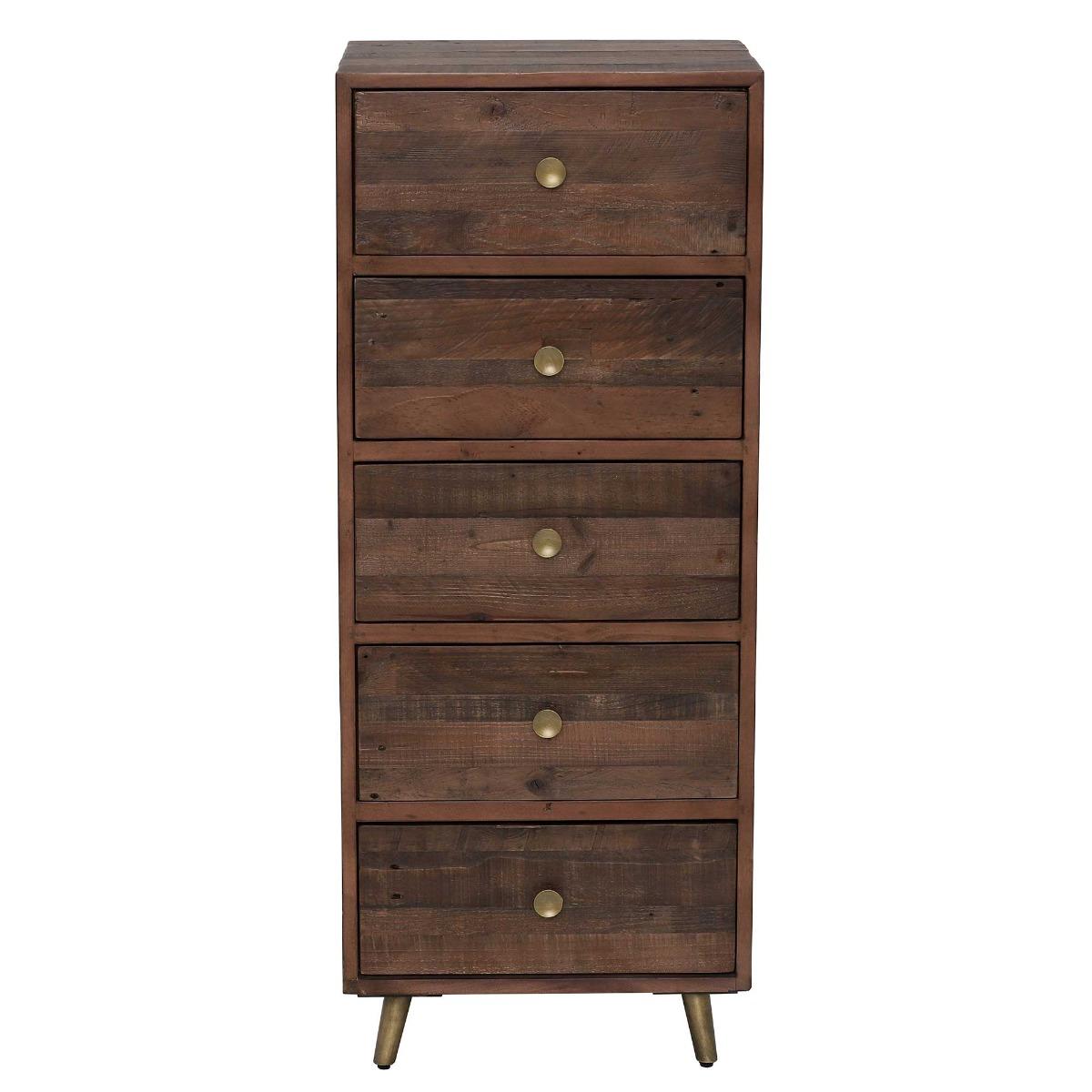 Making the most of narrow spaces, the Modi 5 drawer tallboy offers convenient storage for clothing and more. Built from reclaimed wood thats full of personality, it brings with it a sense of character and charm. Further enhanced by a rustic finish, the natural qualities of the timber make each piece unique, so you can enjoy a home thats entirely yours. A gorgeous detail, the chests dainty metal handles and mid-century style legs add a vintage touch in metallic brass. Match with the coordinating bedroom furniture for effortless cohesion.