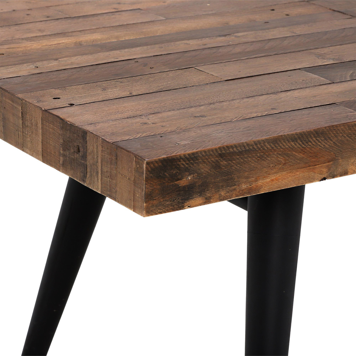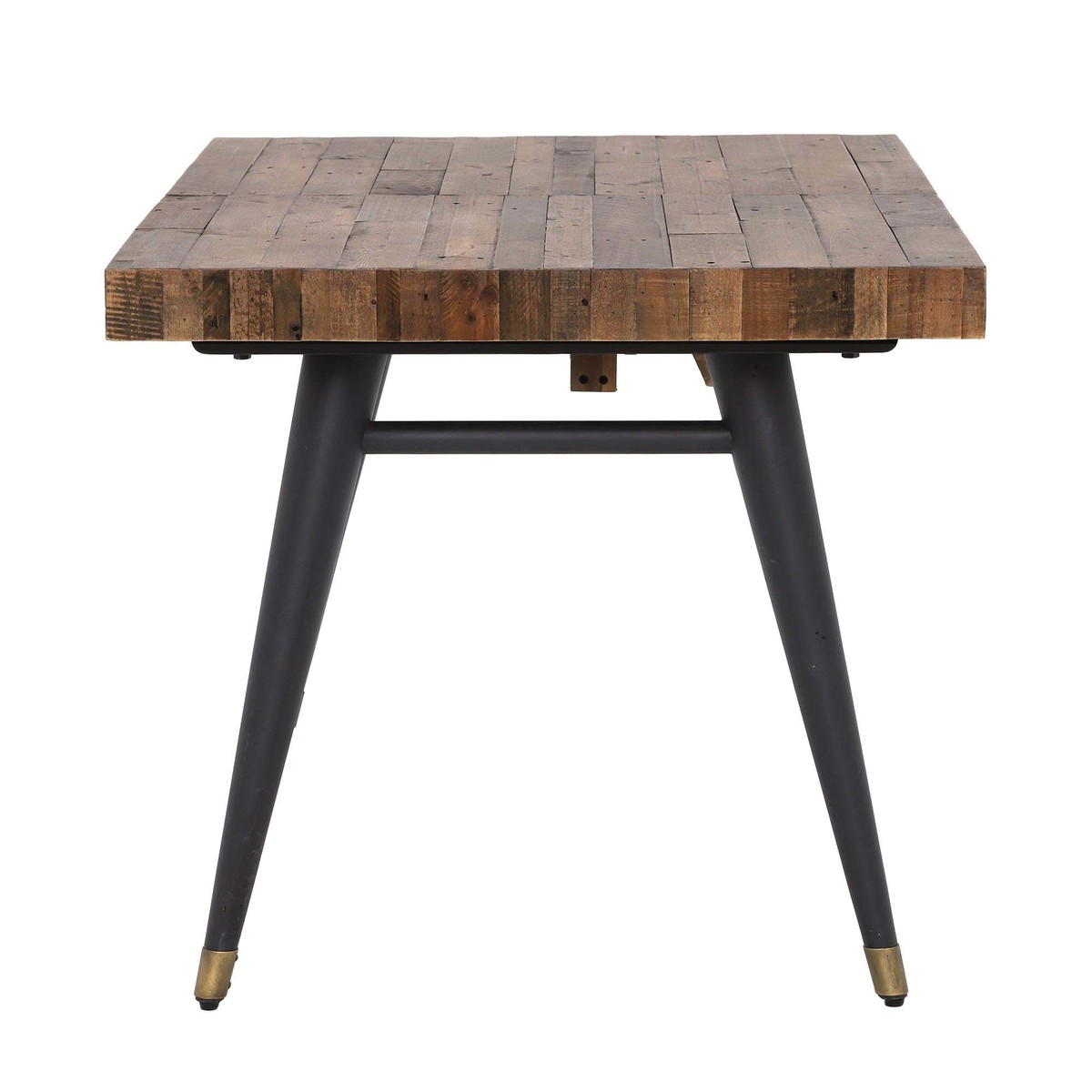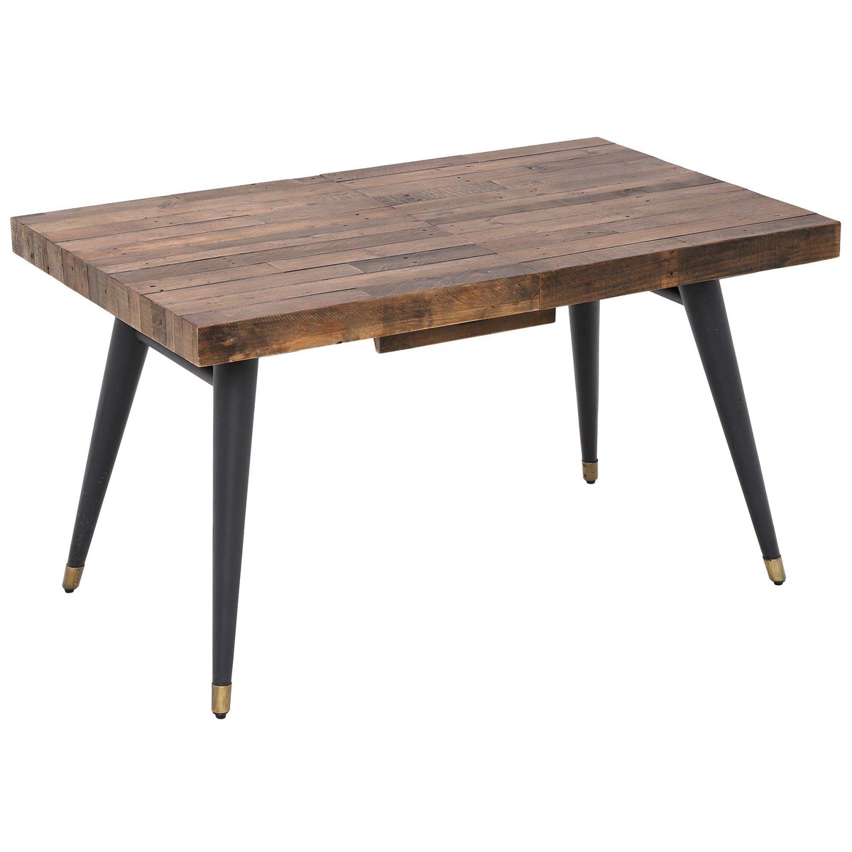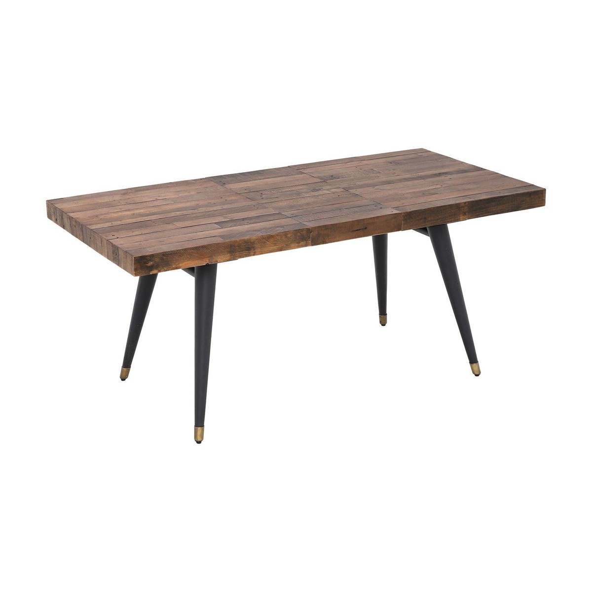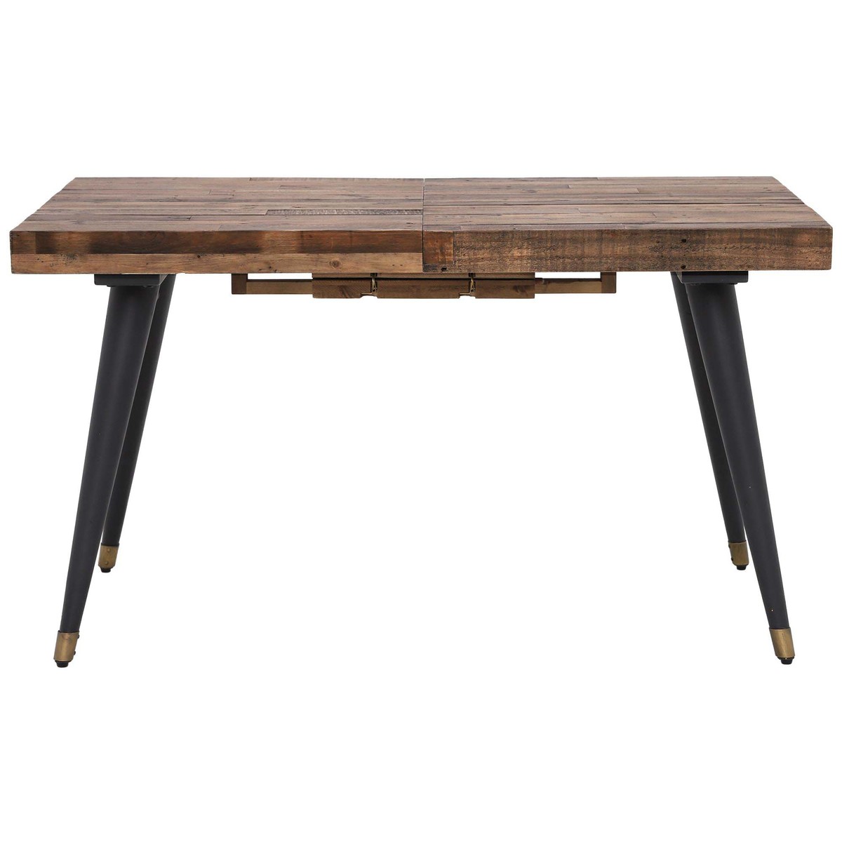 Rustic and contemporary, the Modi Extending Dining Table has a bold and charming look through a reclaimed wooden top, featuring its own natural knots and grain, and black legs with elegant brass caps. Featuring a base this is both tapered and splayed, the Modi adds an elegant air to any home and is ideal for dining or large kitchen areas. Perfect for a range of spaces, the Modi has a wonderfully extending feature, making room for all the family and unexpected visitors.