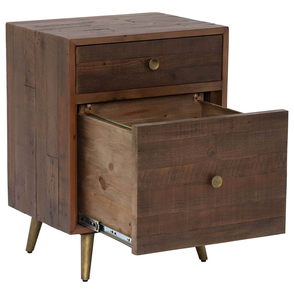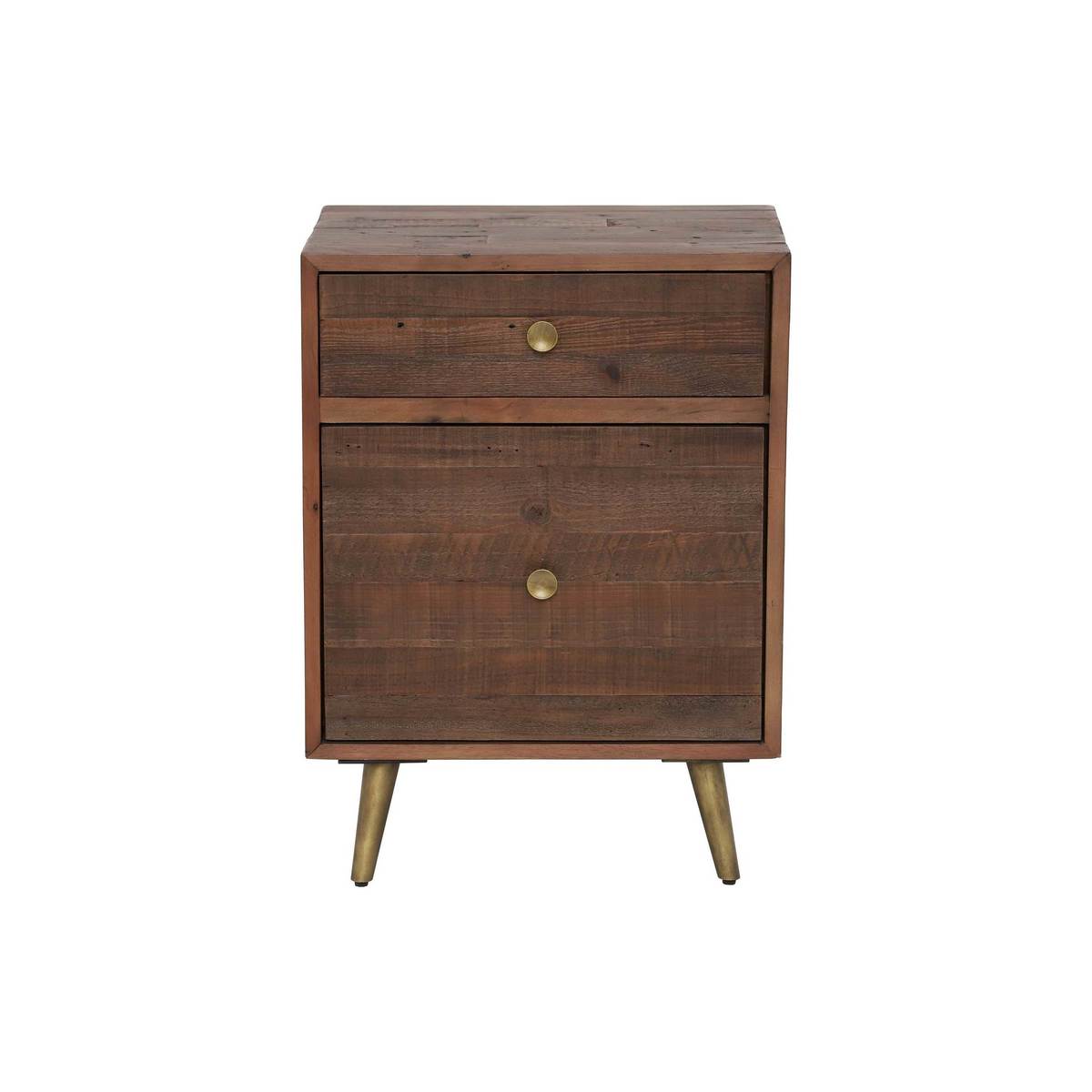 A stylish addition to any office space, the Modi reclaimed wood filing cabinet brings together mid-century design and modern values. Sustainably sourced, its timber frame features individual markings and grains that make it like no other piece of furniture.;Finished in rustic saddle tan, it complements a spectrum of colour schemes – from fresh whites to warm neutrals to moody hues. Elegant brass handles and legs inject vintage charm, while a deep filing drawer and additional smaller drawer ensure those important items are always easy to find.;Coordinating desk and furniture also available.