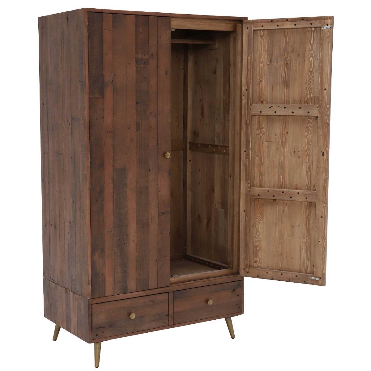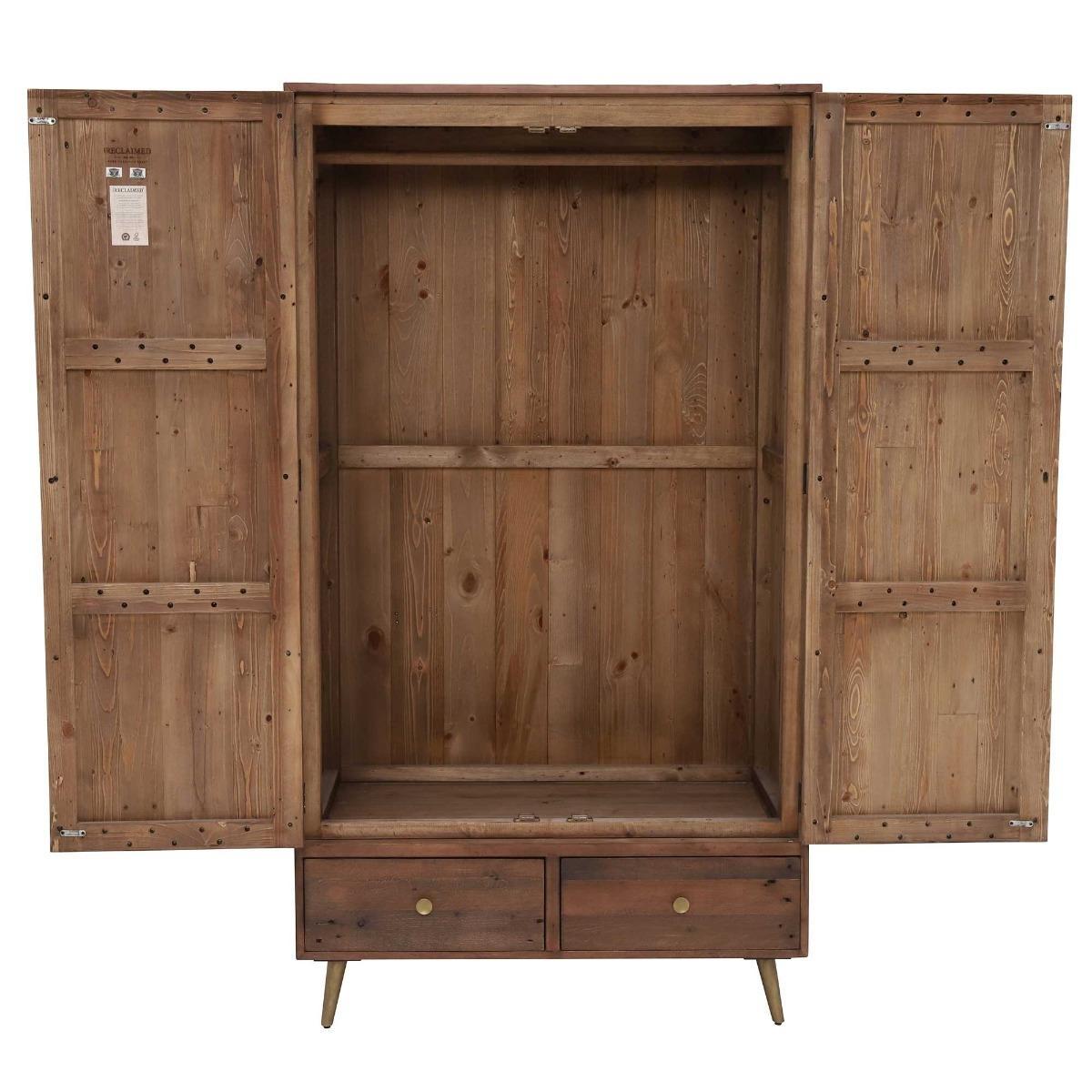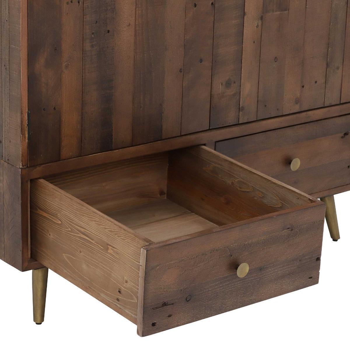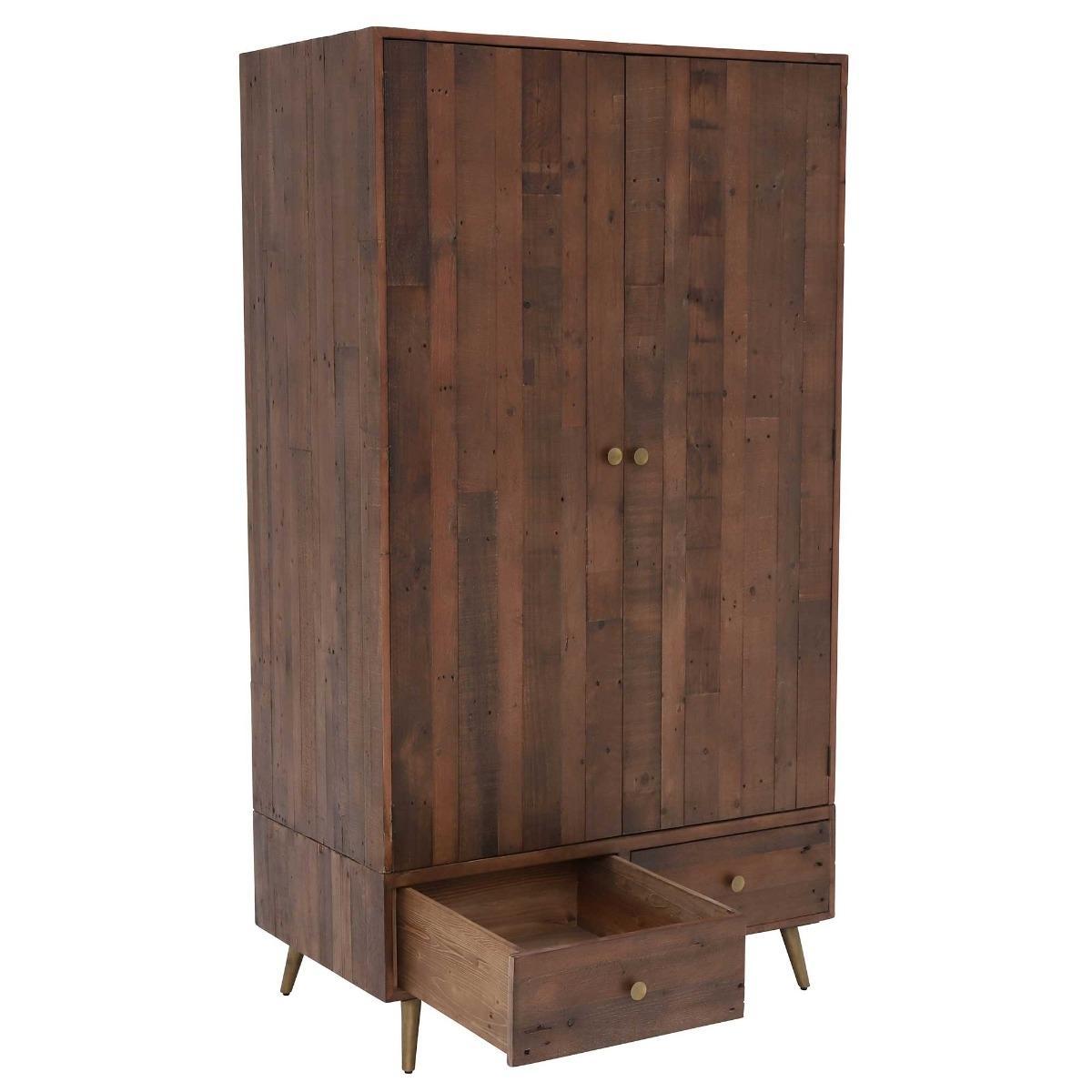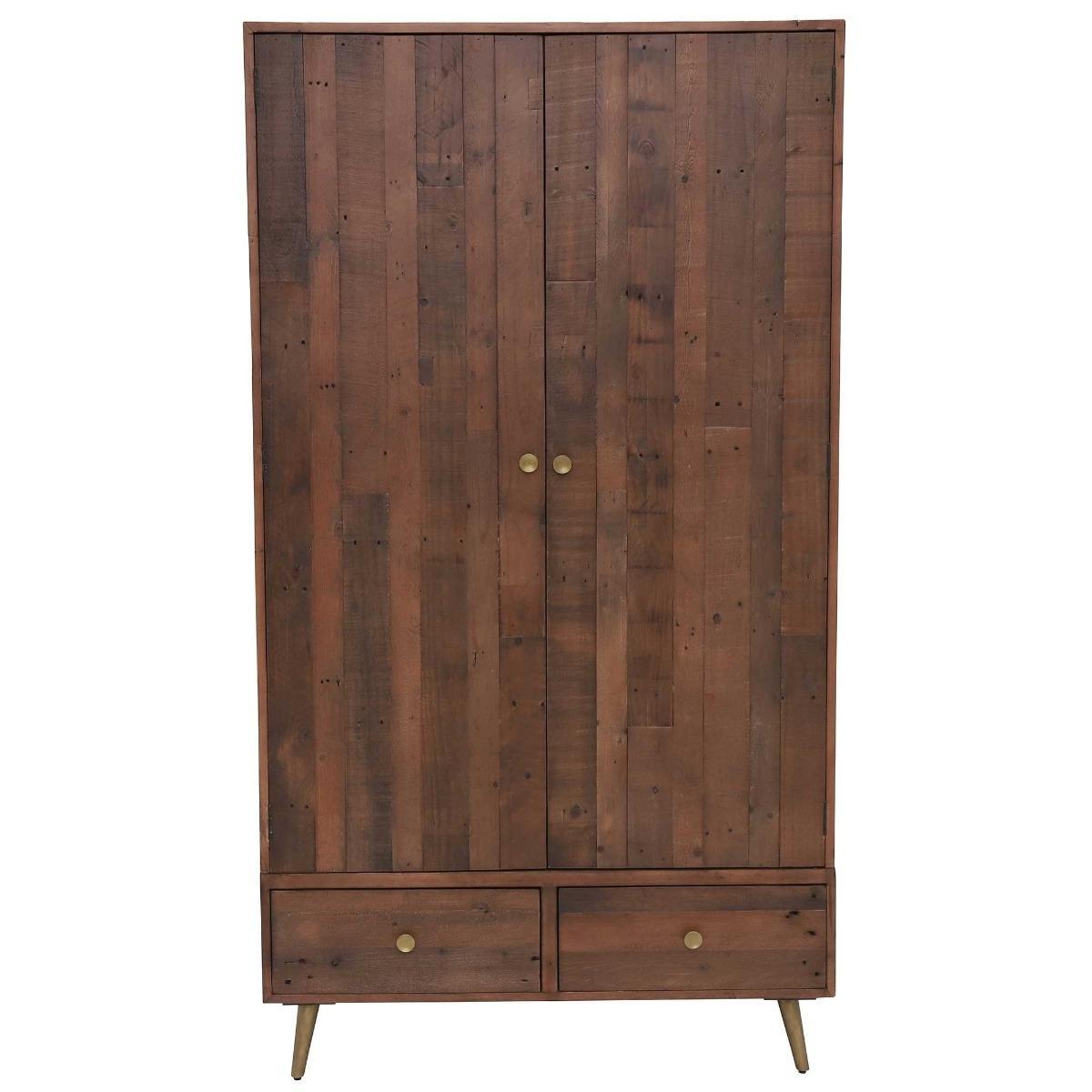 Design. Beautifully crafted from reclaimed wood, the Modi wardrobe is rich with mid-century modern style. The natural tones and markings of the timber are enhanced by a rustic saddle tan finish, which is perfectly complemented by warm brass handles and legs. Offering plentiful storage space inside, it features a full hanging rail and two handy drawers. Simple in shape, but suitably stunning, it can be paired with the coordinating bedroom furniture for a cohesive look.