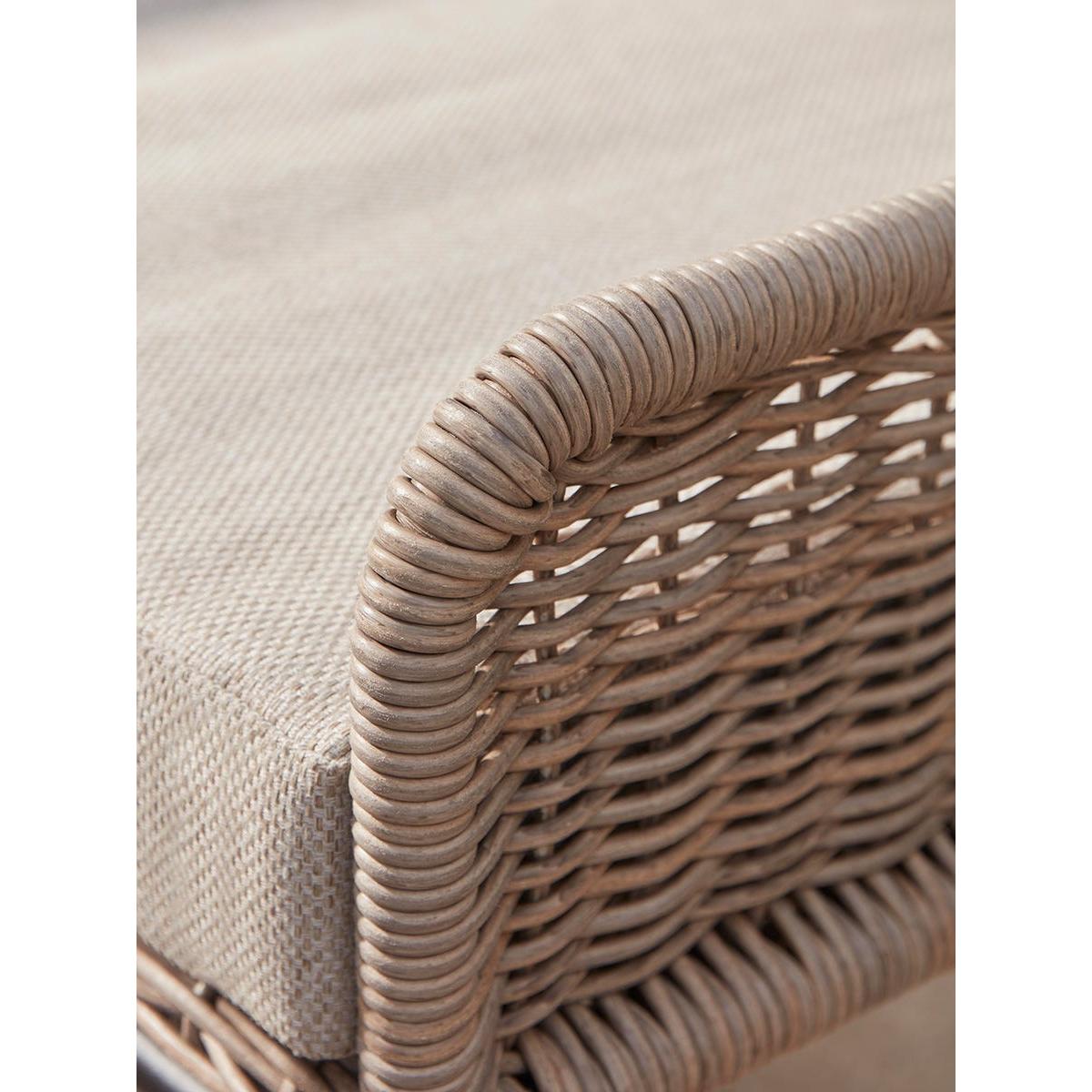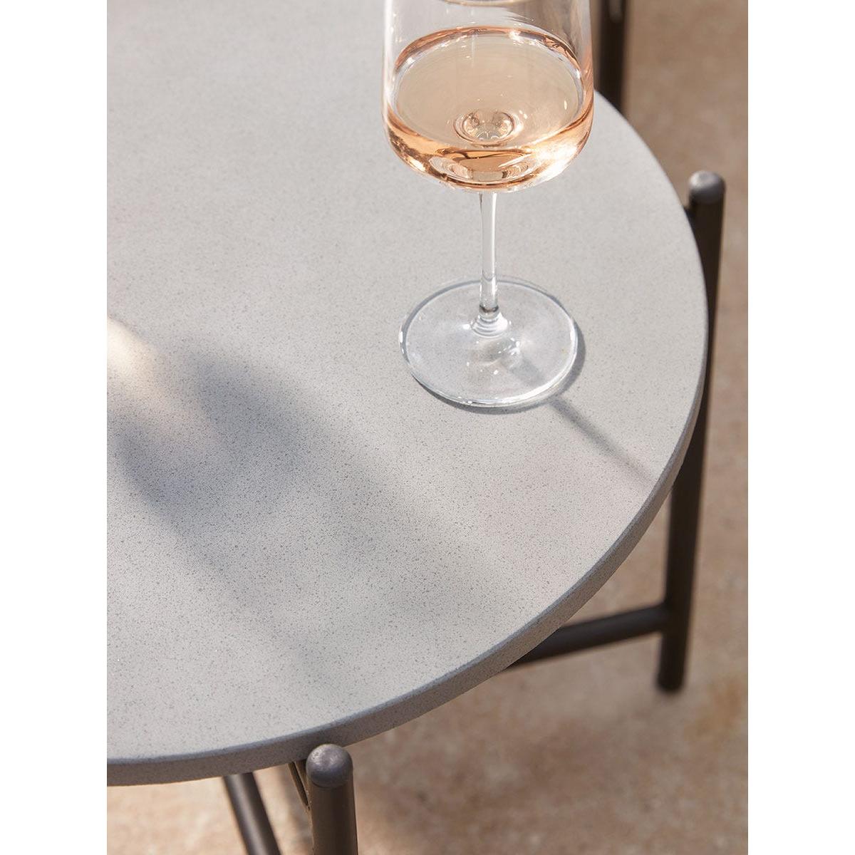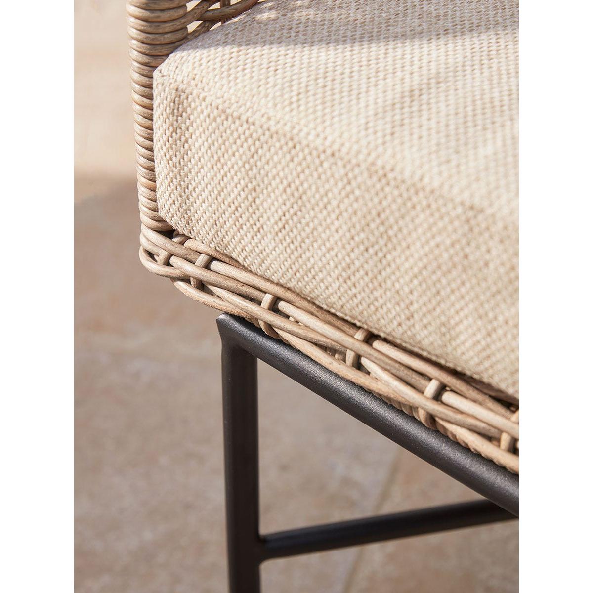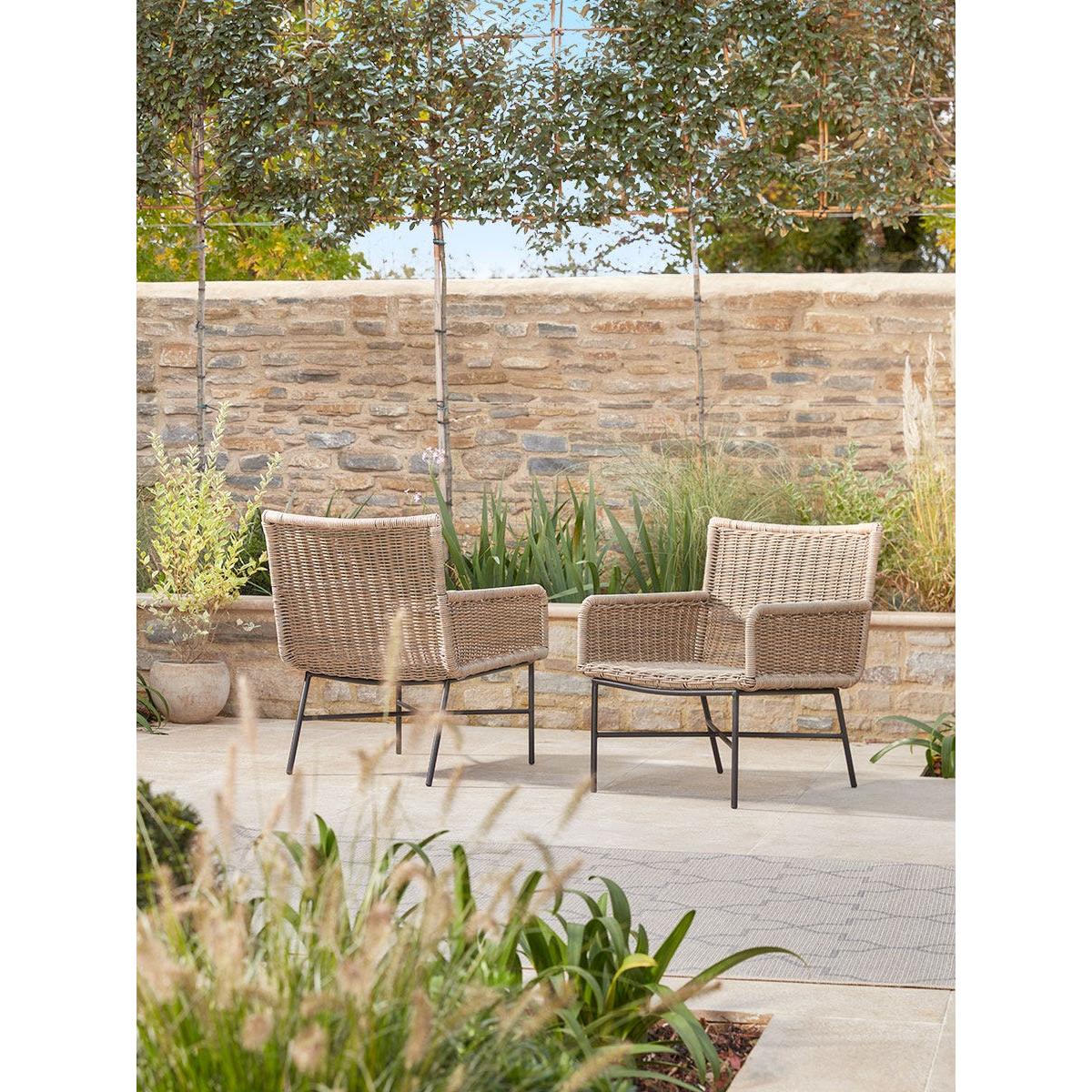 The contemporary line of our Modica Bistro set, with its simple black steel tube frame, is immediately softened by the warm toned faux wicker of the seats themselves. The two deep, well-proportioned armchairs have plump seat and back cushions in a light toned woven fabric. The small round table has a silver-grey top, which adds a nice contrast. This set is perfect for a small patio, or nestled within a quiet corner of a cottage garden.