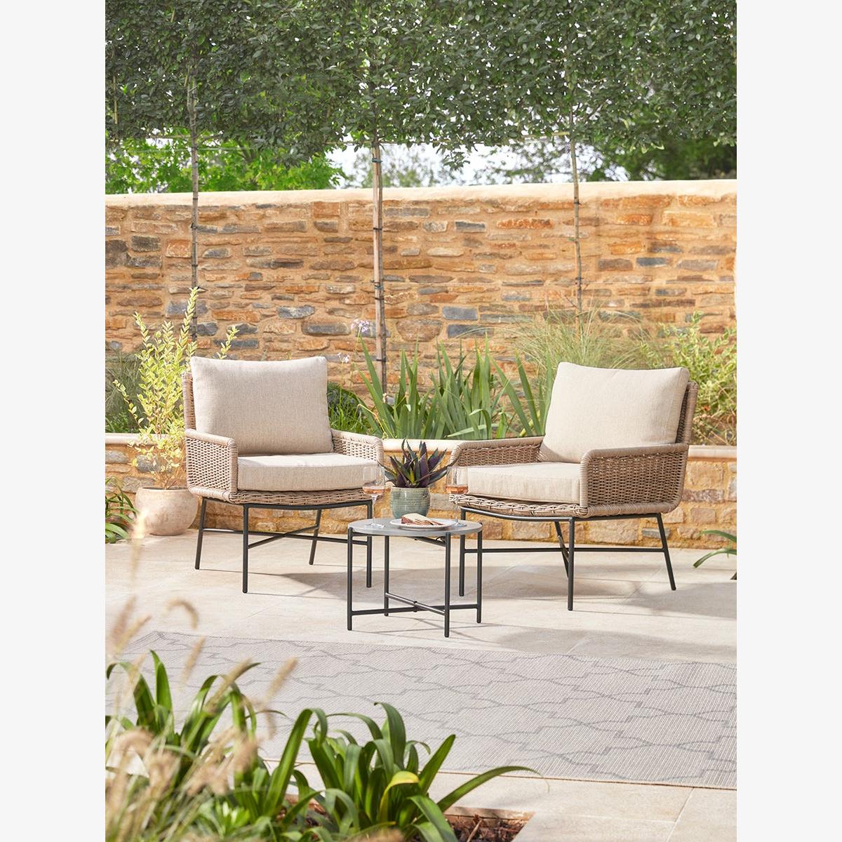 I love this bistro set for its versatile, contemporary look that works well in both modern and traditional garden spaces. Its rattan weave offers a relaxed, natural vibe, making it perfect for styled outdoor lounges or smaller patios. A practical styling tip is to keep the cushions neutral or in muted tones to allow flexibility with accessories, such as colourful cushions or throws, for seasonal updates. To optimise its aesthetic, pair it with lush greenery or statement planters to create a cosy, inviting corner that feels effortlessly stylish. This set also lends itself well to layered textures and simple, elegant tableware, making outdoor entertaining both easy and attractive.