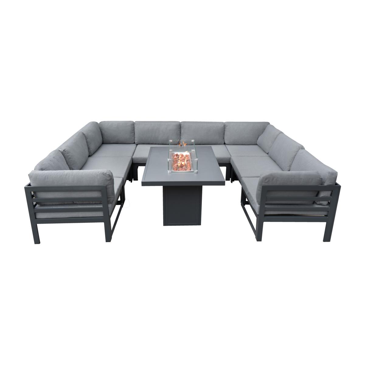 Indulge in the epitome of outdoor luxury with our exquisite modular garden set and fire pit. Immerse yourself in a contemporary oasis that seamlessly blends comfort, functionality, and modern aesthetics. Crafted from premium grey aluminium, this modular sofa set not only boasts lasting durability but also exudes timeless style. Its modular design, featuring eight spacious seats, allows for customisable arrangements, making it versatile for various outdoor occasions - be it hosting lively gatherings or creating an intimate personal sanctuary. Central to this exceptional set is the ingeniously designed fire pit table, adding a captivating element to your outdoor experience. Nestled seamlessly into the table's surface and filled with natural volcanic rocks, the fire pit becomes the focal point, casting a warm and inviting glow that transforms your outdoor space into a cosy haven. The large tabletop provides a generous surface for dining or entertaining, creating a versatile space for shared meals or outdoor gatherings. Additionally, the cleverly designed fire pit table conceals the required gas bottle within, ensuring a sleek and aesthetically pleasing appearance. Sink into the ultimate comfort provided by the plush cushions, designed to enhance relaxation, and create a luxurious retreat right in your garden. The removable and washable covers make maintenance a breeze, ensuring that your outdoor living space remains fresh and inviting season after season. To safeguard your modular set, it comes complete with a rain cover made of robust 600. D Oxford fabric, providing reliable protection for your furniture against the elements. Assemble your patio set effortlessly with all fixings included, allowing you to focus on enjoying your new sanctuary without the hassle. Transform your garden into a haven of relaxation and entertainment with this meticulously designed modular garden set and fire pit.