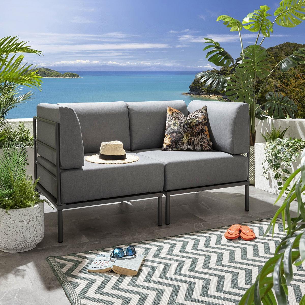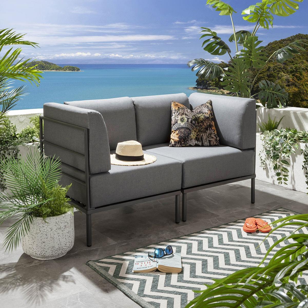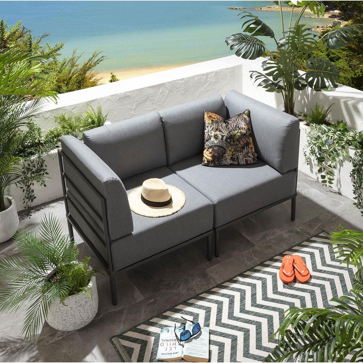 Experience the versatility of the Alfie outdoor modular sofa set, comprised of two pieces, it's a compact 144cm x 72cm modern garden sofa. Crafted with weather-resistant aluminium frames in an elegant grey finish and super-thick cushions, upholstered in premium grey fabric. The clever modular design is based on two key modules a corner and a middle section, effortlessly connected using provided clips to create a bespoke configuration at any size. The square modules, each measuring 72cm, simplify planning for your unique space, ensuring a perfect fit. The super-thick cushions, upholstered in premium grey fabric, provide unparalleled comfort at a convenient seat height of 44cm. Our Alfie sofa cushions feature zips for easy removal and cleaning, promoting longevity and easy maintenance. For prolonged durability, we recommend storing the cushions when the sofa is not in use. Assembling the frames is a straightforward process, requiring just a few bolts per module frame, and all the necessary tools are included. Additionally, for added convenience and an extended product life, weather protection covers can be purchased separately. W144cm D72cm H73cm 2 Piece Garden Sofa Set 2 Seater Sofa
