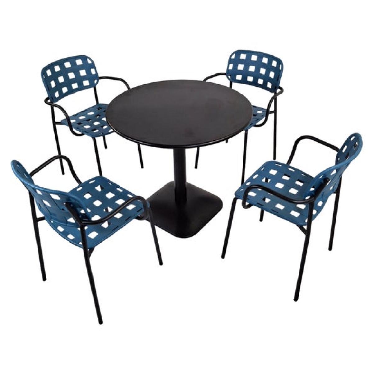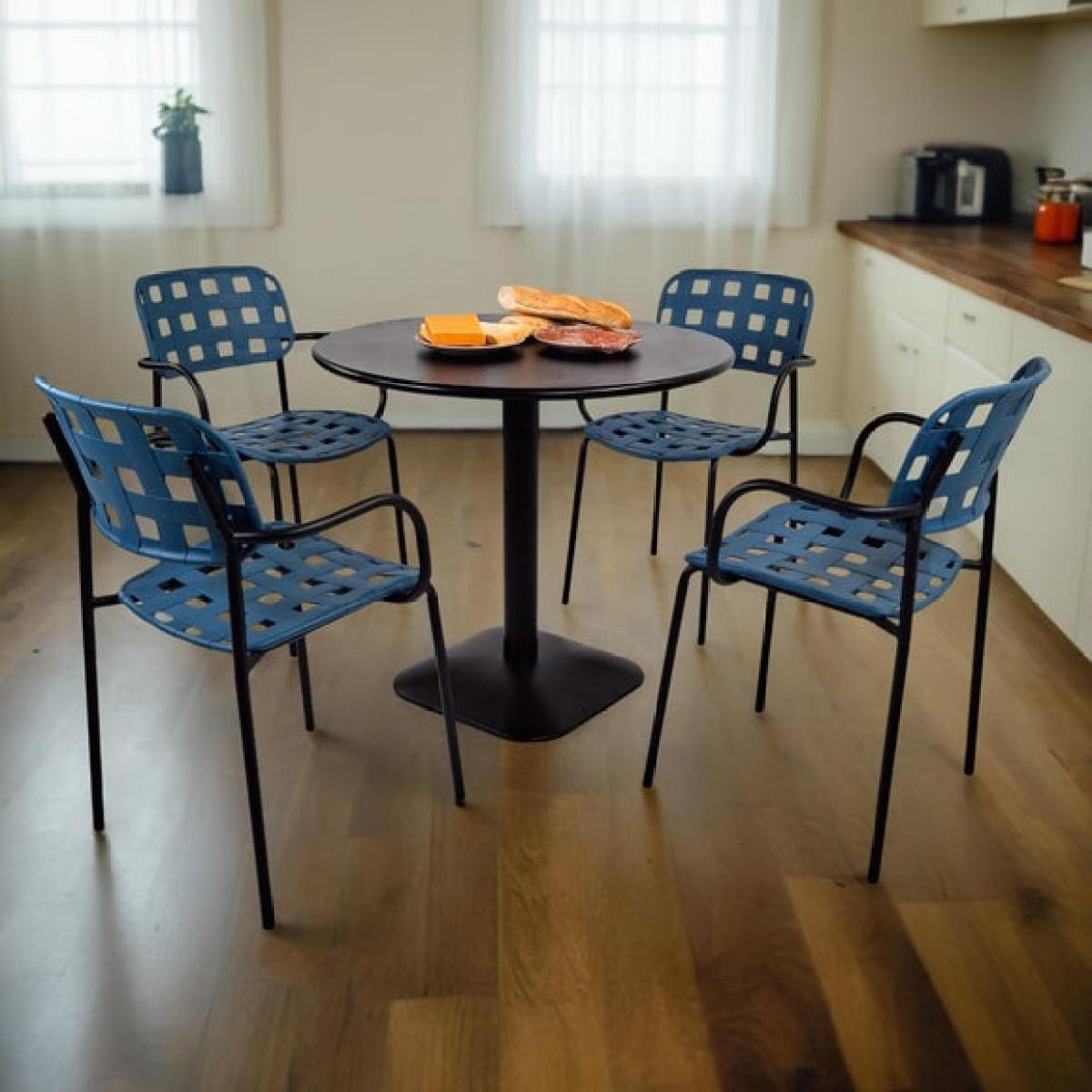 * Stylish black table * Sturdy pedestal base * Stackable chairs * Pop of petrol blue The Modura Albin Round Table with four Karin Armchairs brings a refined, modern look to your dining area, either indoors or out. The table’s matte black finish and minimalist design make it a stylish focal point, while its steel build and weighty base ensure reliable stability. The Karin chairs add a splash of colour with their bold petrol blue-black finish, giving the set a contemporary edge. Compact yet comfortable, it’s ideal for smaller spaces. Built to last and easy to maintain, it's a fresh, eye-catching choice for everyday dining.