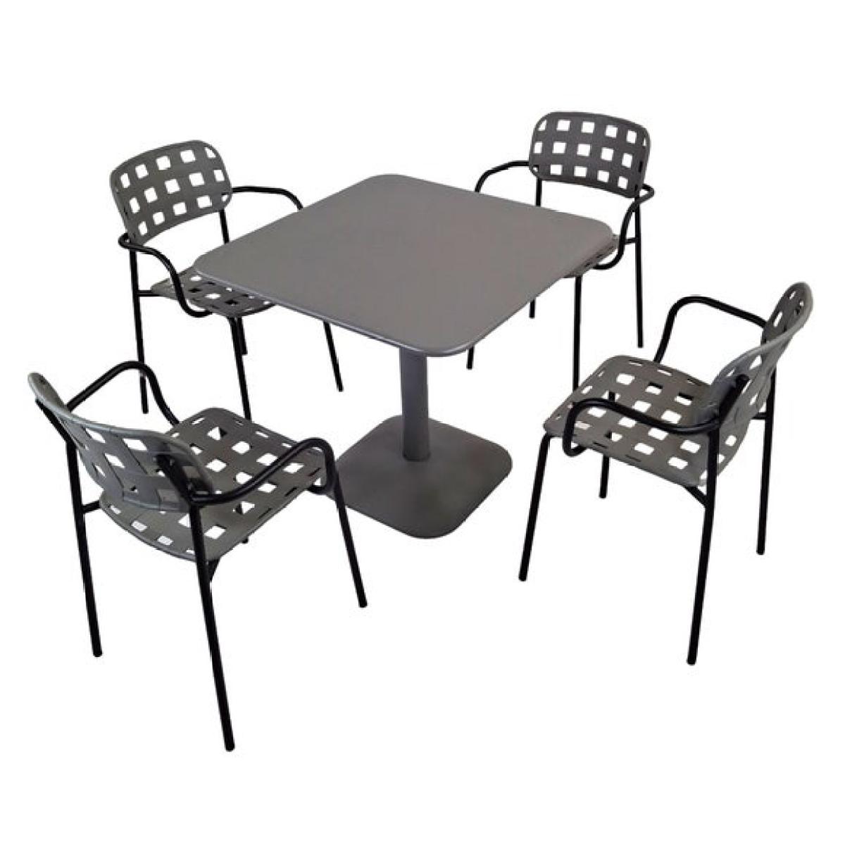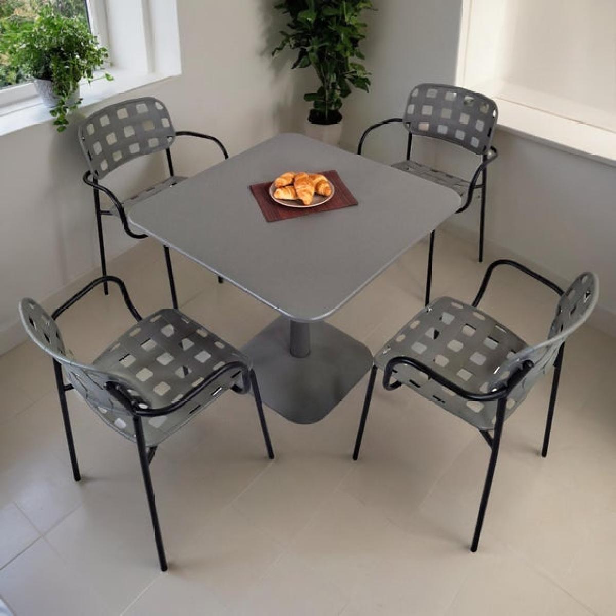 * Table in a choice of black or nickel grey * Sturdy steel frame * 4 stackable Karin armchairs * Nickel grey and black colour The Modura Albin Square Table with four Karin Armchairs brings a sleek, modern edge to your dining space. Available in matte black or nickel grey, the Albin table’s steel frame offers both timeless style and solid stability. The Karin chairs, made from textured polypropylene and fibreglass, are built to last and finished in a chic mix of nickel grey and black. Compact yet comfortable, it’s ideal for everything from casual breakfasts to evening get-togethers. A stylish solution for smaller spaces and designed for everyday use with a contemporary twist.