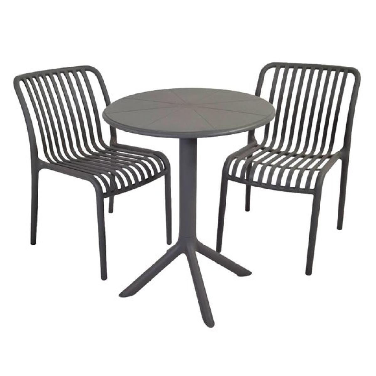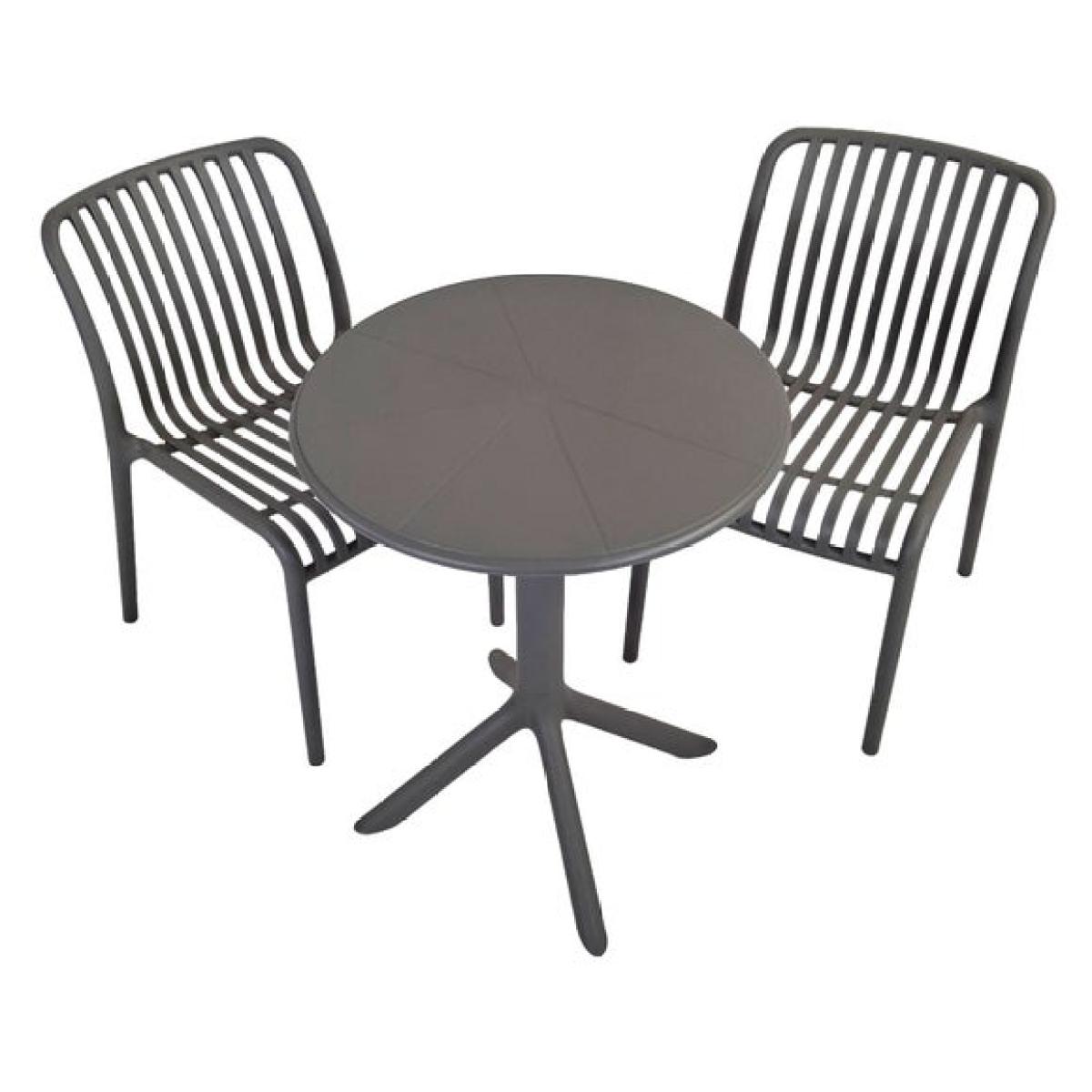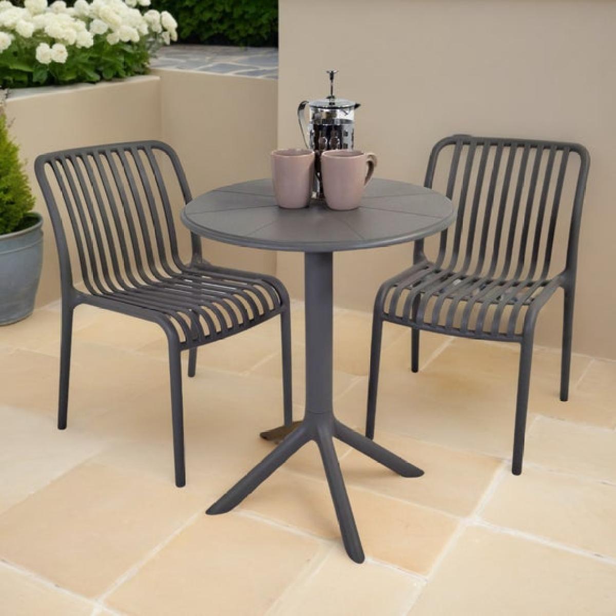 * Pedestal table * 60cm diameter * 2 stackable chairs * Nickel grey colour The Modura Anders Round Bistro Table with two Mia Bistro Chairs brings sleek simplicity to indoor and outdoor spaces alike. Finished in modern nickel grey, the set blends effortlessly into contemporary settings. The Anders table is perfectly sized for two, ideal for everything from morning coffee to evening chats. Mia chairs are lightweight, stackable, and easy to move, making them practical without compromising on style. Made from durable polypropylene with fibreglass, the set stands up to daily use and changing weather. A smart, space-saving choice for relaxed, everyday living.