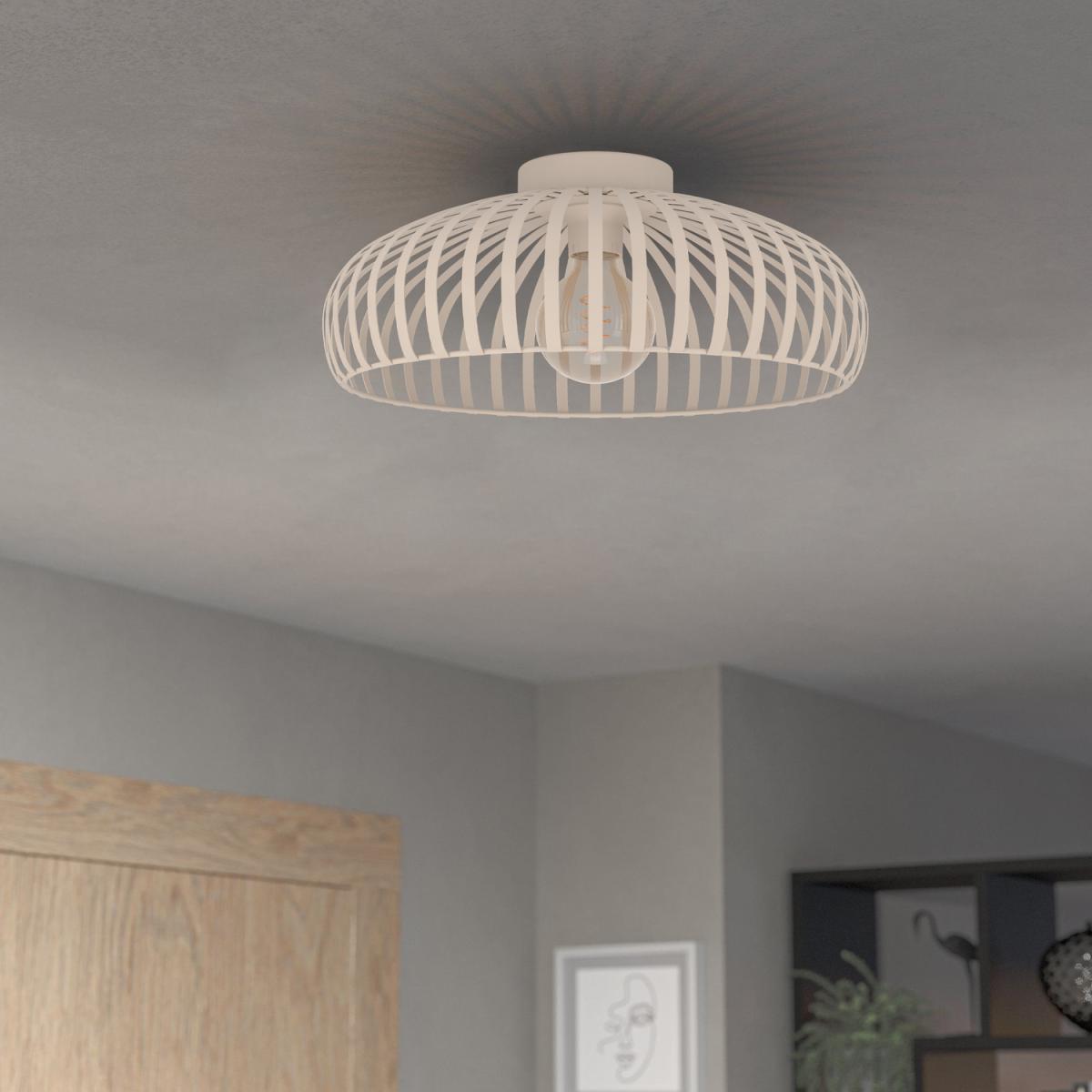 The EGLO Mogano 3 ceiling light, with its minimalist, caged design crafted from sandy steel, offers a modern industrial look. Its versatile style seamlessly blends with contemporary decor trends, making it an ideal addition to any space, be it the kitchen, living room, bedroom, hallway, or dining room. The open cage design provides ample light, creating a warm and inviting atmosphere that will make you feel right at home. This ceiling light requires 1 x E27 lightbulbs (not included), allowing you to customise the brightness to suit your needs. Illuminate your home with this chic and versatile lighting solution.