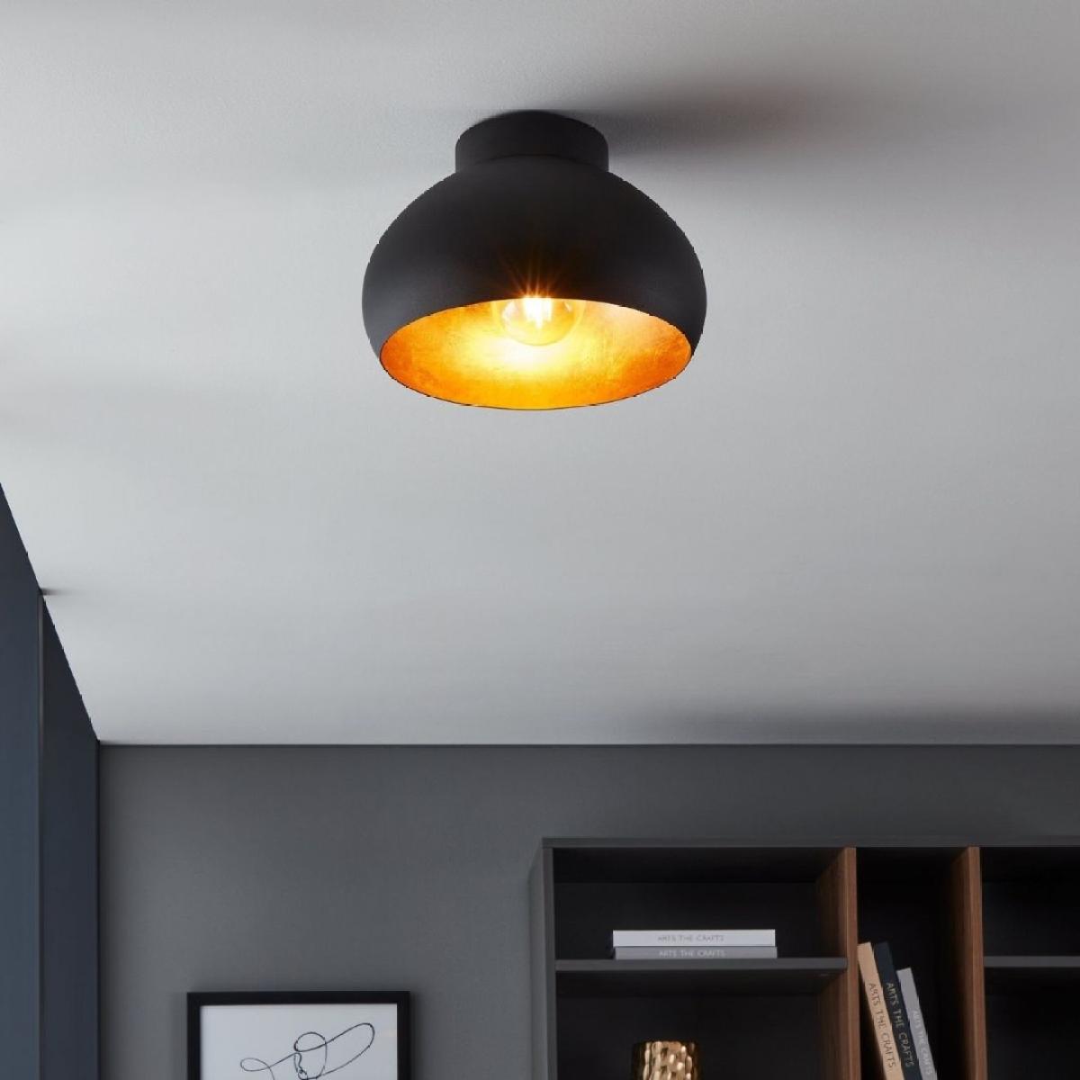 Mogano 1-light flush ceiling light, featuring a round, black metal lampshade with a gold-coloured inner finish. The Mogano 1-light flush ceiling light offers a sleek, contemporary look with a hint of warmth. It features a smooth, bowl-shaped metal lampshade in a matte black finish, contrasted by a rich gold-coloured inner that reflects a soft, inviting glow when lit. Its minimalist flush design makes it ideal for lower ceilings or compact spaces, while the bold black-and-gold pairing adds a touch of modern sophistication. Perfect for hallways, bedrooms or dining areas where understated elegance is key.