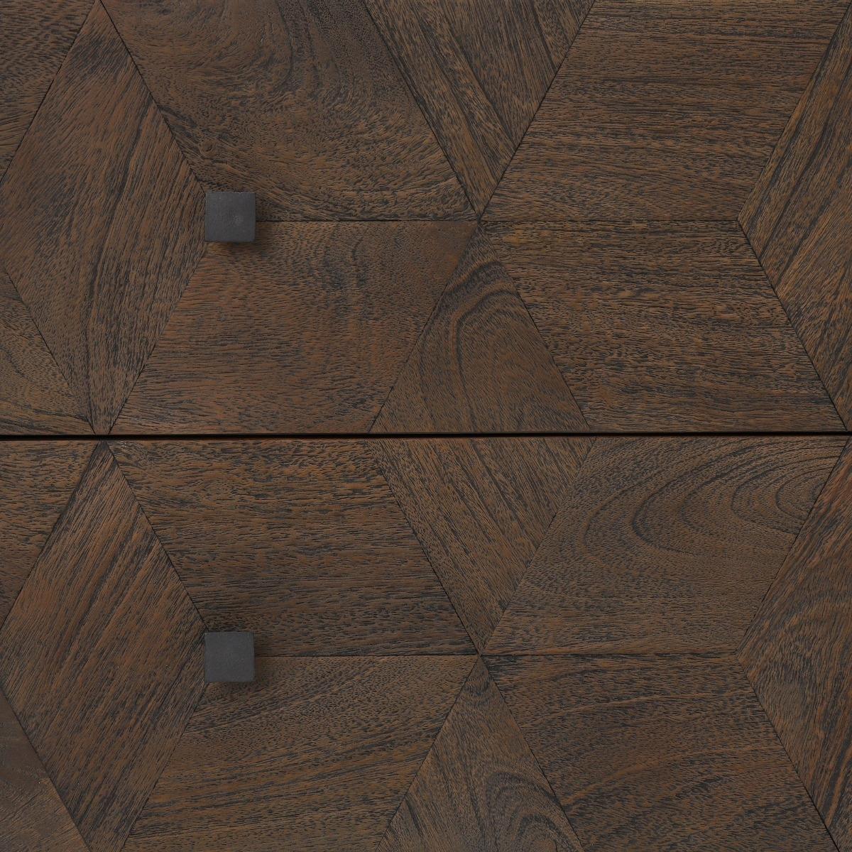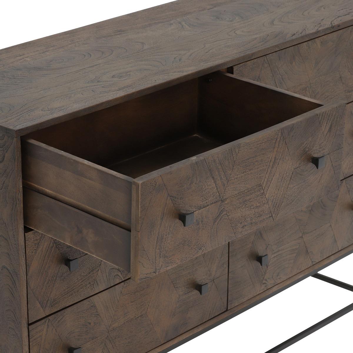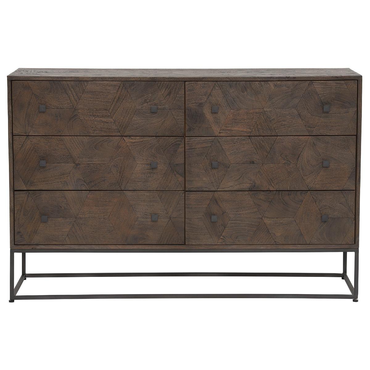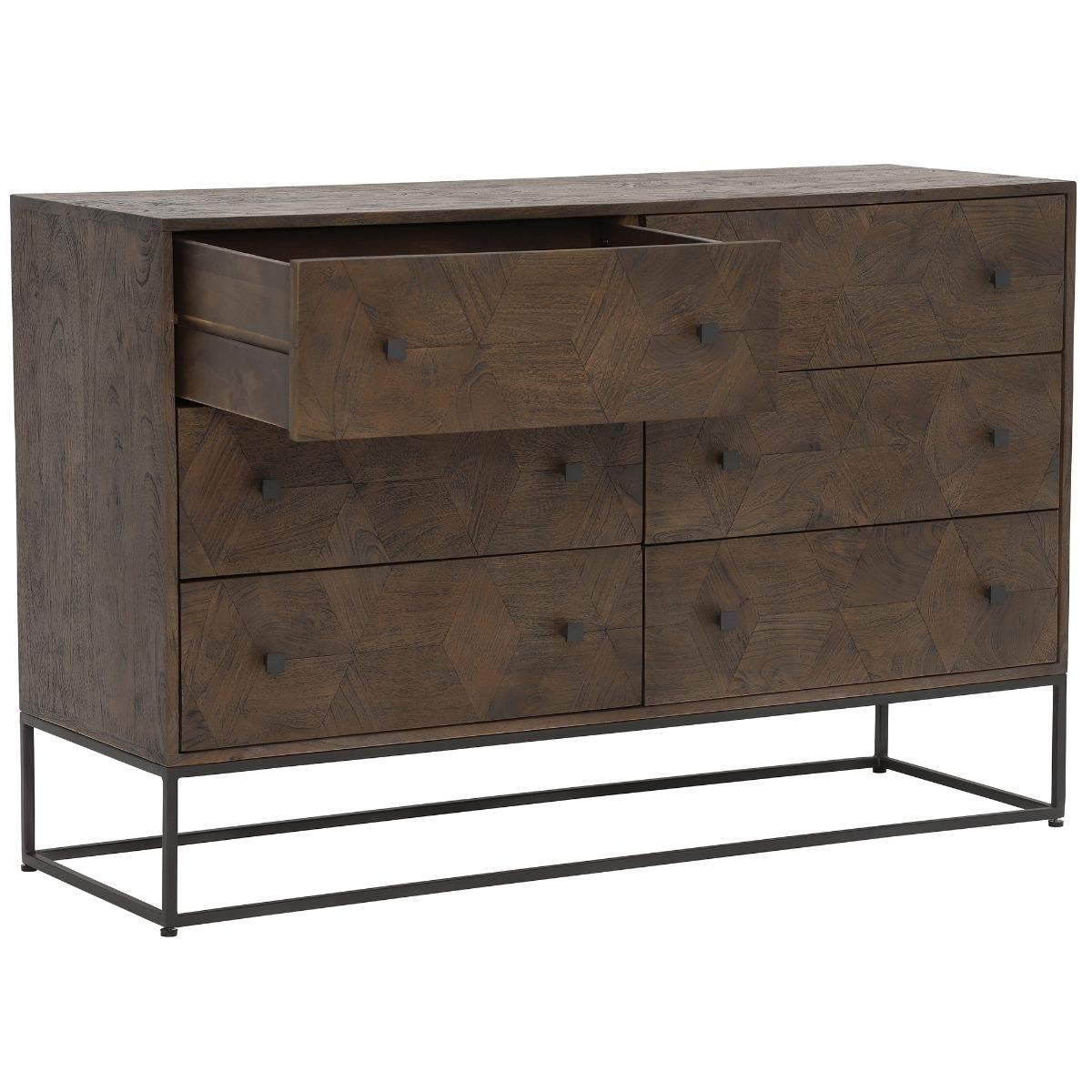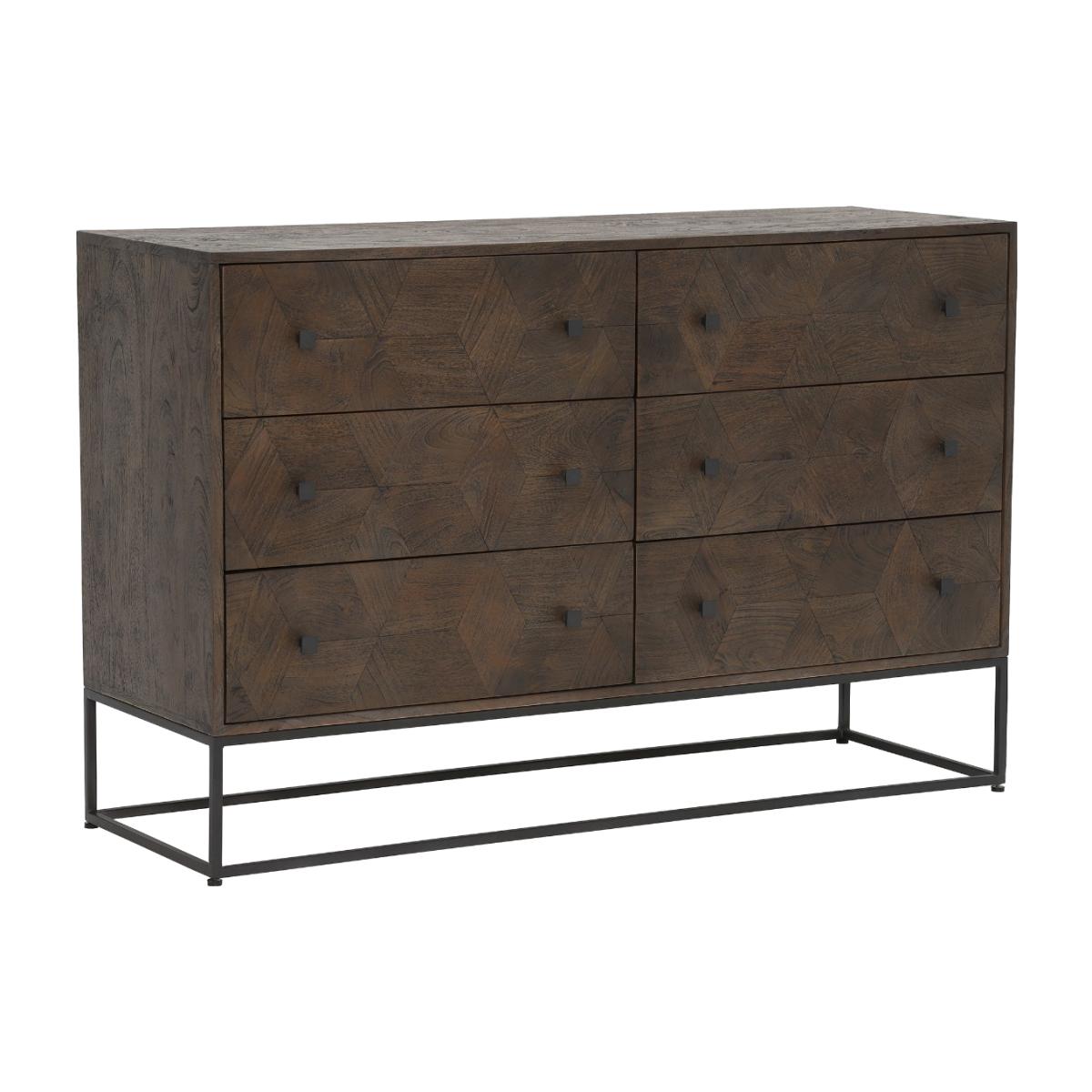 Design. With an abundance of space for clothing, accessories and more, the Mojave 6 Drawer Chest will keep your space organised and tidy, ensuring every item has a rightful place. The square drawer handles and angular metal feet add to its contemporary appearance, complimenting the stunning weathered teak wood perfectly. The natural grain and cubed pattern to the front of the drawers gives the Mojave 6 Drawer Chest its own unique character.